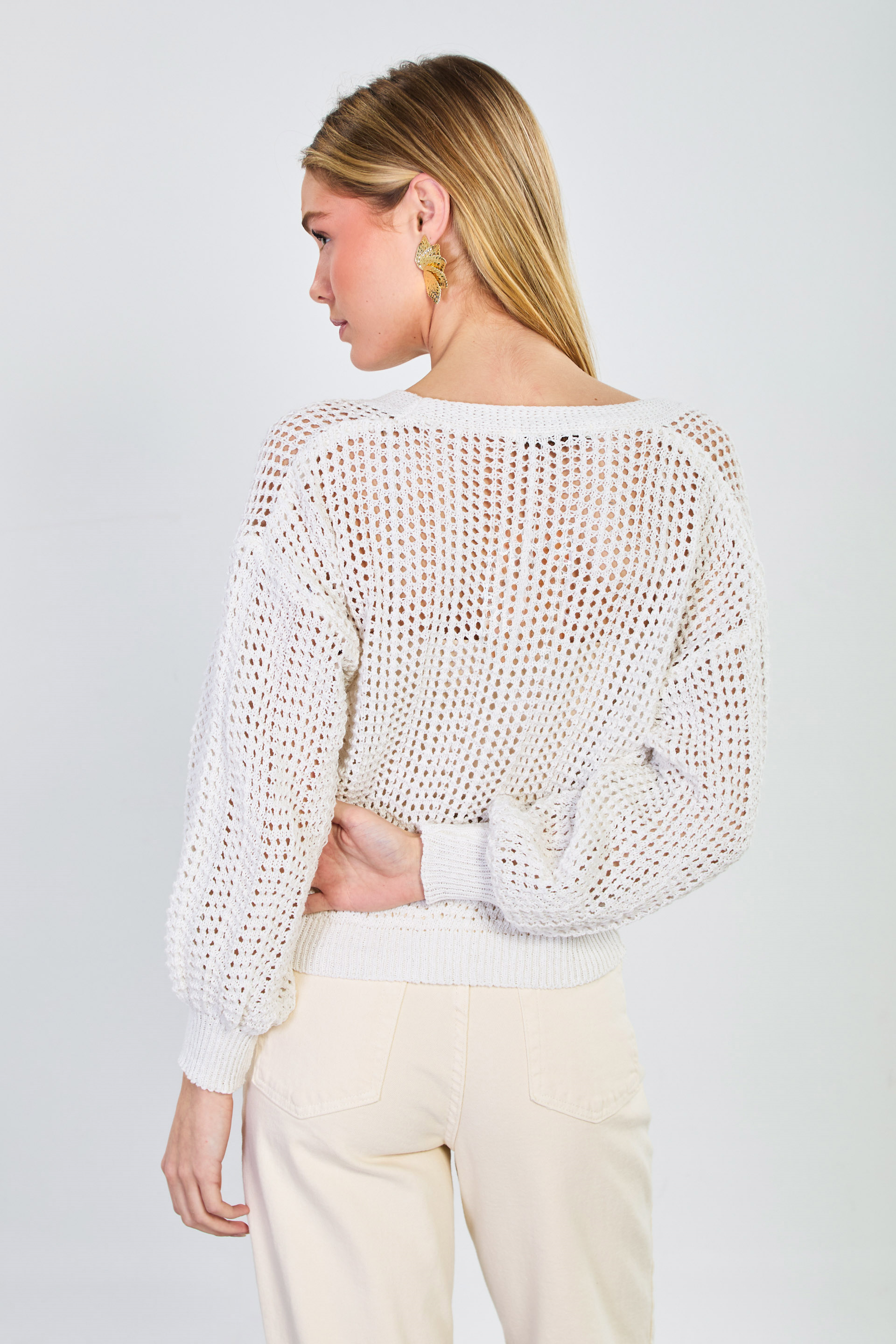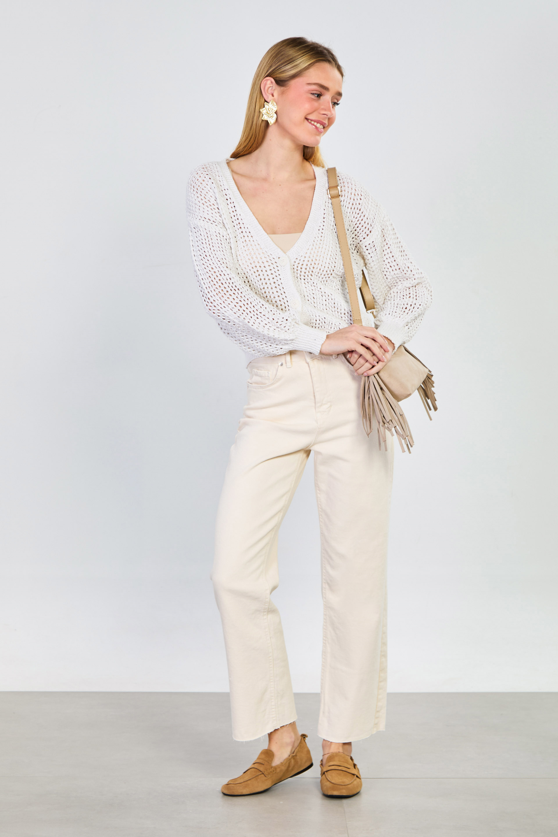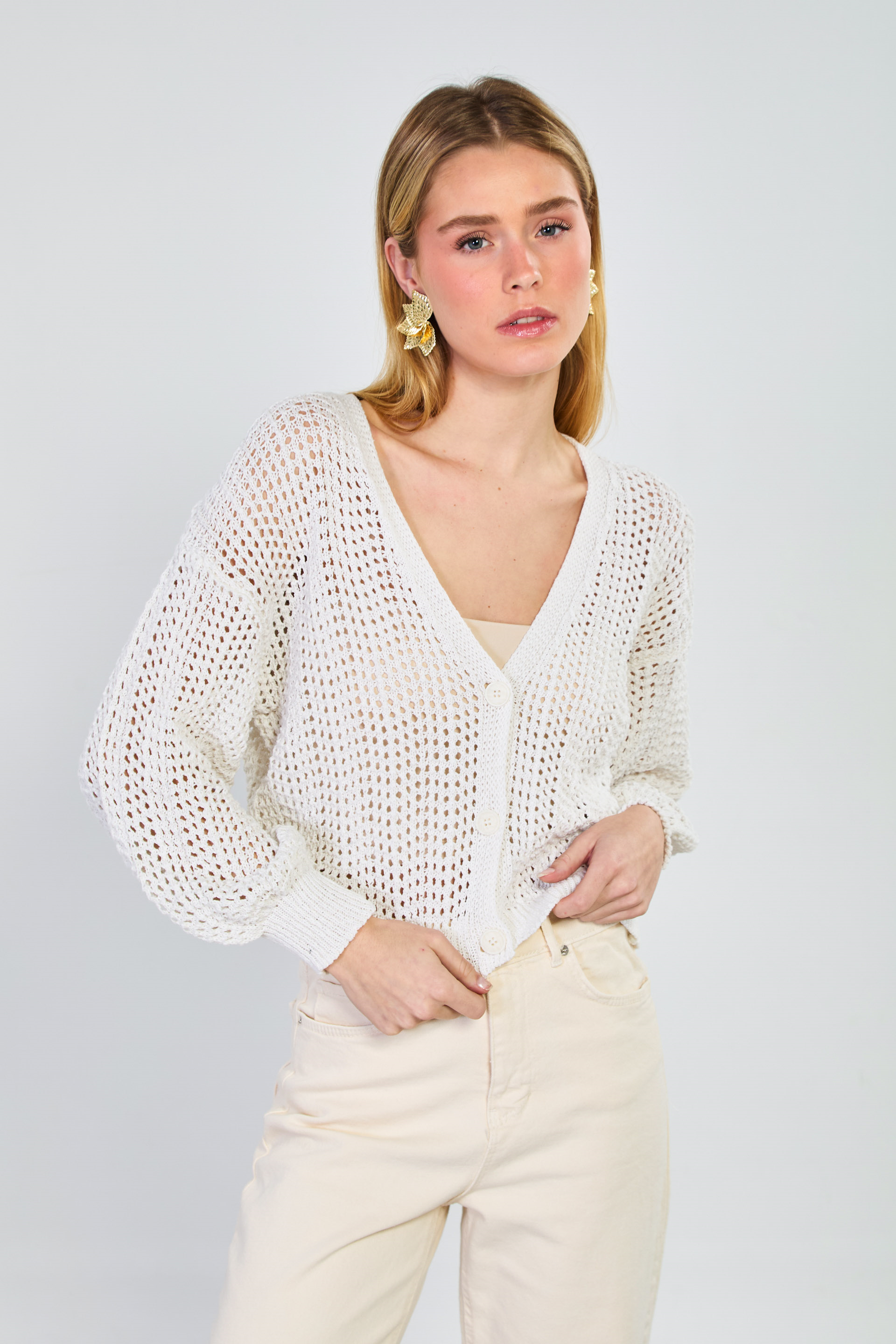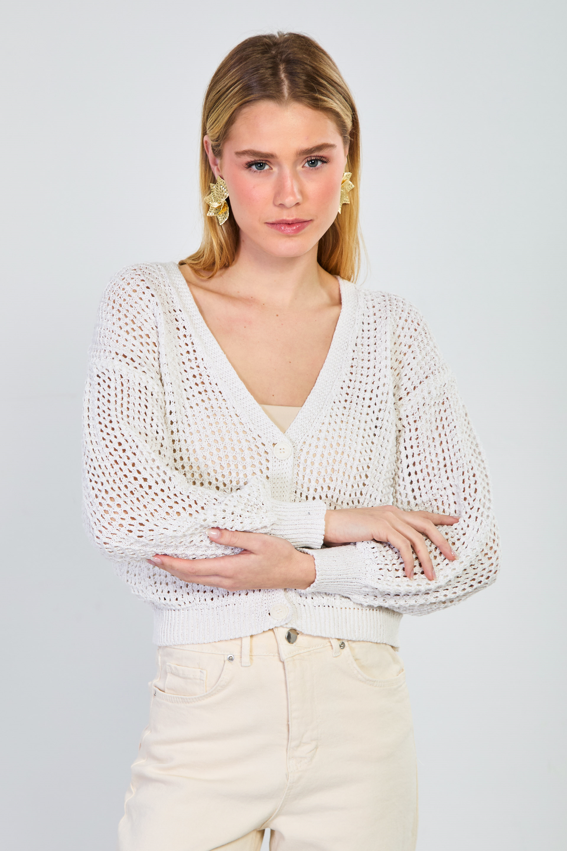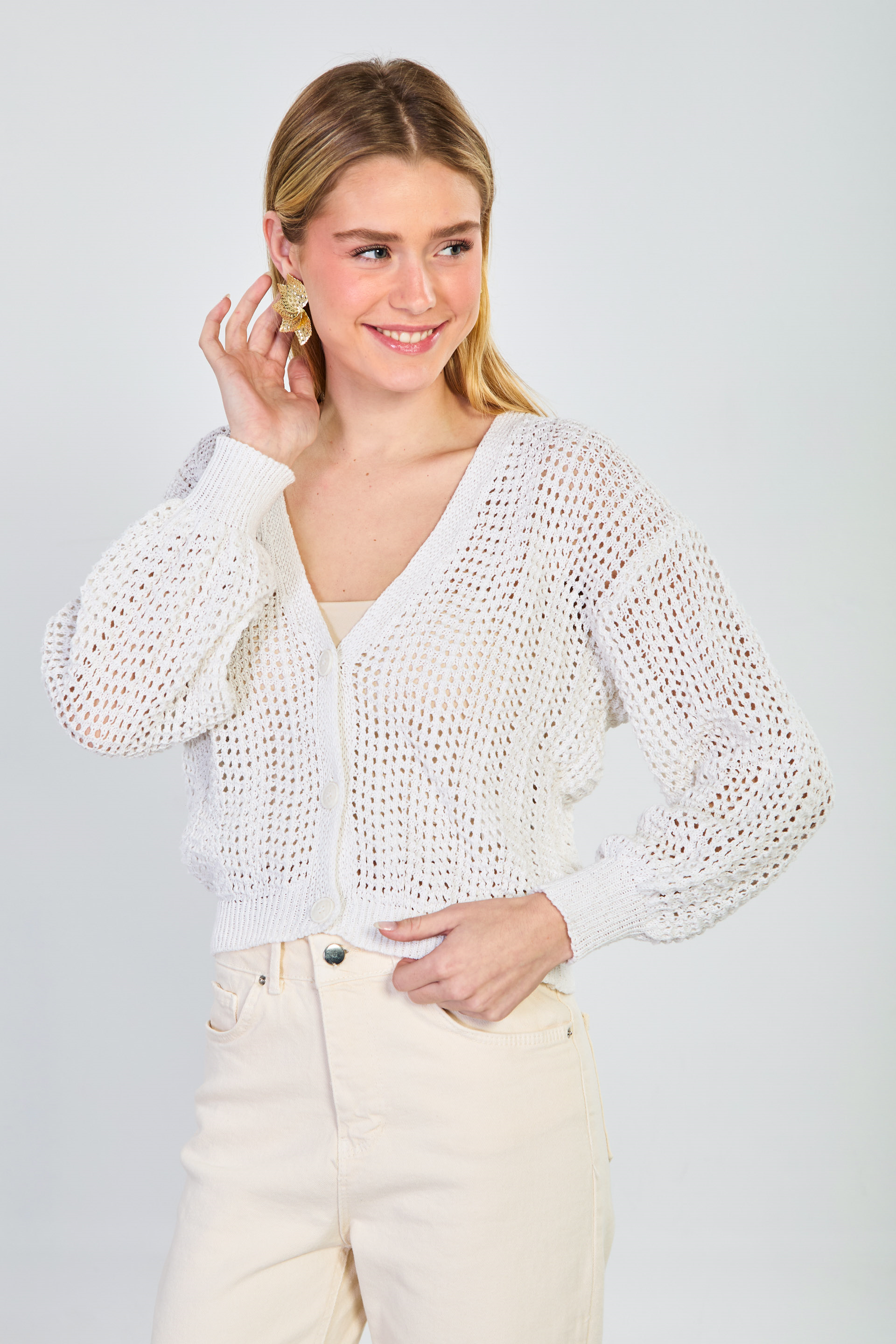 Kadın 3 Düğmeli Ajurlu Hırka - Natural
