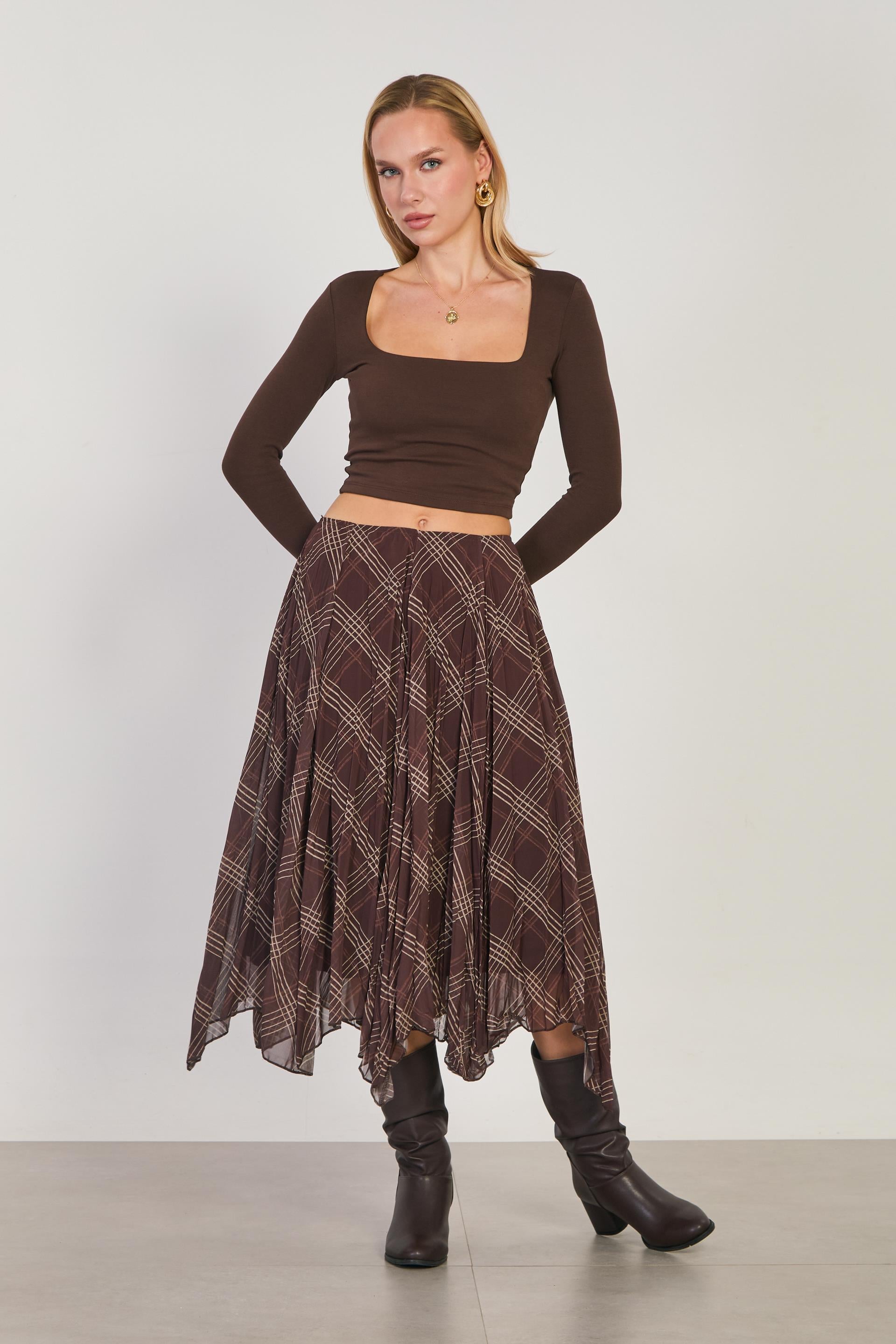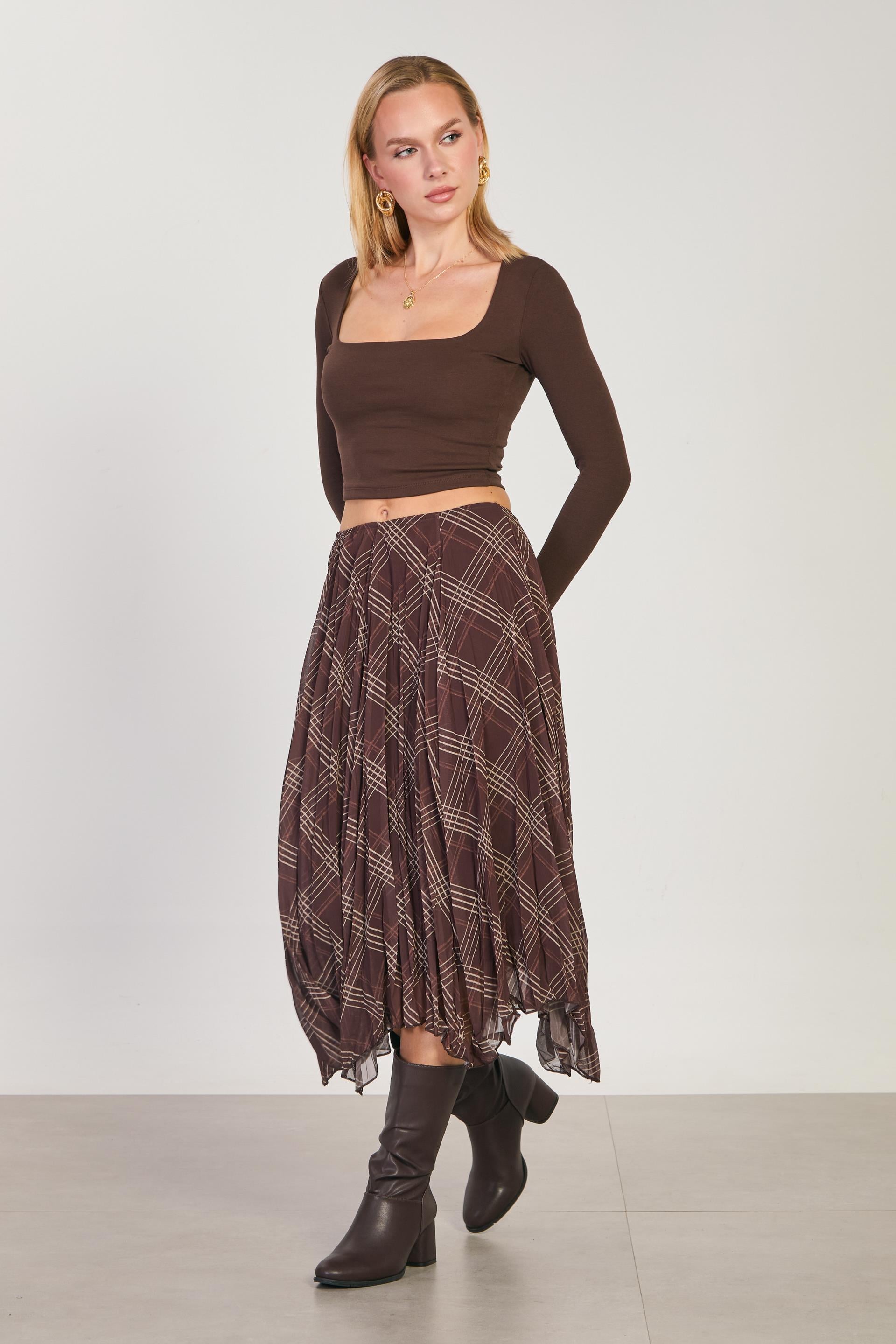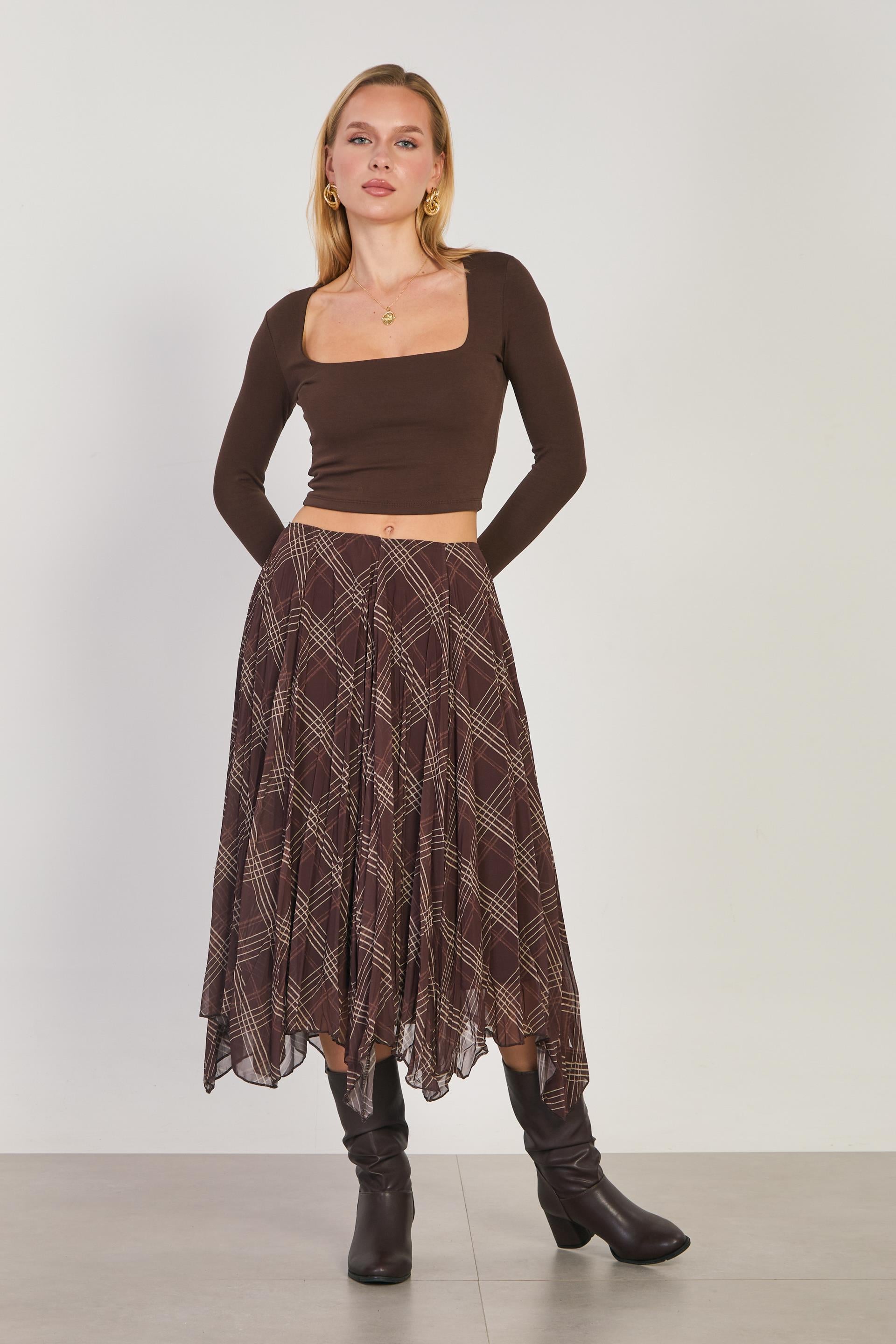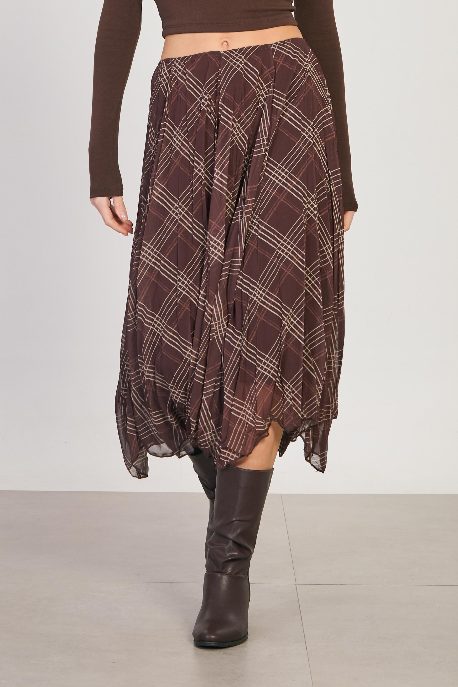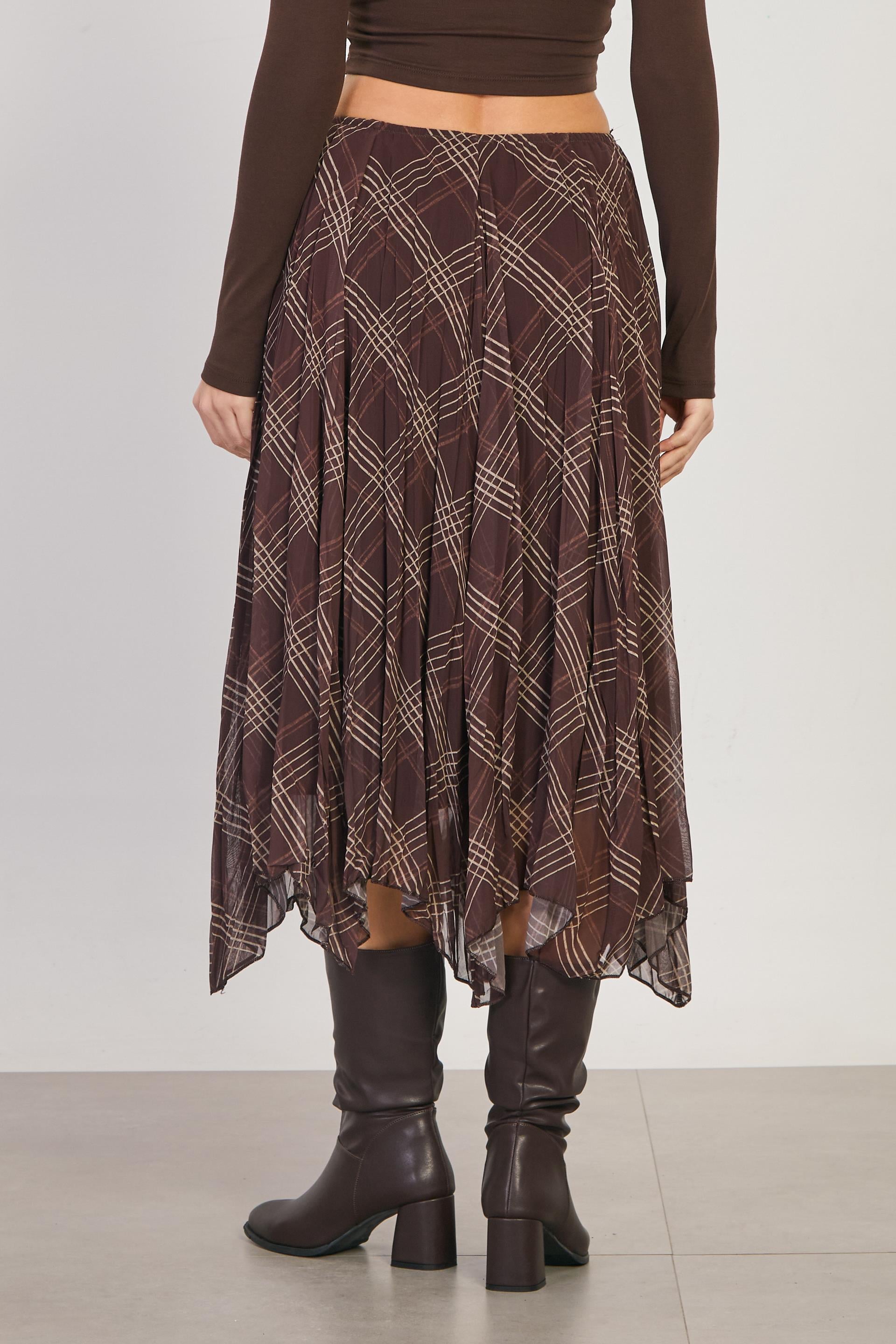Kadın Asimetrik Kesim Ekose Etek - Kahve