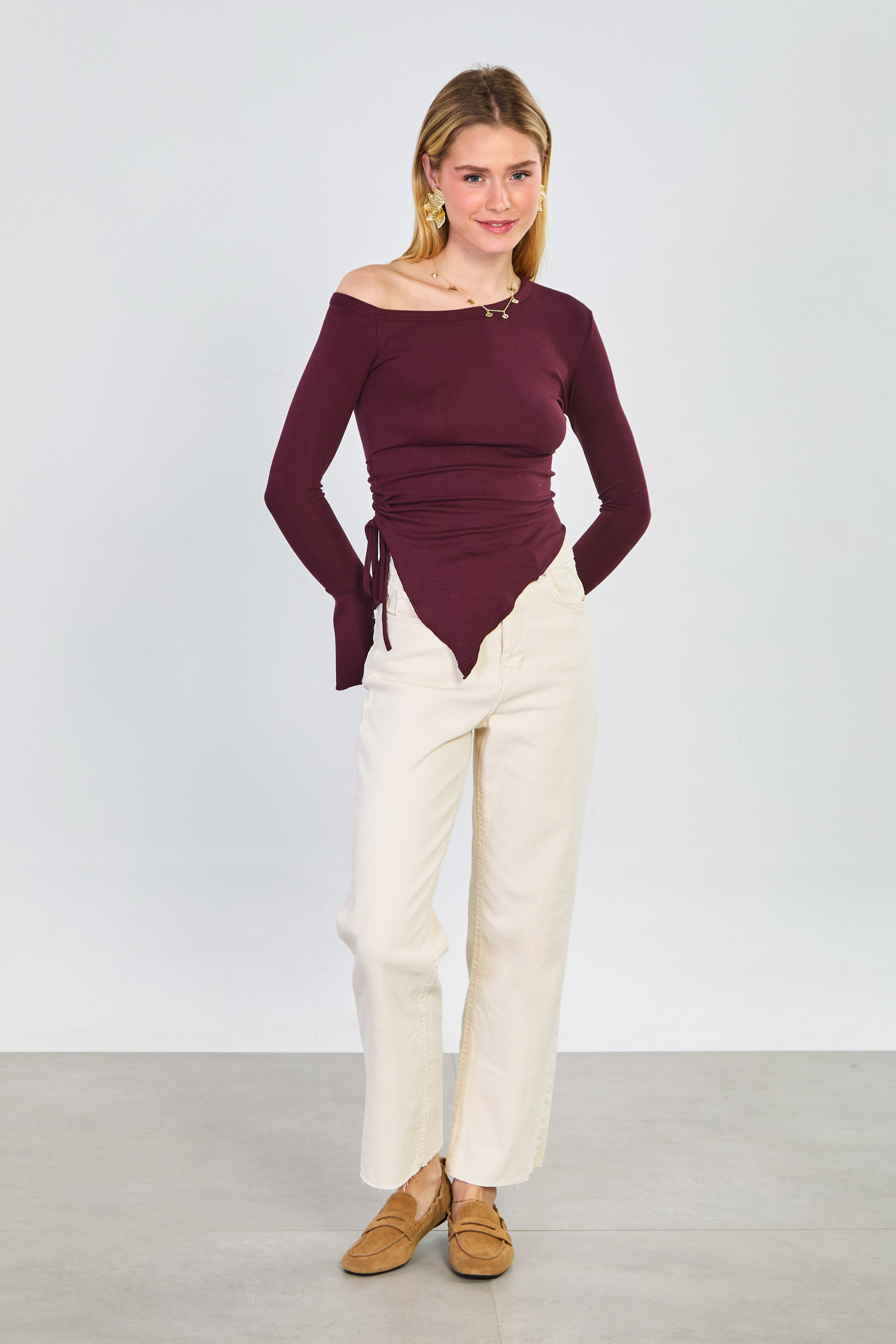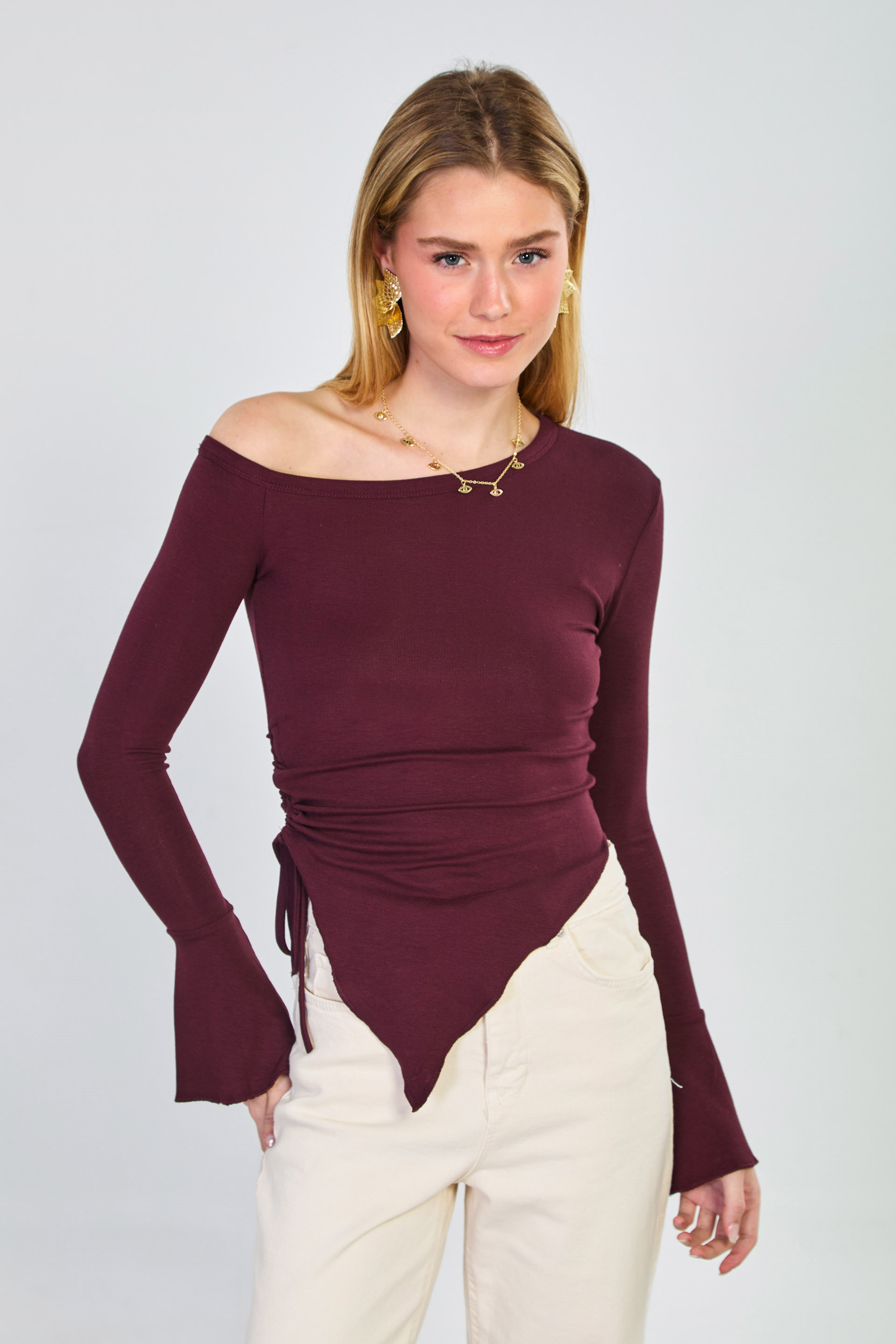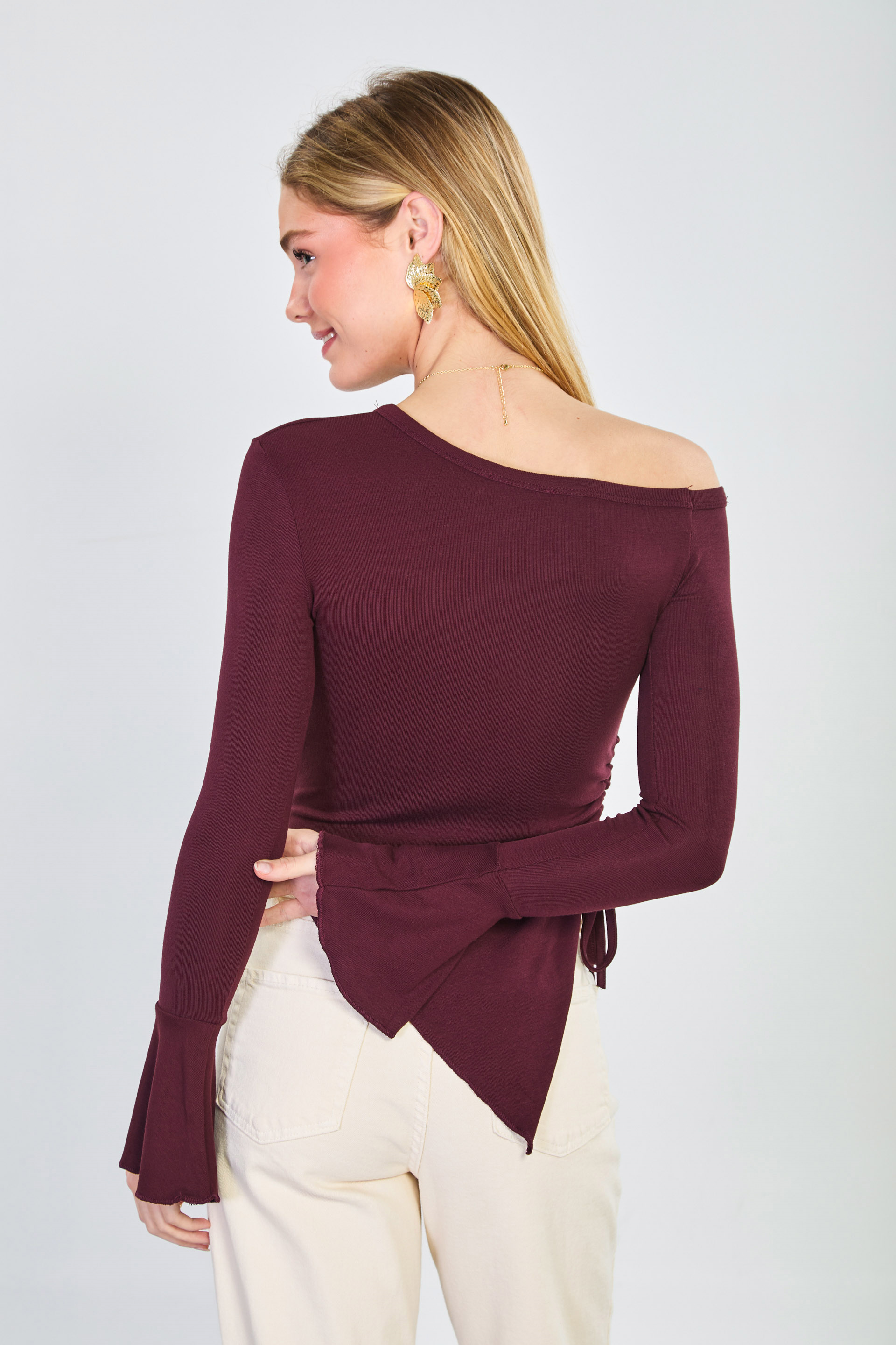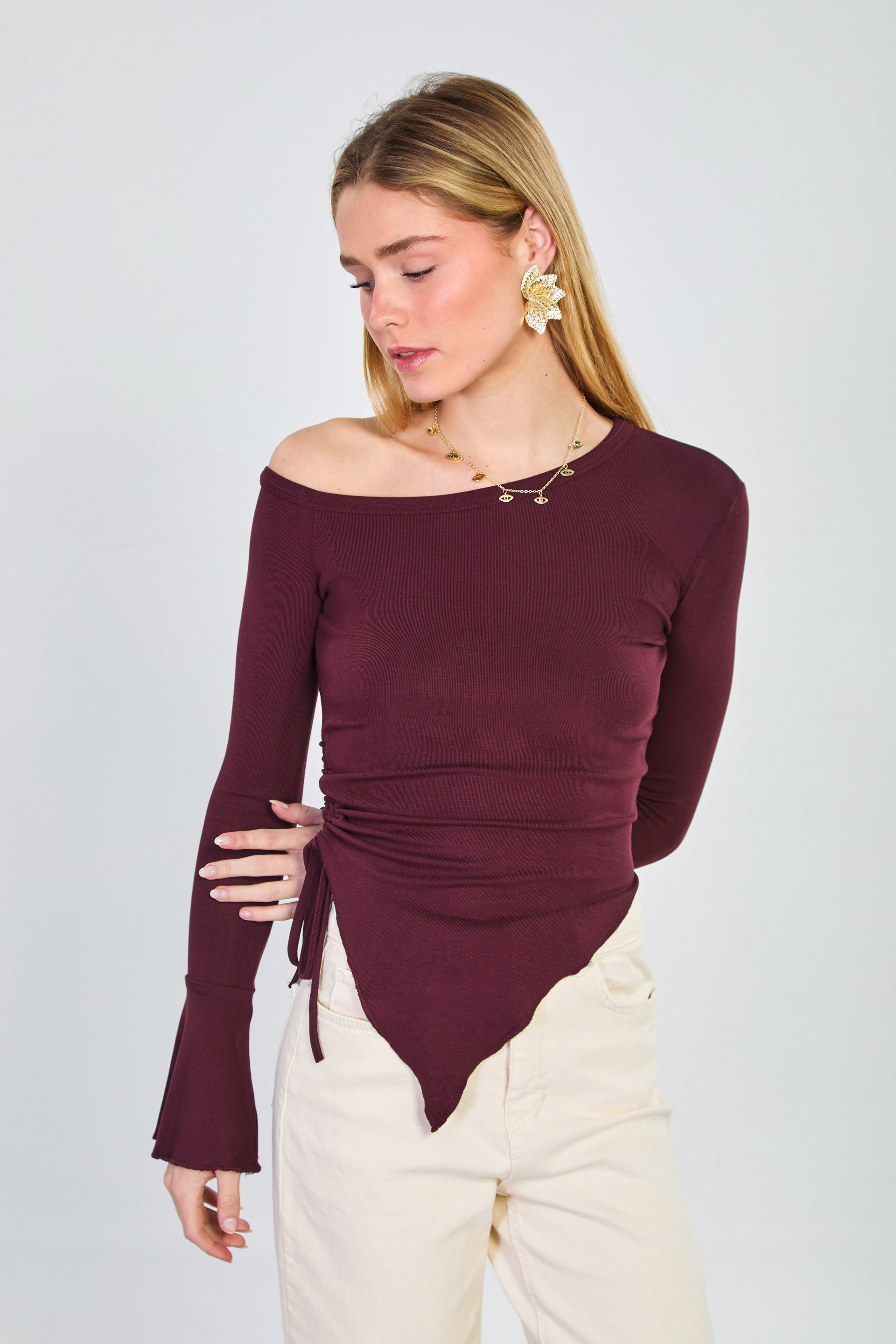 Kadın Asimetrik Kesim Omuz Dekolteli Bluz - Mürdüm