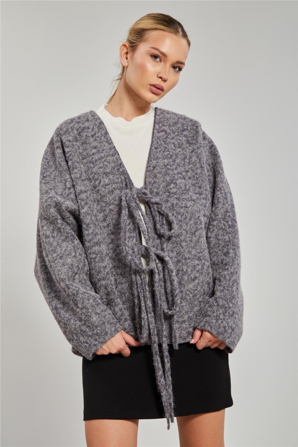 Bağlamalı Oversize Kaşe Ceket - Füme