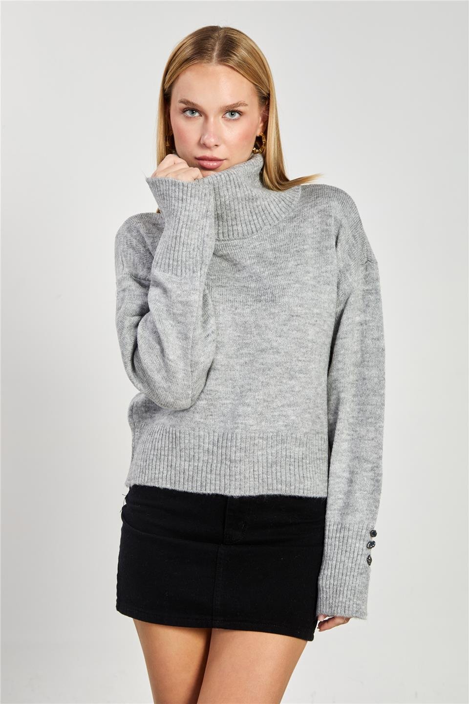 Kadın Balıkçı Yaka Kolu Düğmeli Triko Kazak - Açık Gri