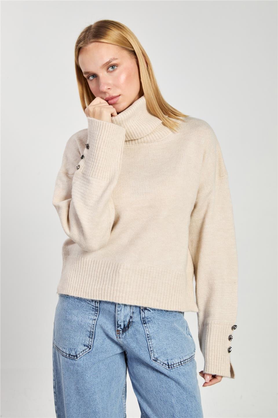 Kadın Balıkçı Yaka Kolu Düğmeli Triko Kazak - Taş Rengi