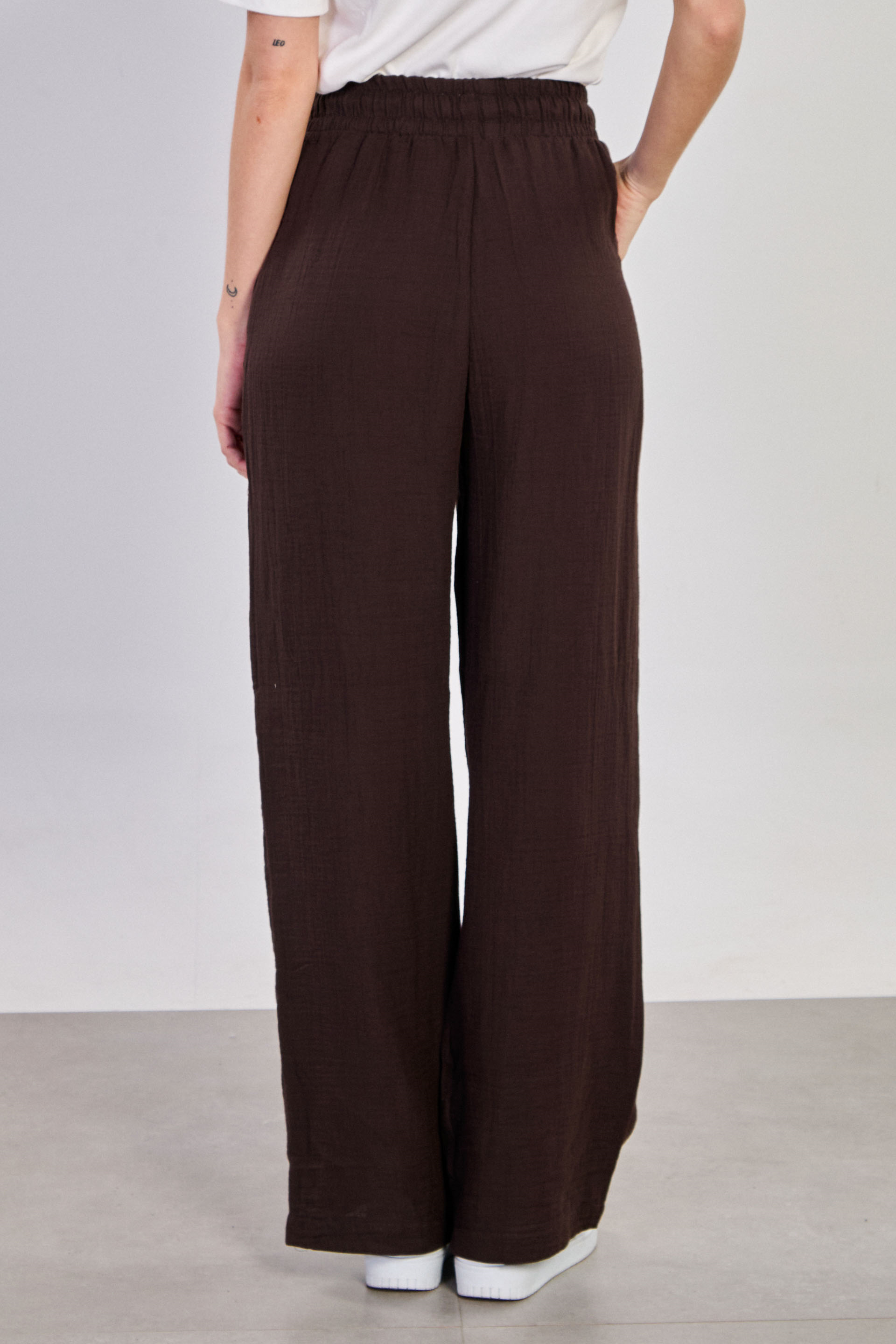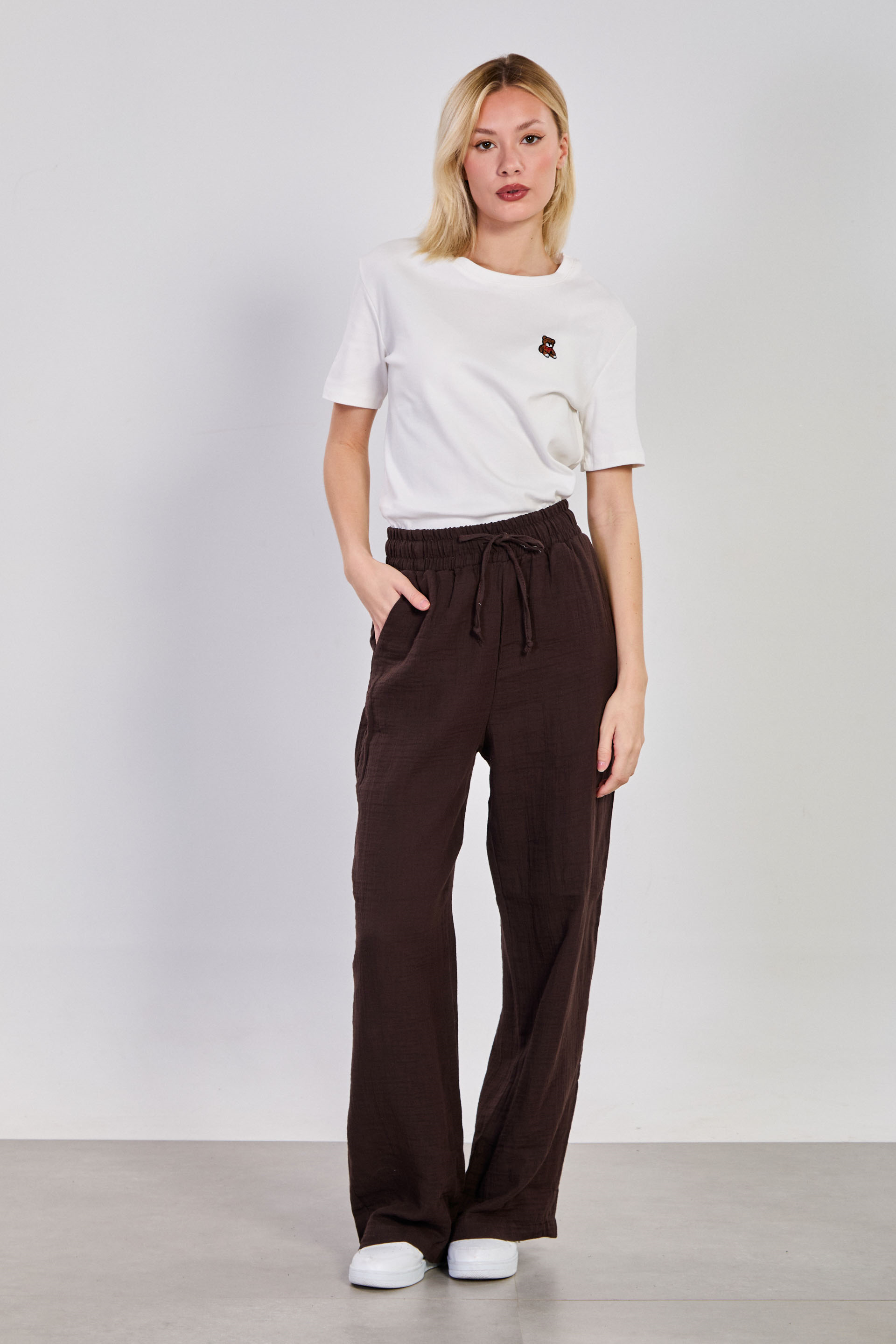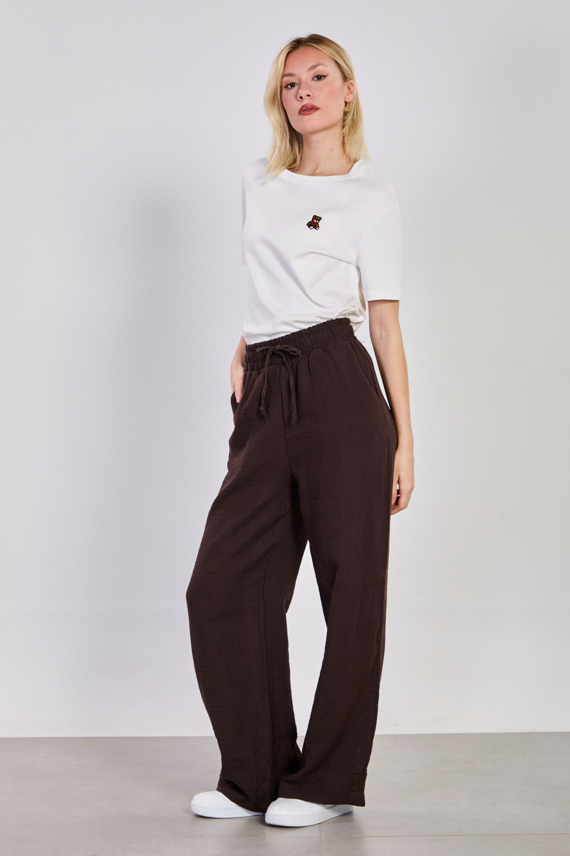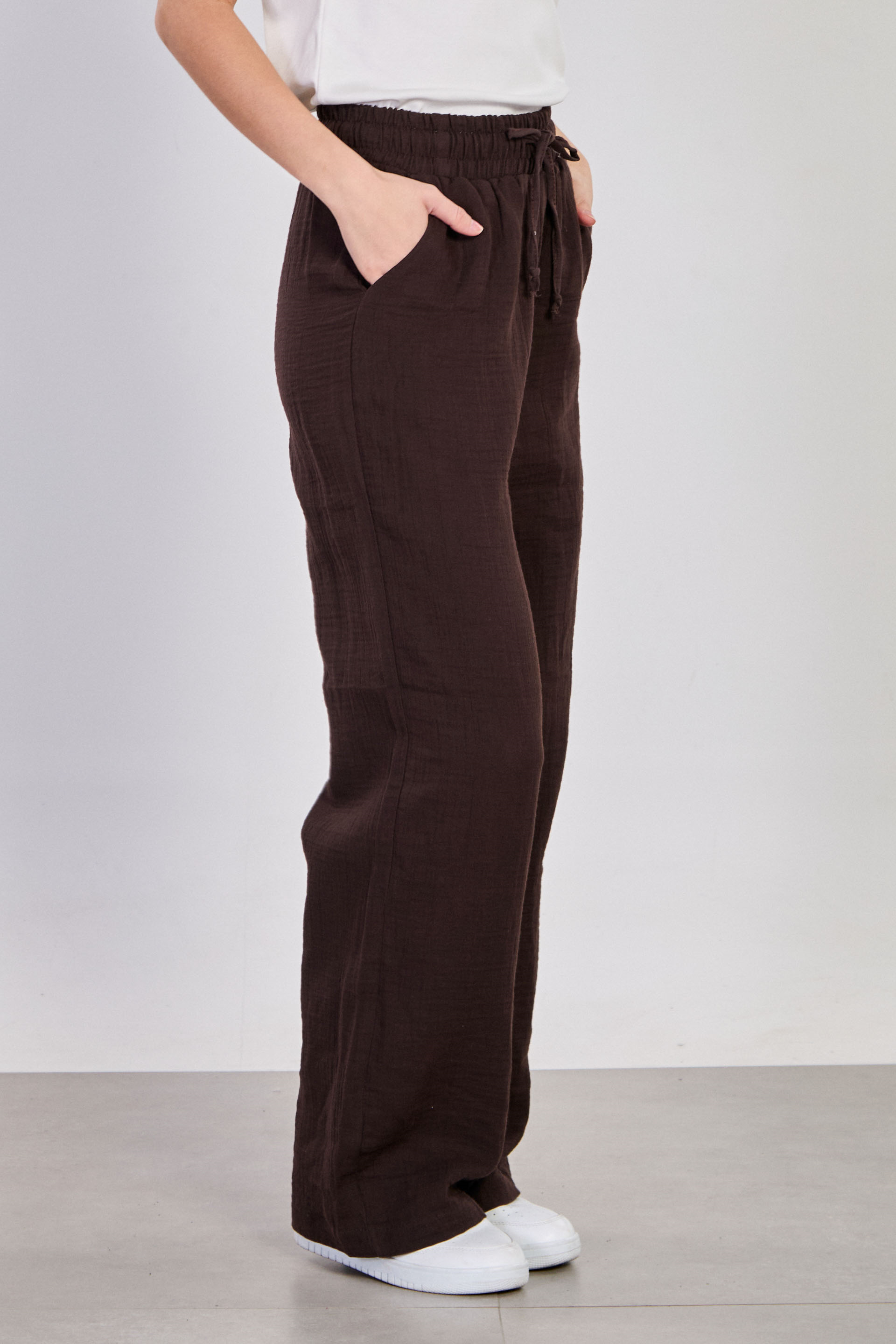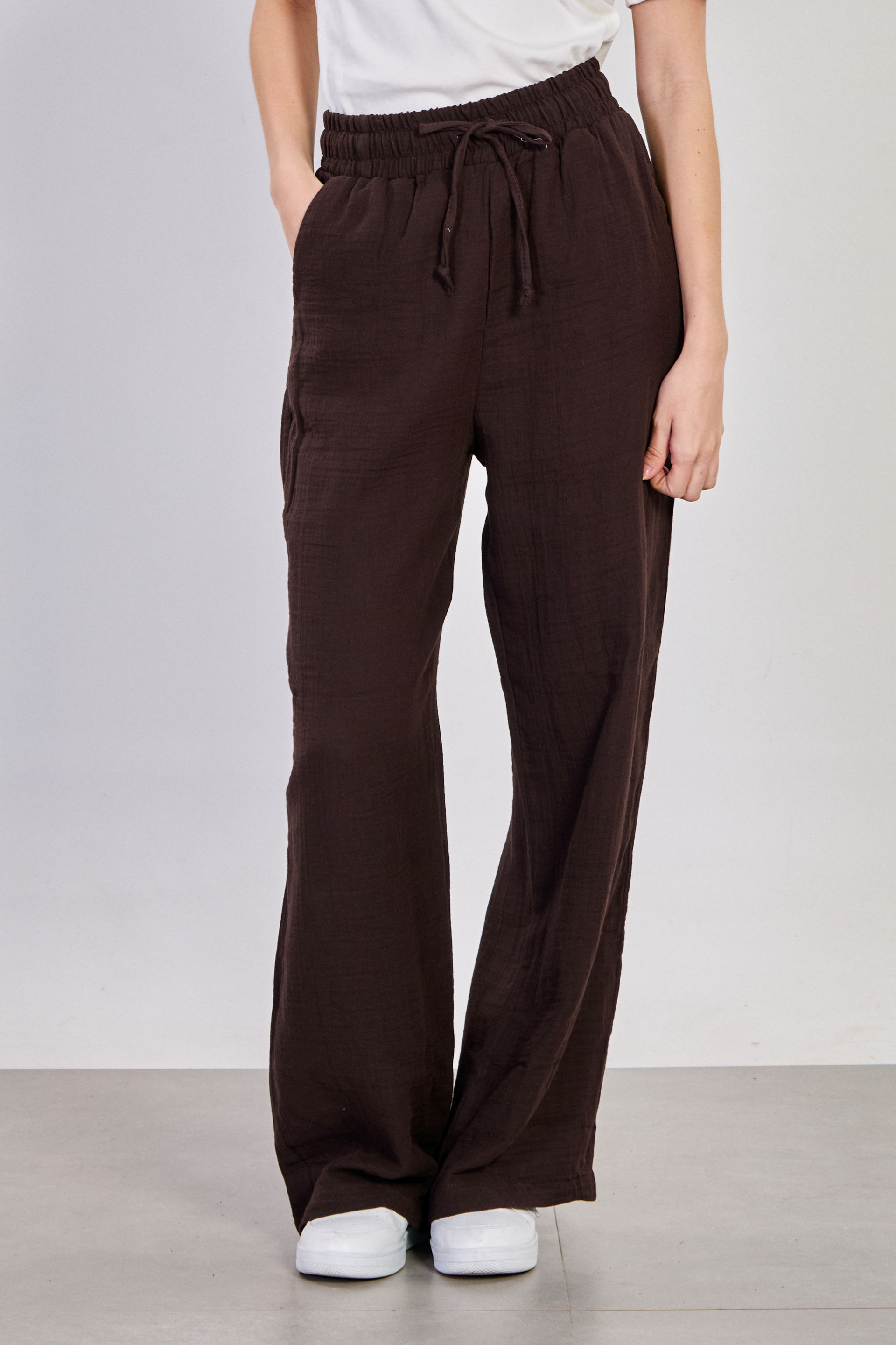 Kadın Bel Bağlamalı Pamuklu Bol Pantolon - Kahve