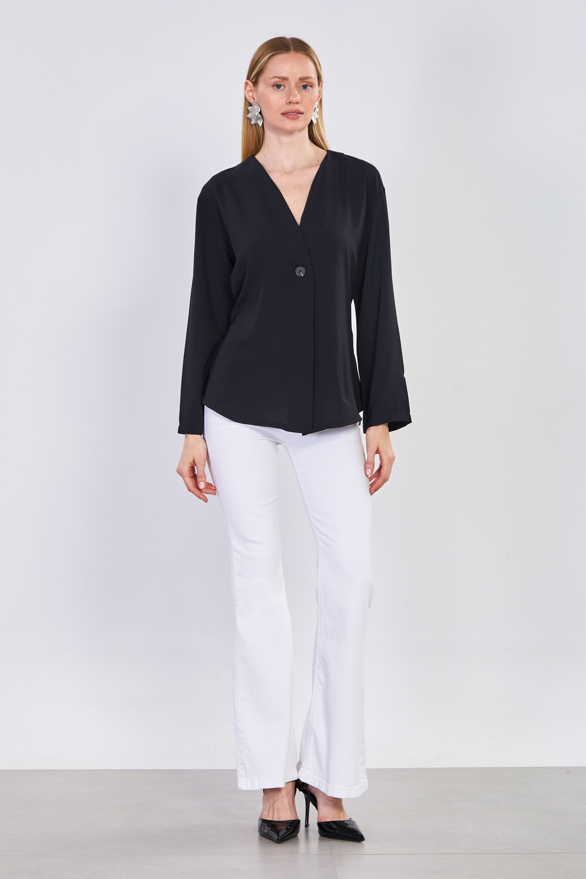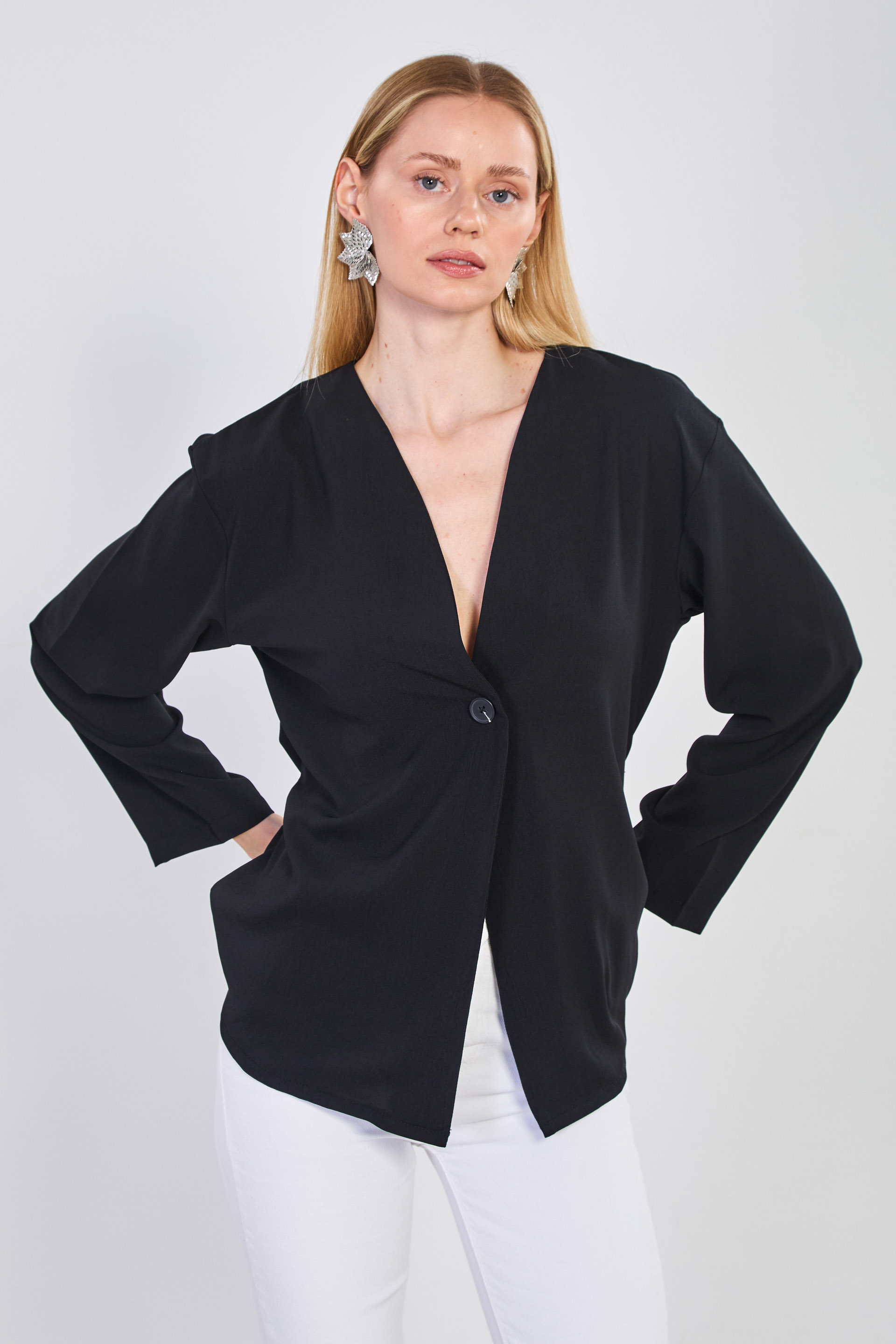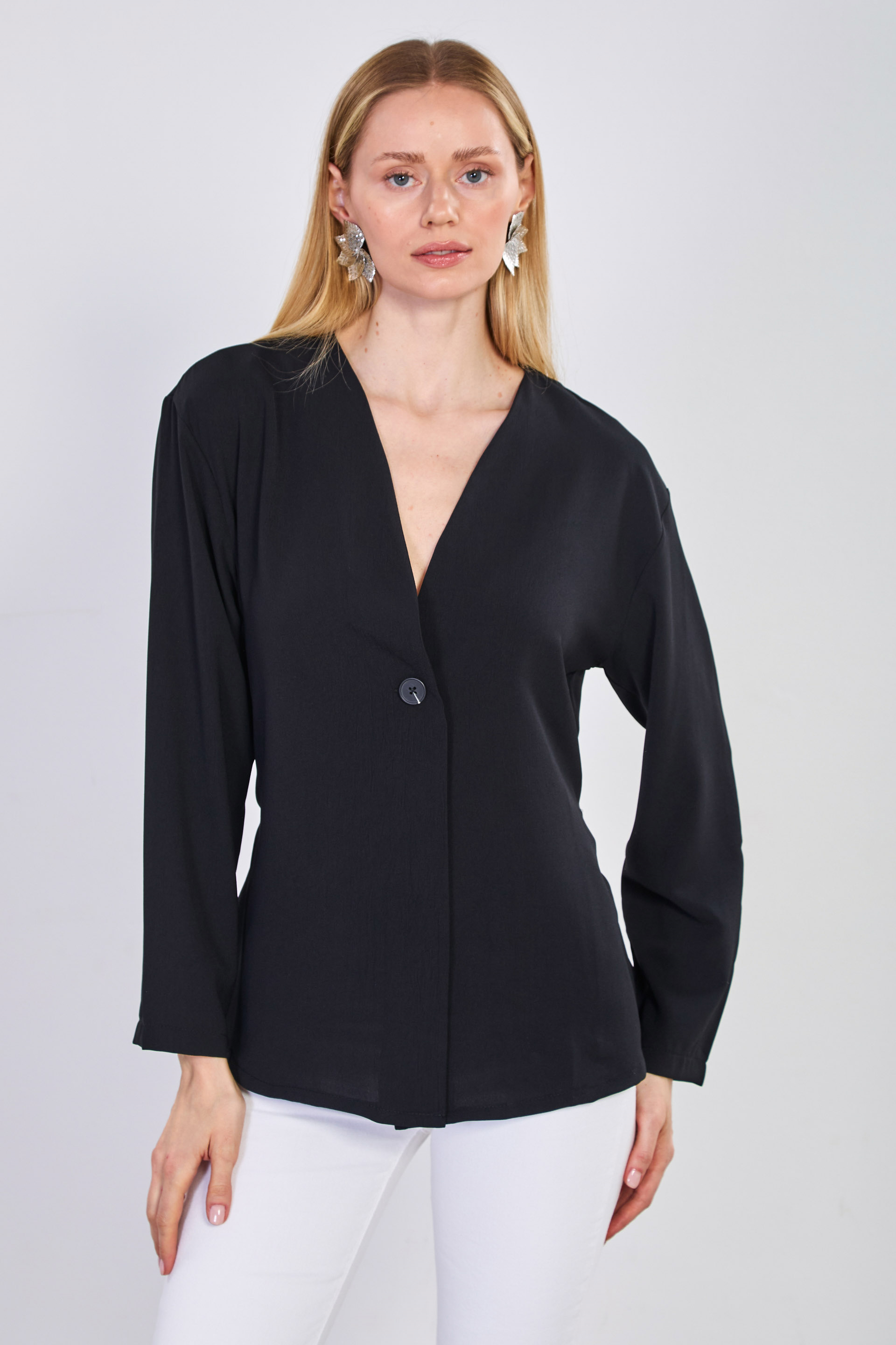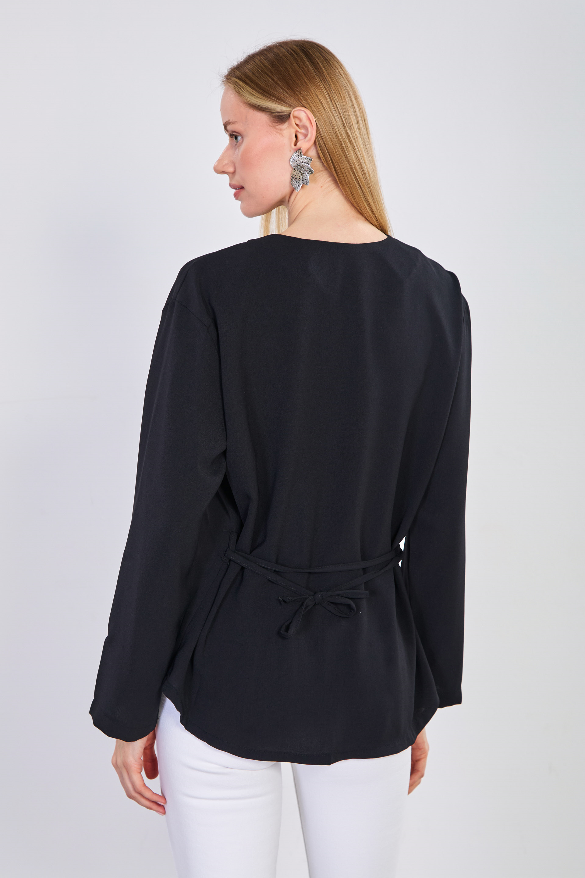 Kadın Beli Bağlamalı Tek Düğmeli Kimono - Siyah