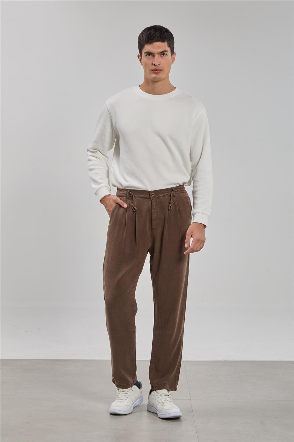 Erkek Beli Bağlamalı Tensel Pantolon - Kahve
