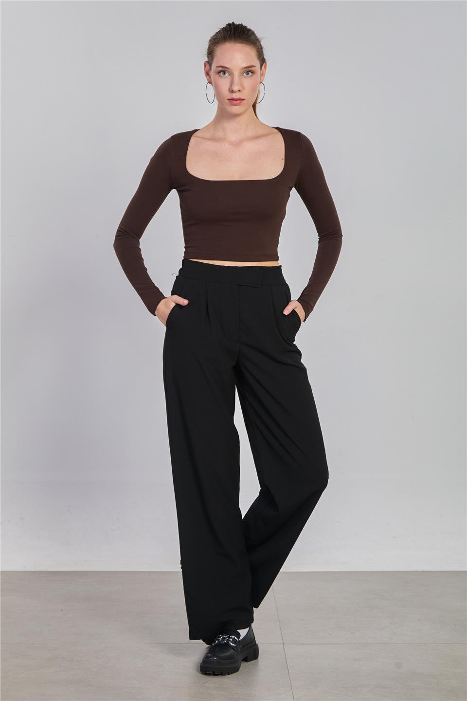 Kadın Beli Cırtlı Kumaş Pantolon - Siyah