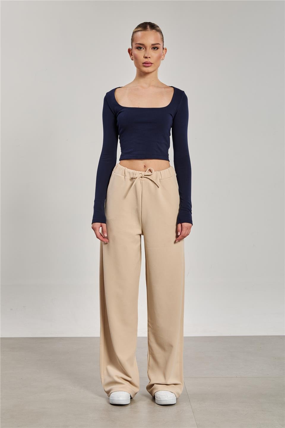 Kadın Beli İpli Bol Paça Pantolon - Taş Rengi