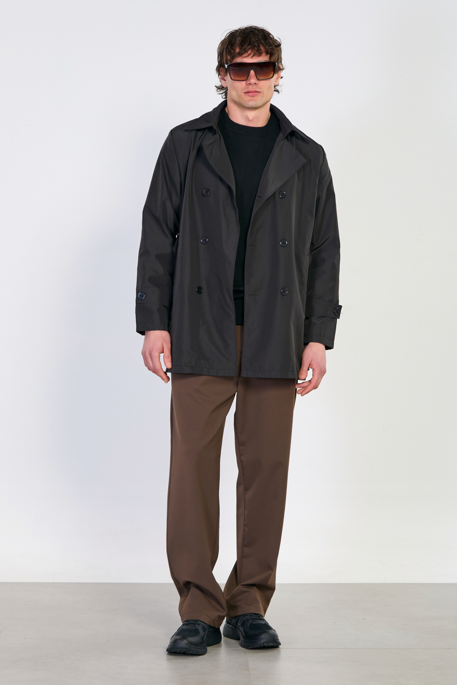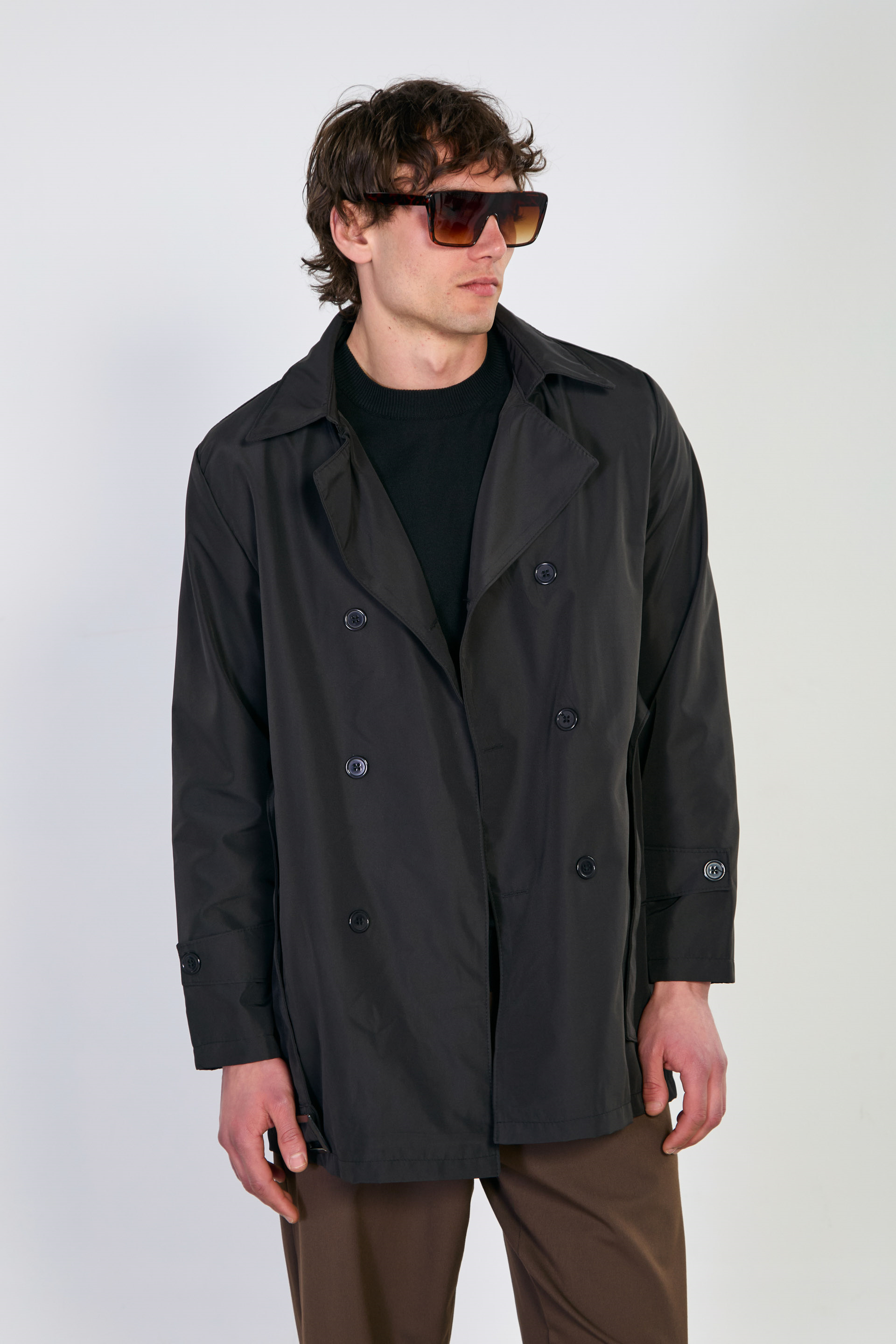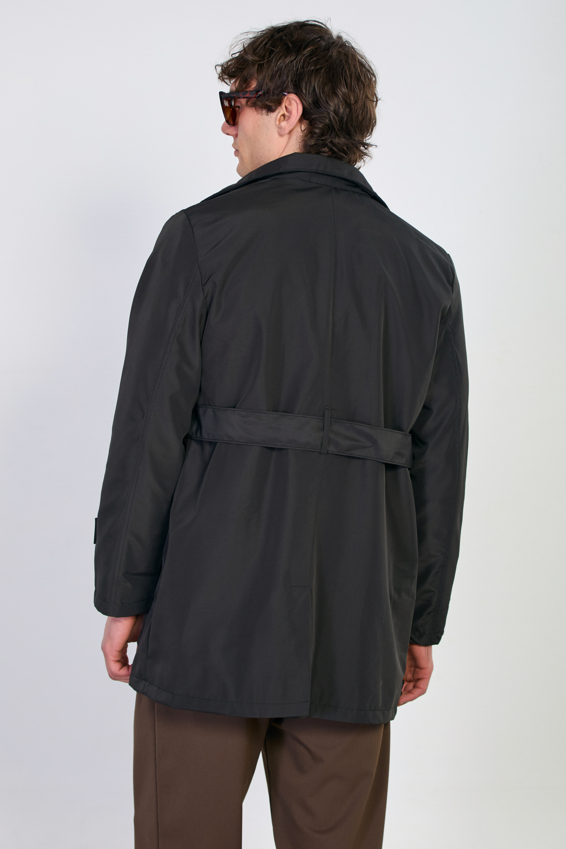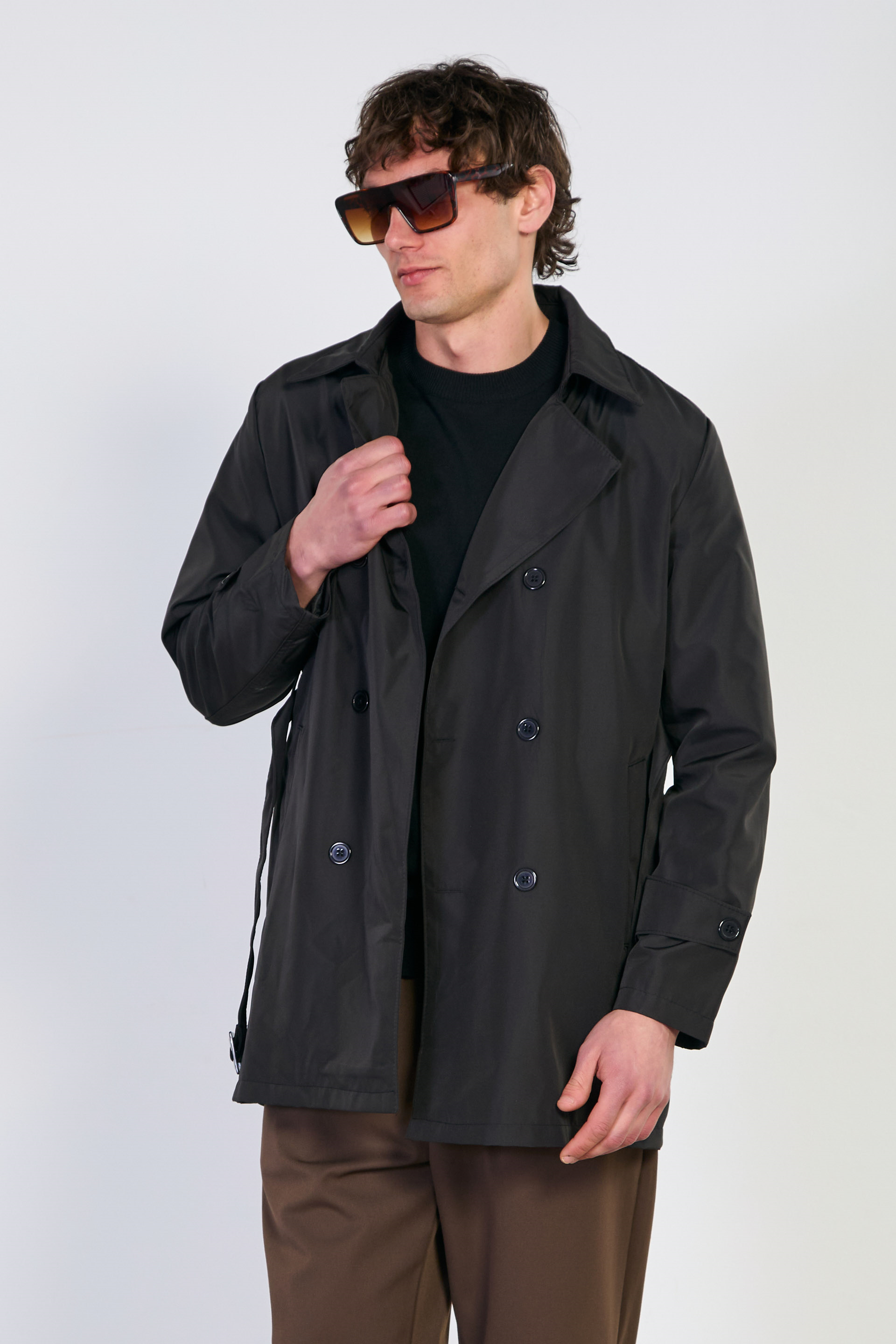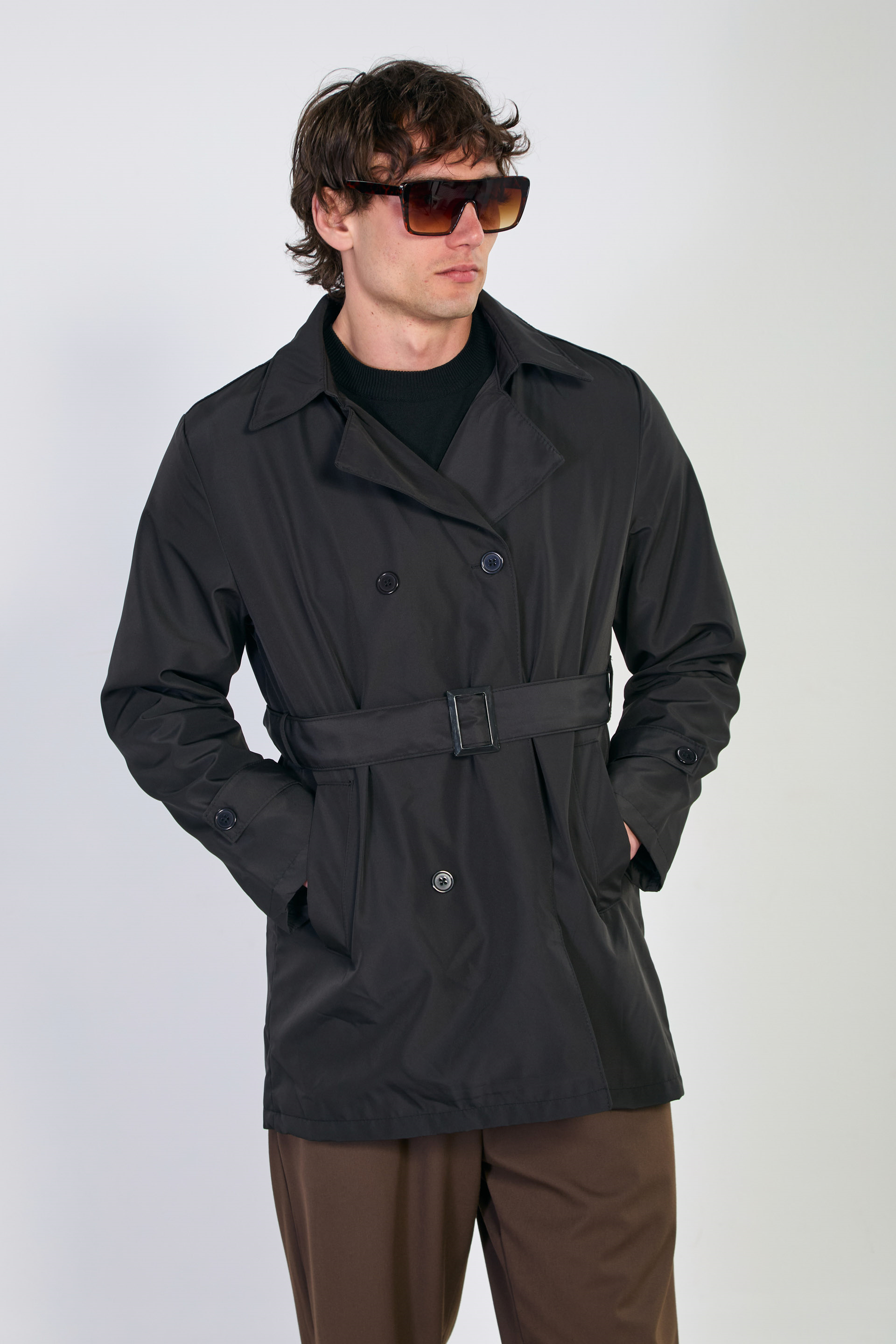 Erkek Beli Kuşaklı Düğmeli Trenç - Siyah