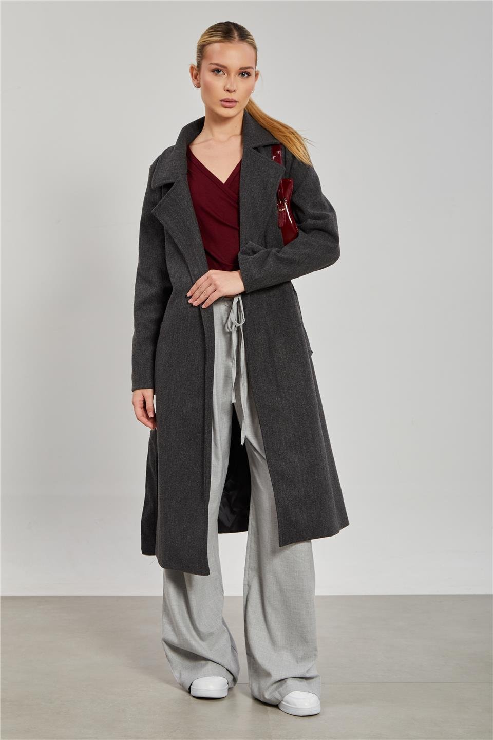 Kadın Beli Kuşaklı Regular Fit Kaşe Kaban - Antrasit