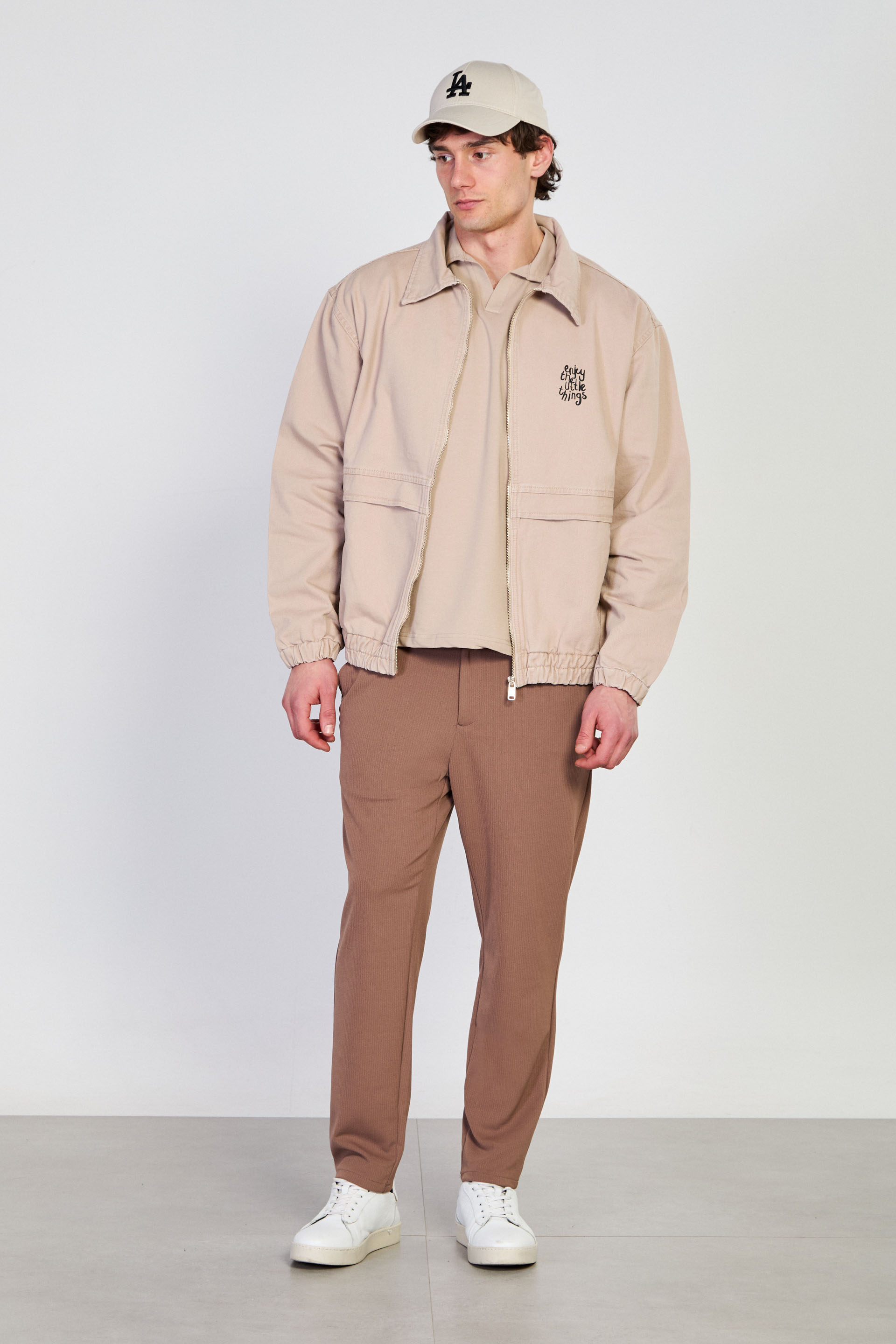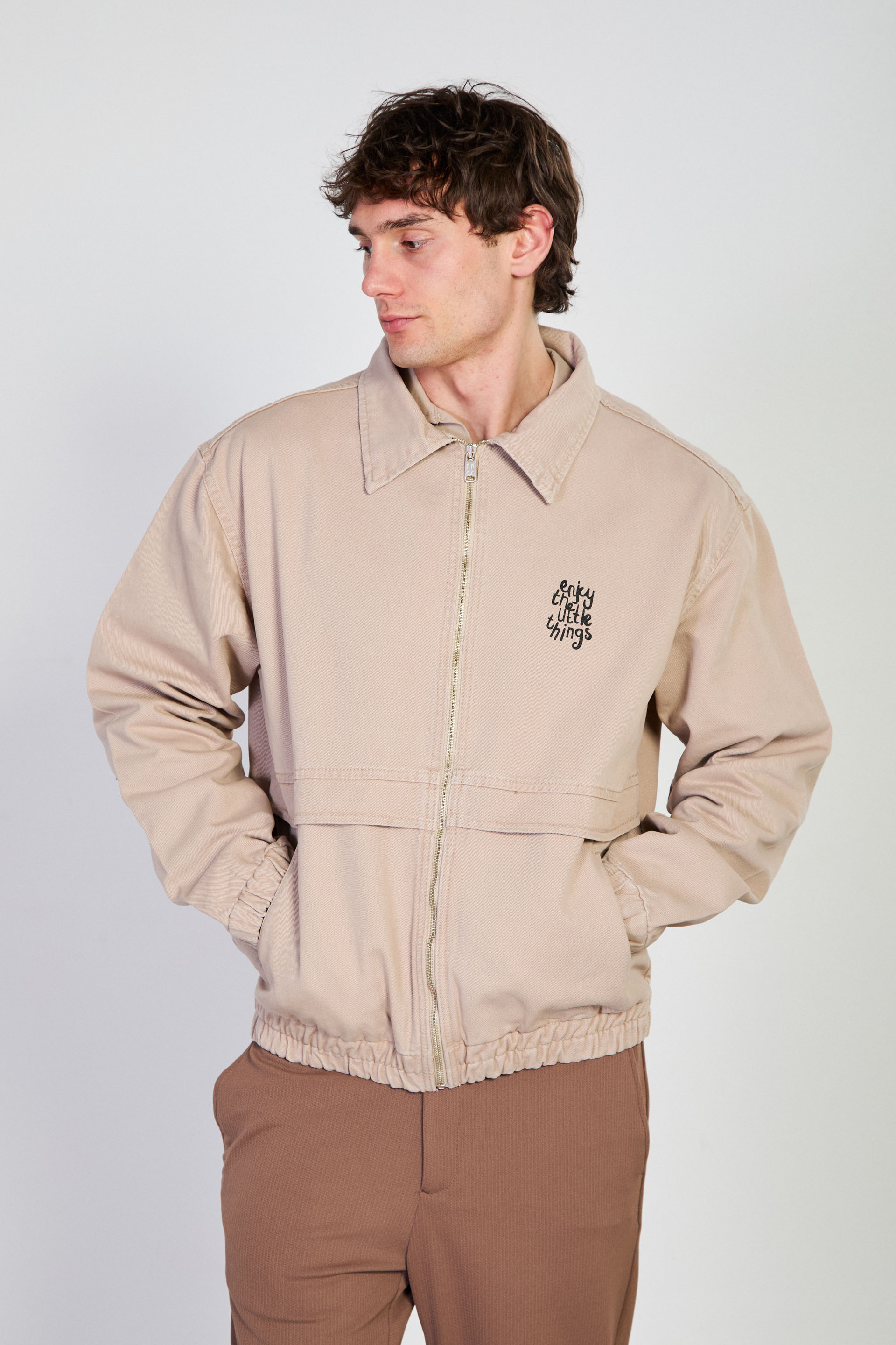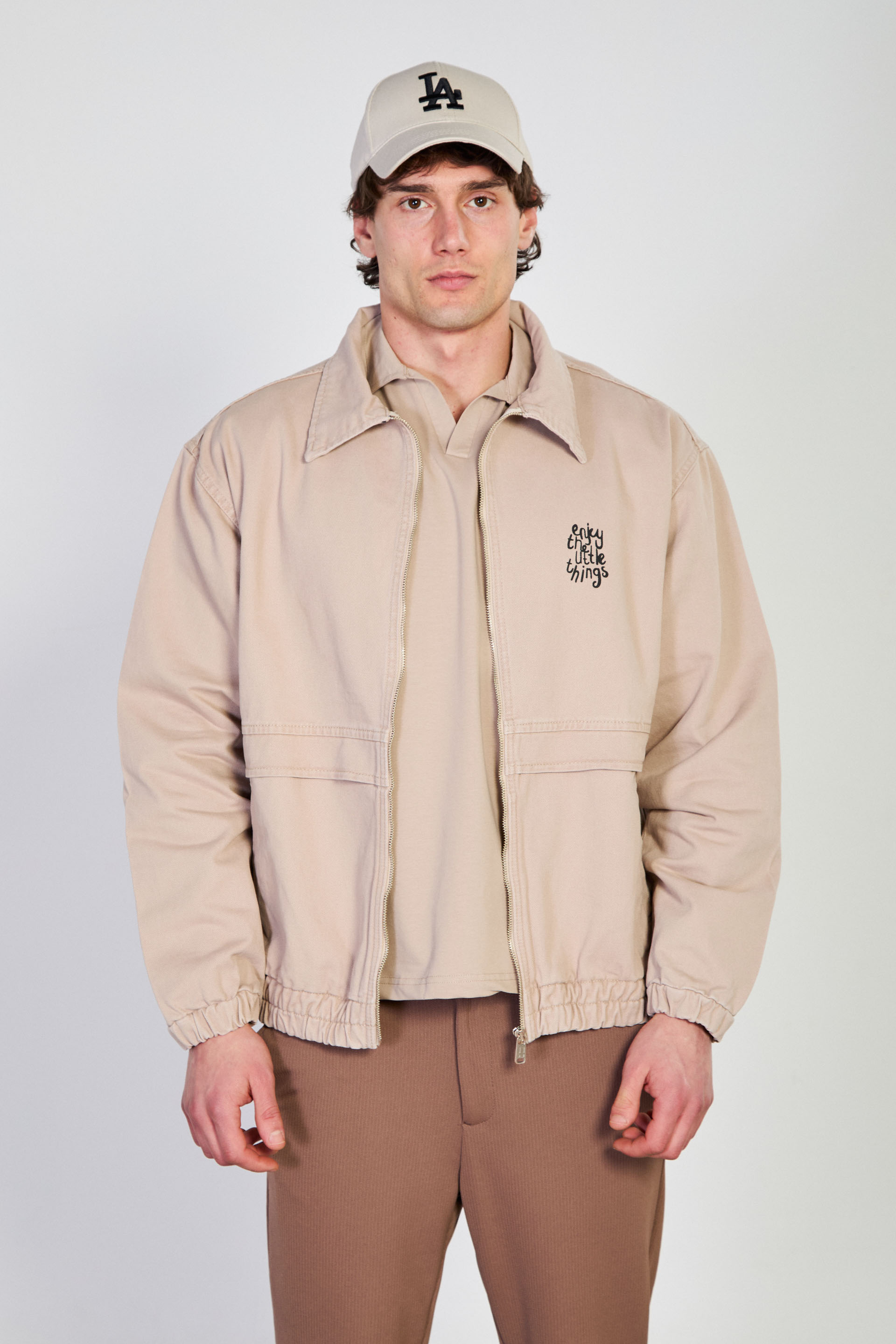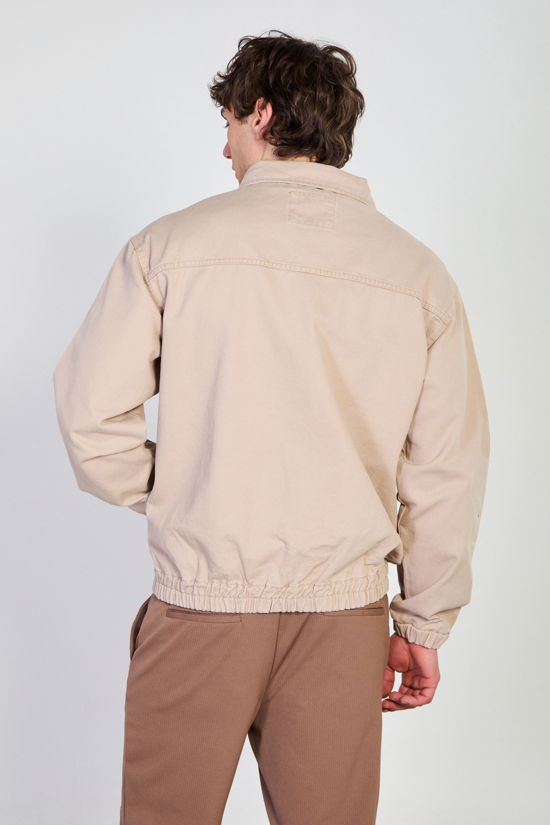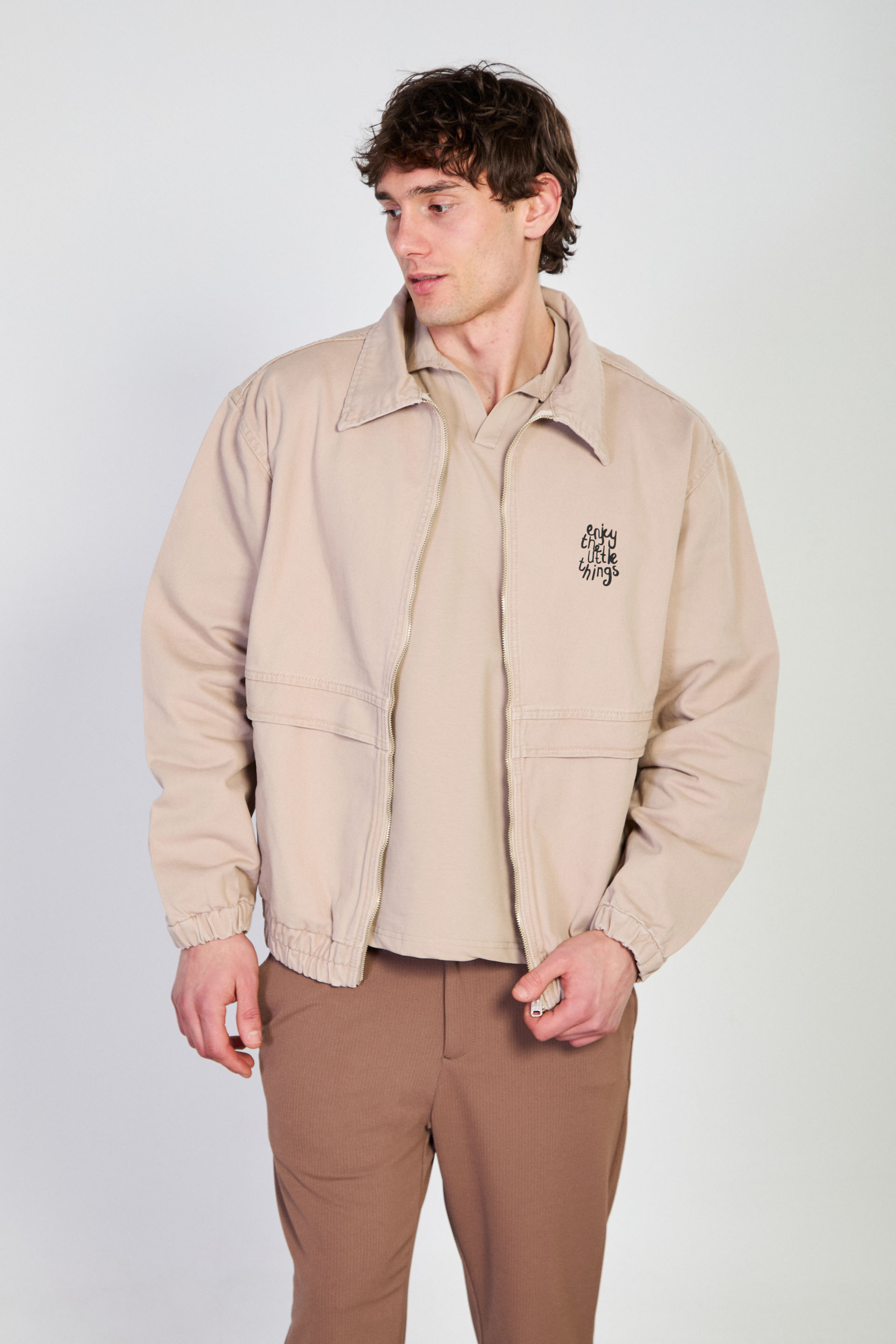 Erkek Beli Lastikli Fermuar Polo Yaka Ceket - Bej