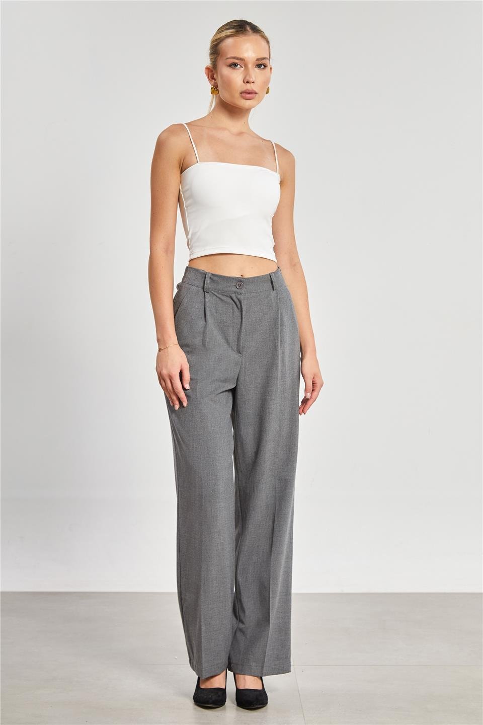Kadın Beli Lastikli Palazzo Pantolon - Okul Gri