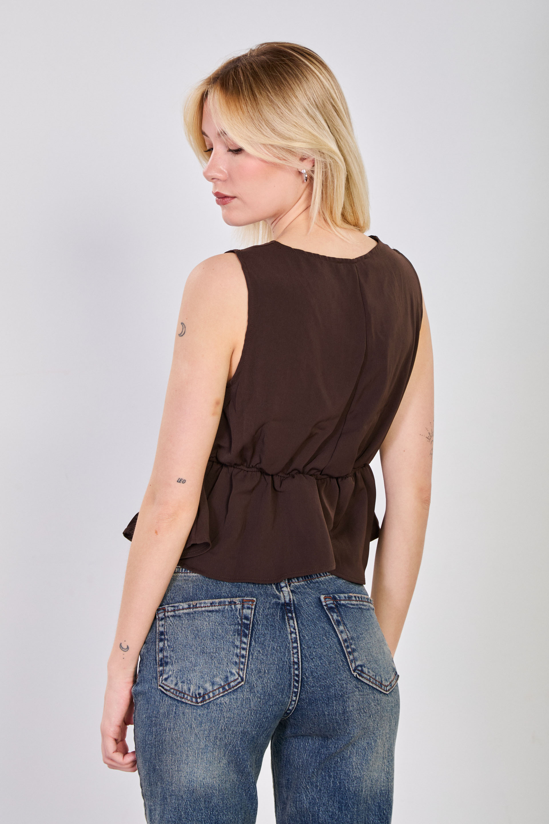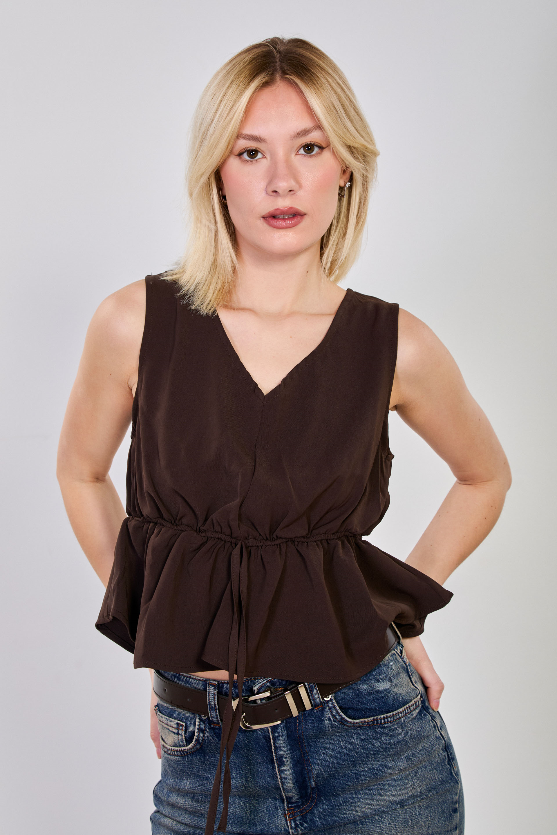 Kadın Beli Lastikli V Yaka Kolsuz Bluz - Kahve