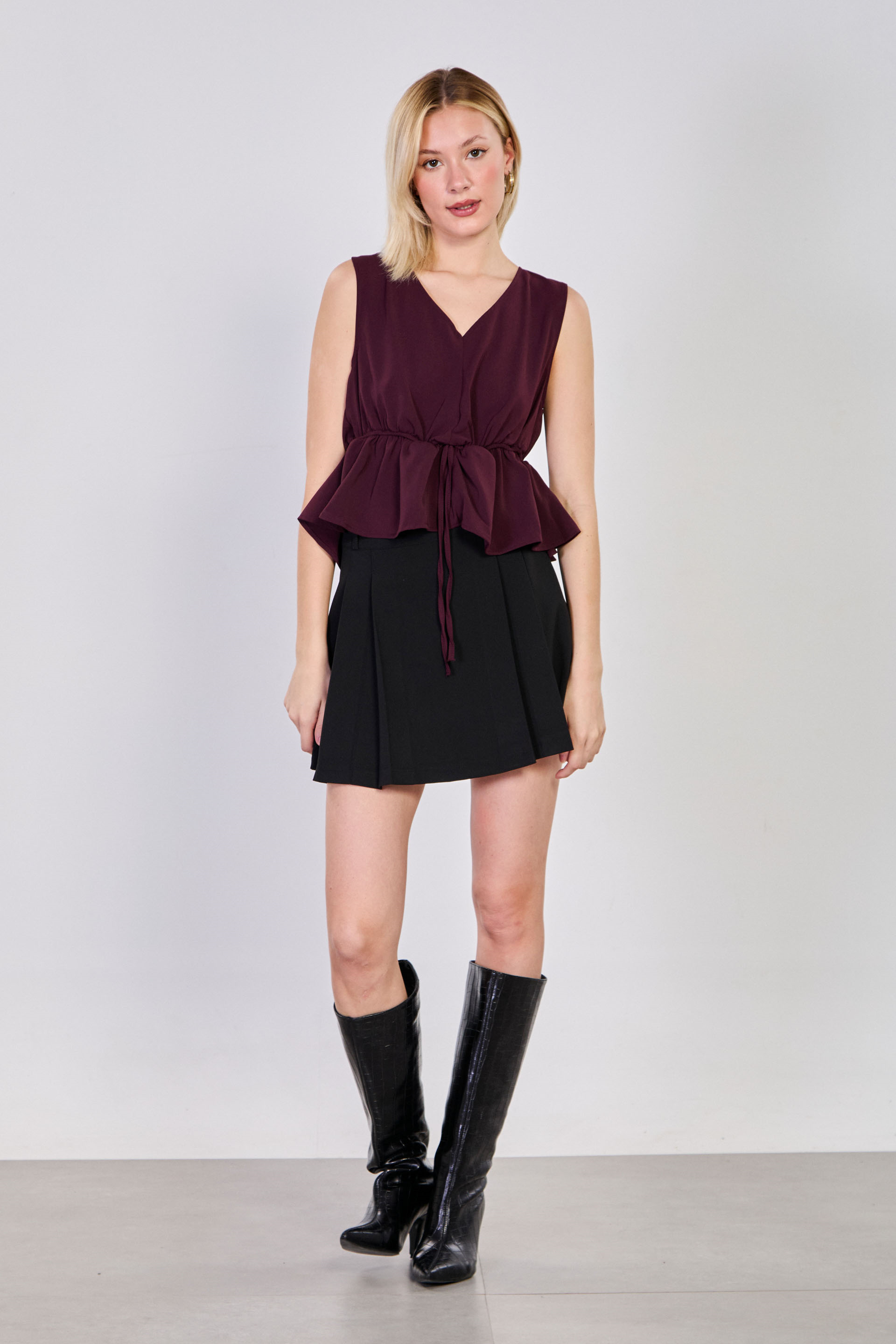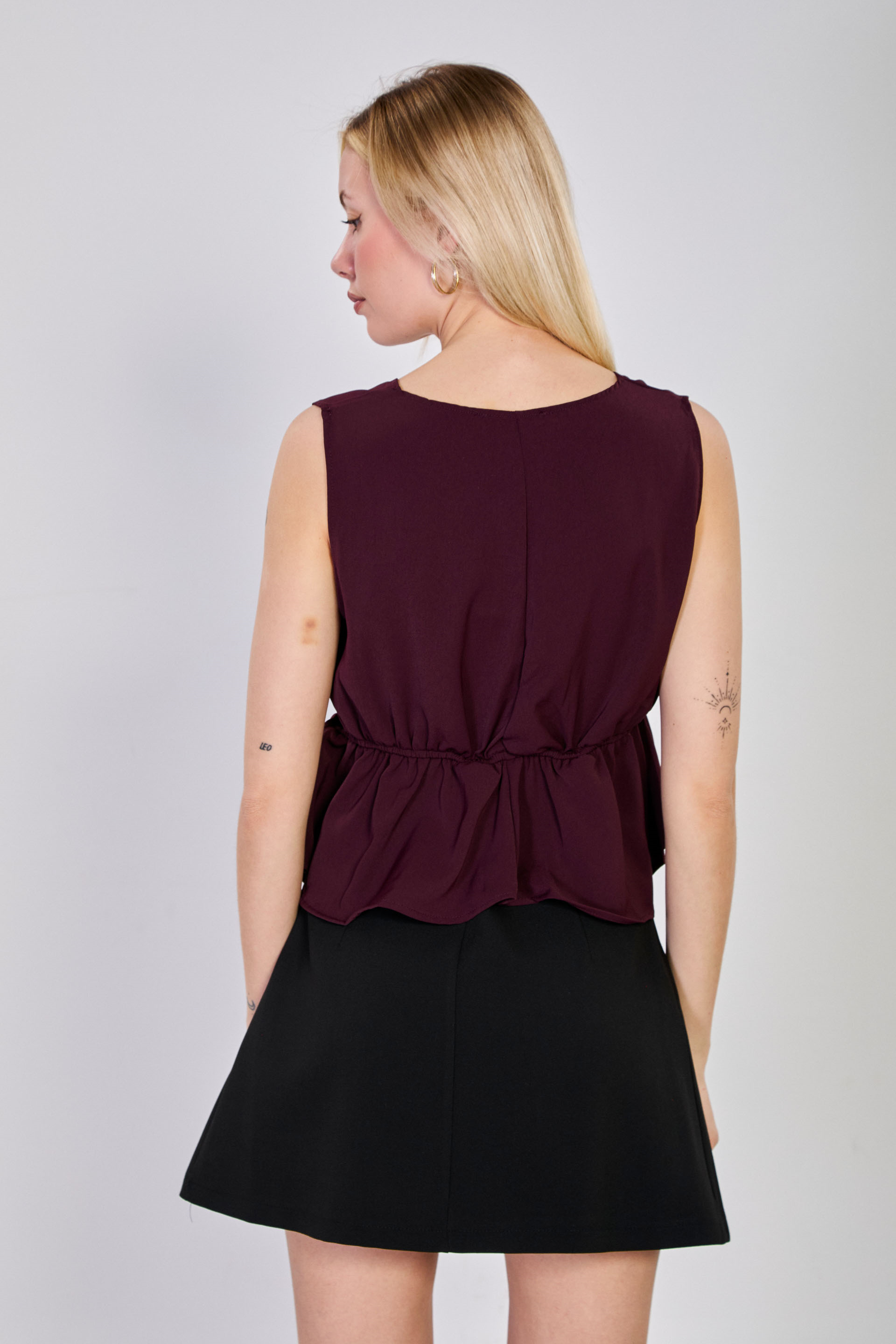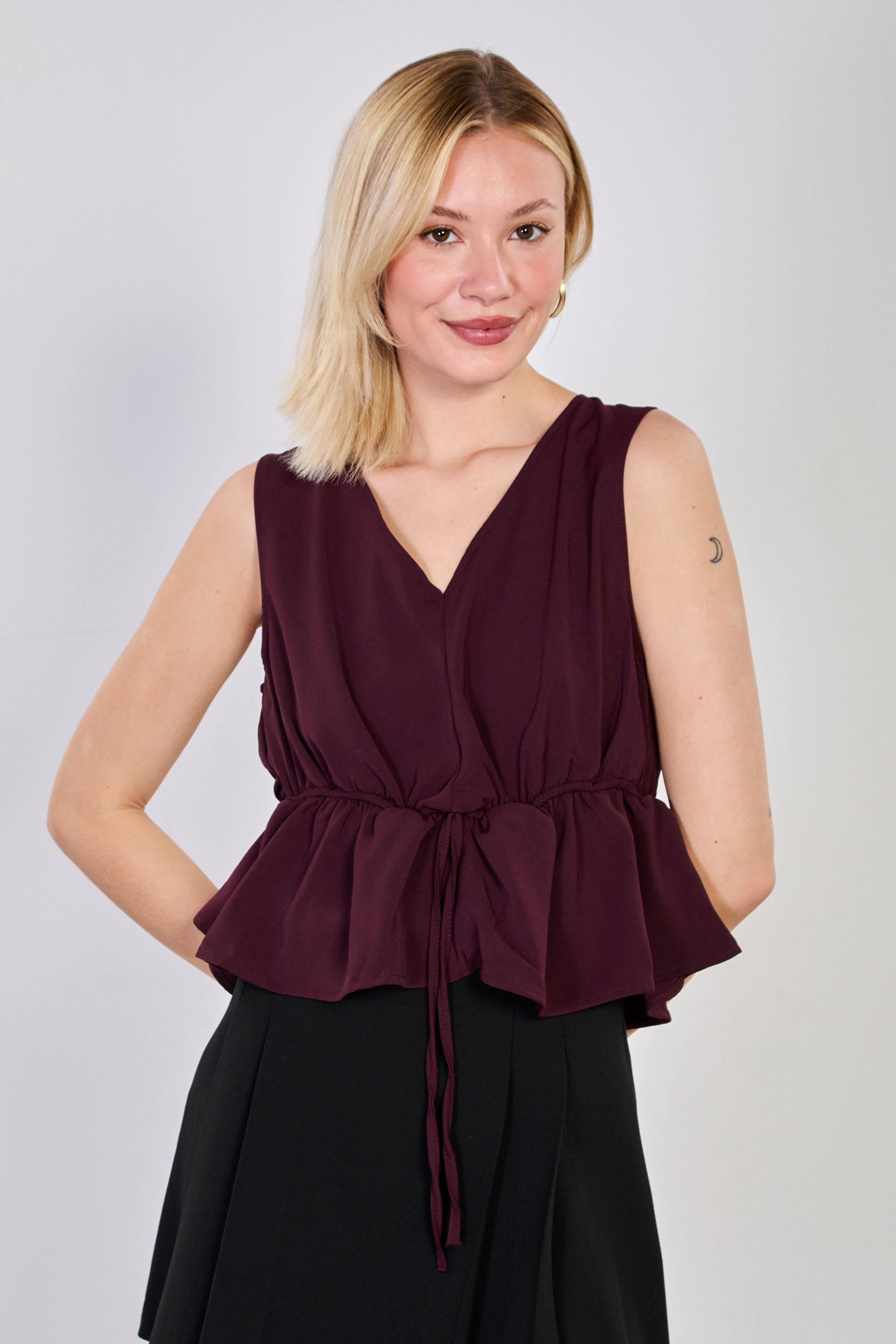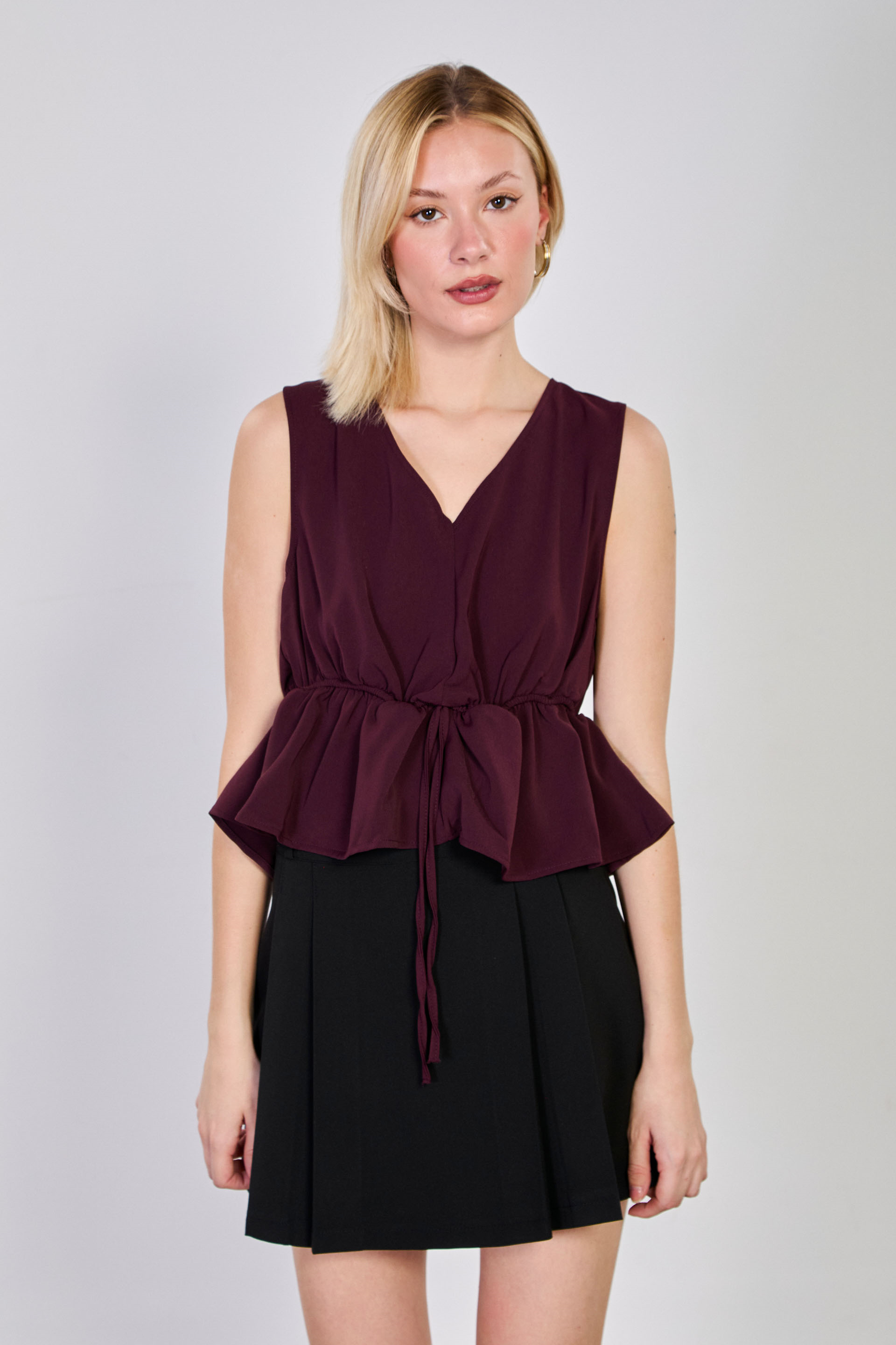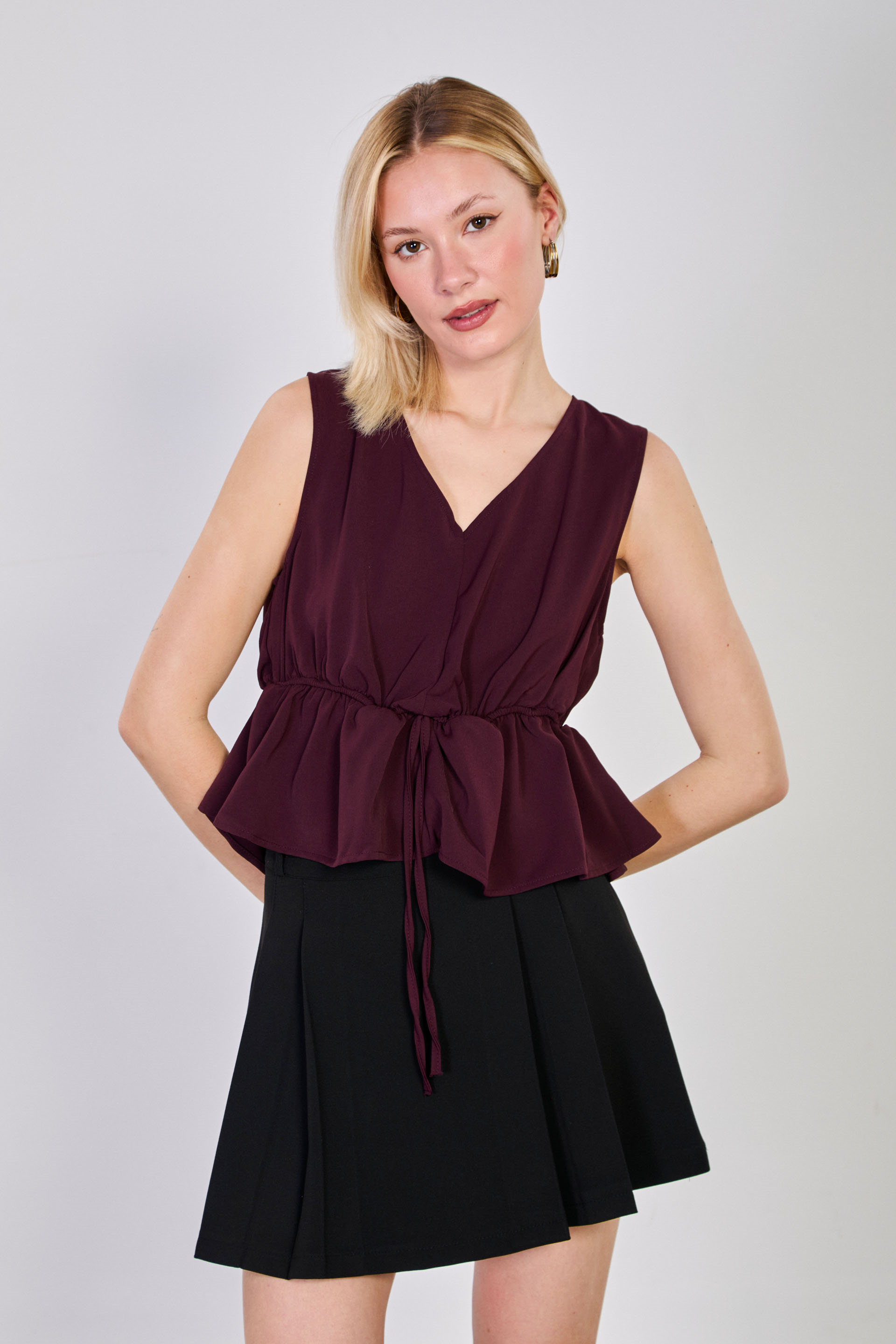 Kadın Beli Lastikli V Yaka Kolsuz Bluz - Mürdüm
