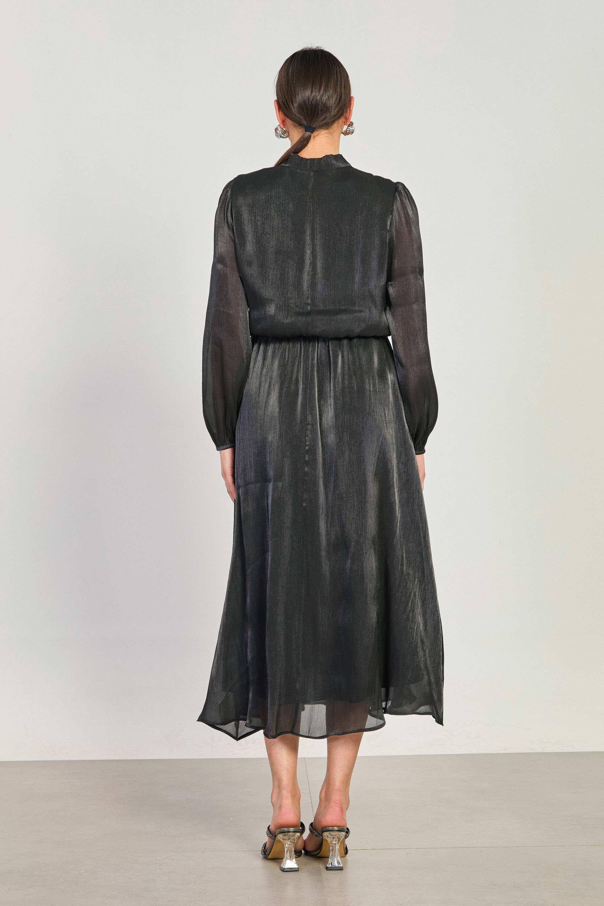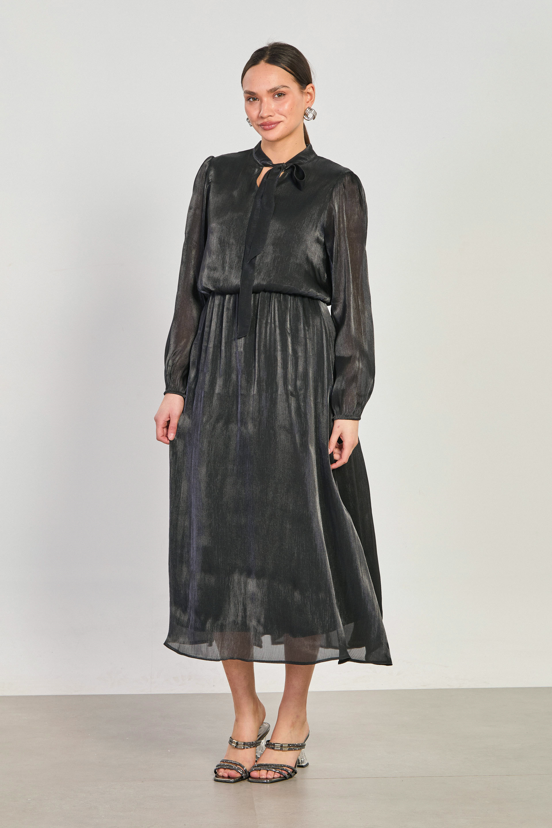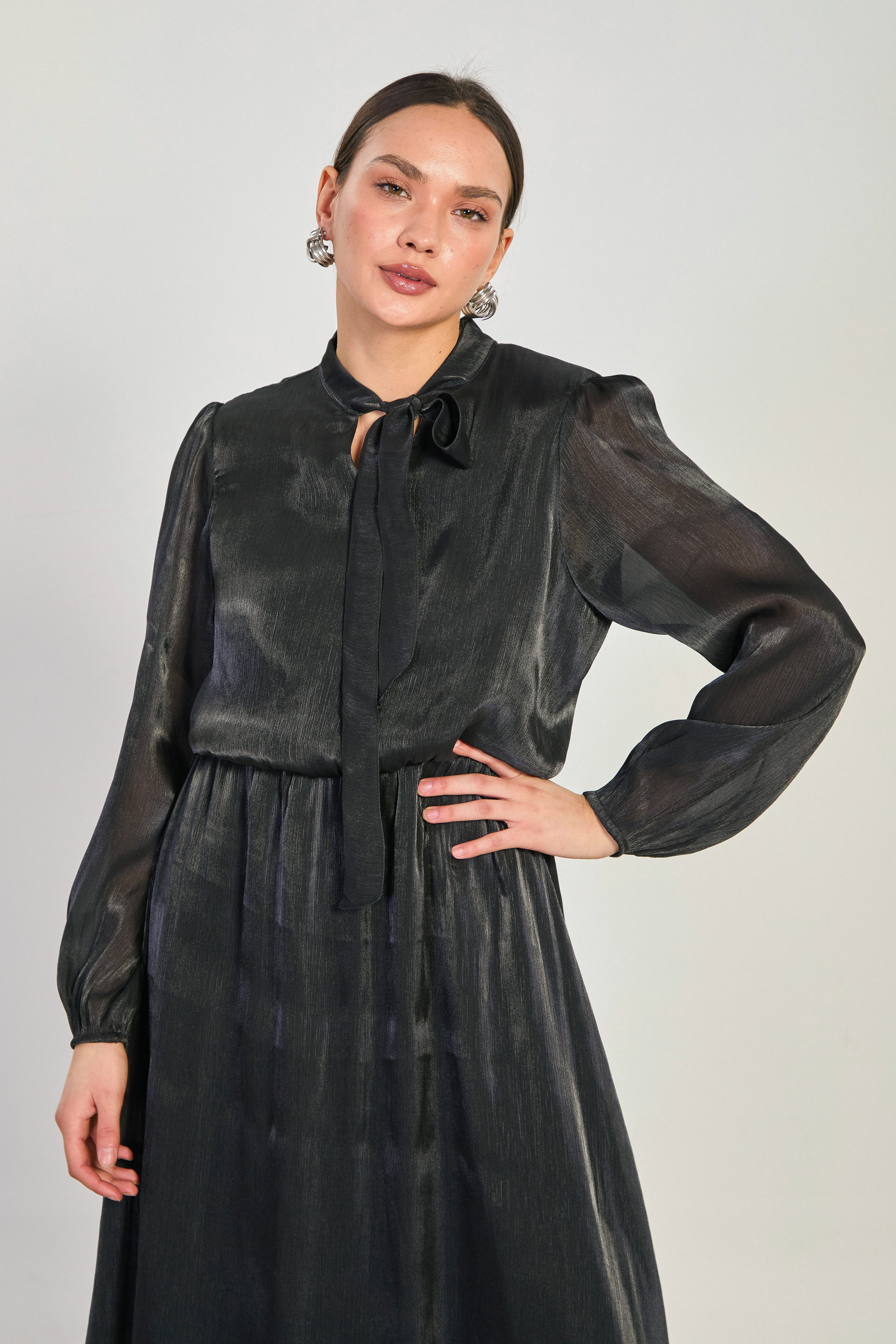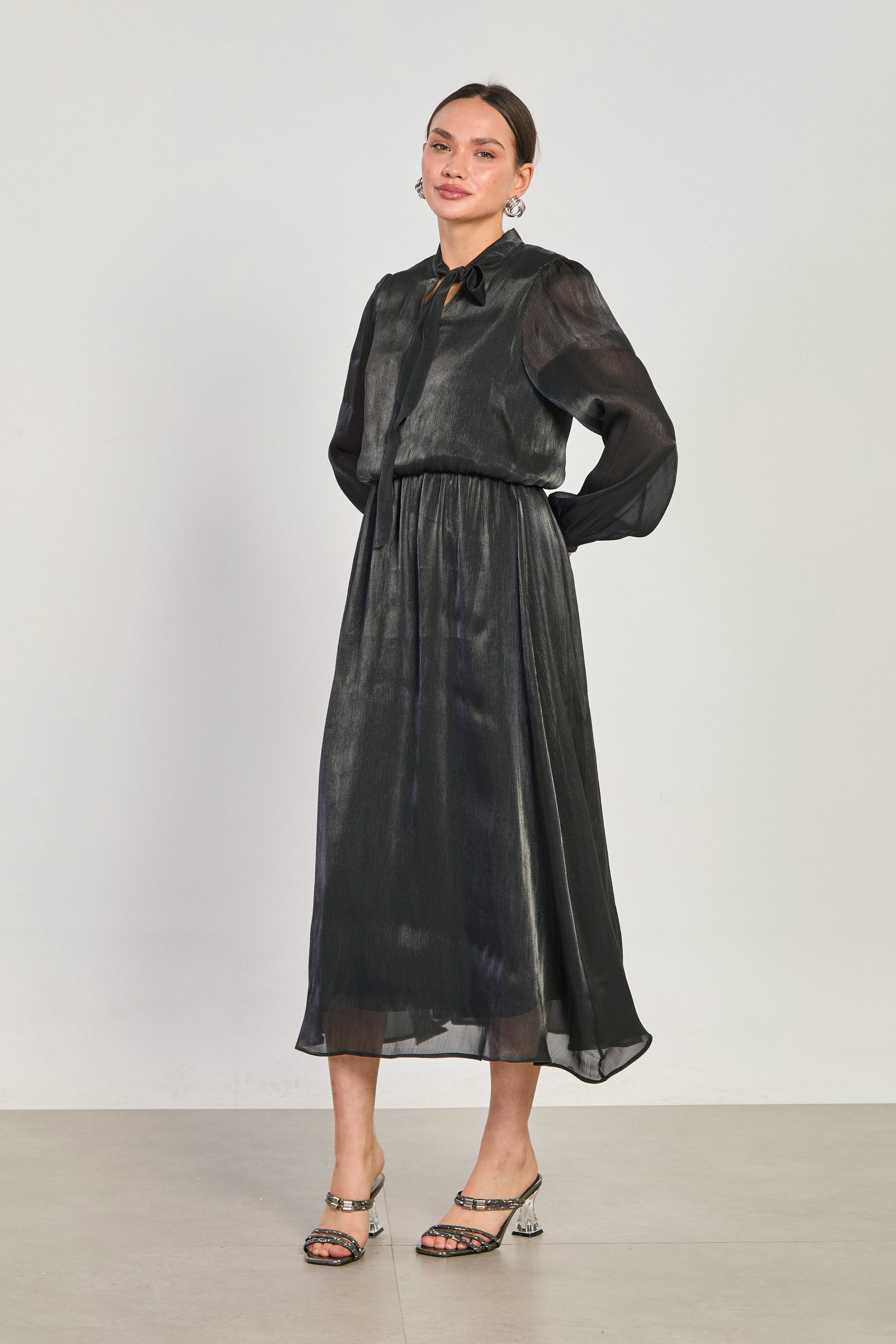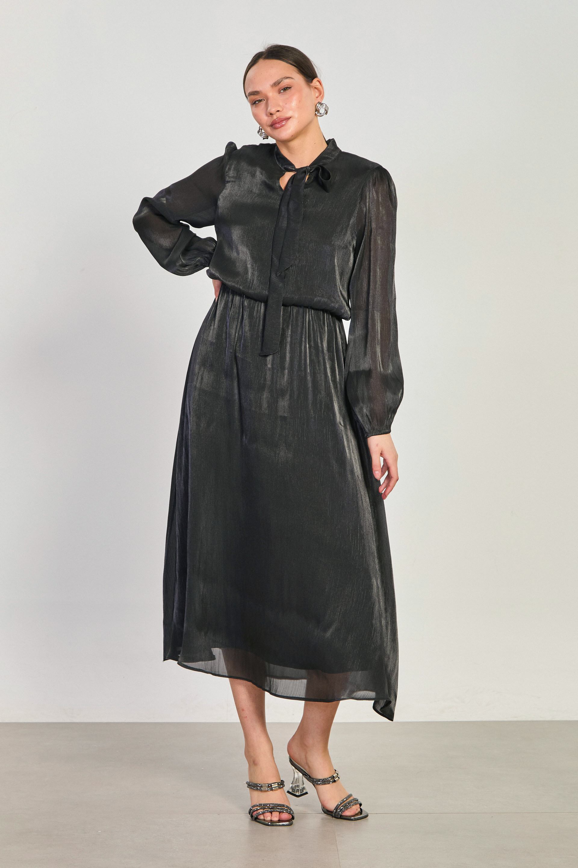 Kadın Beli Lastikli Yaka Bağlamalı Midi Elbise - Siyah
