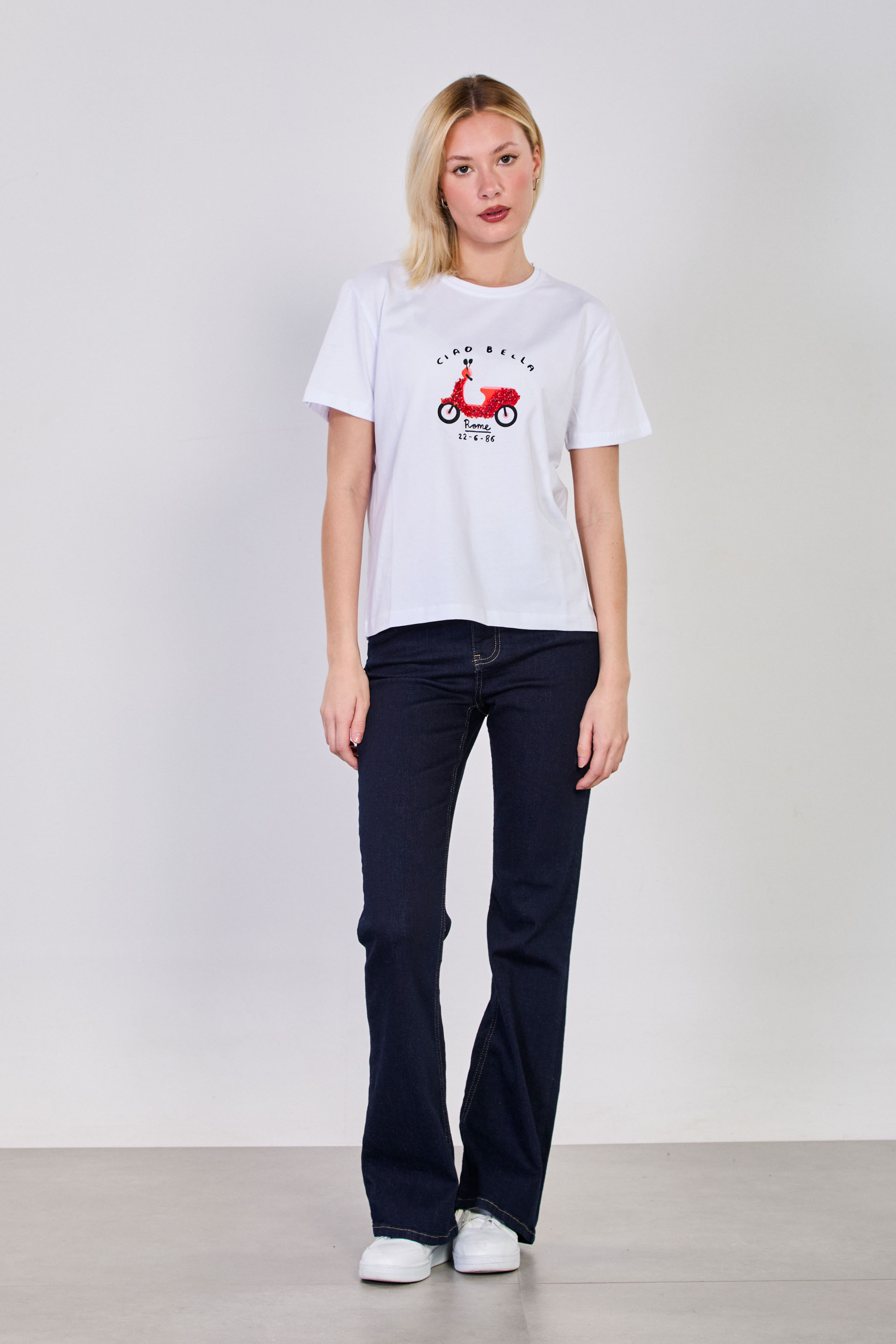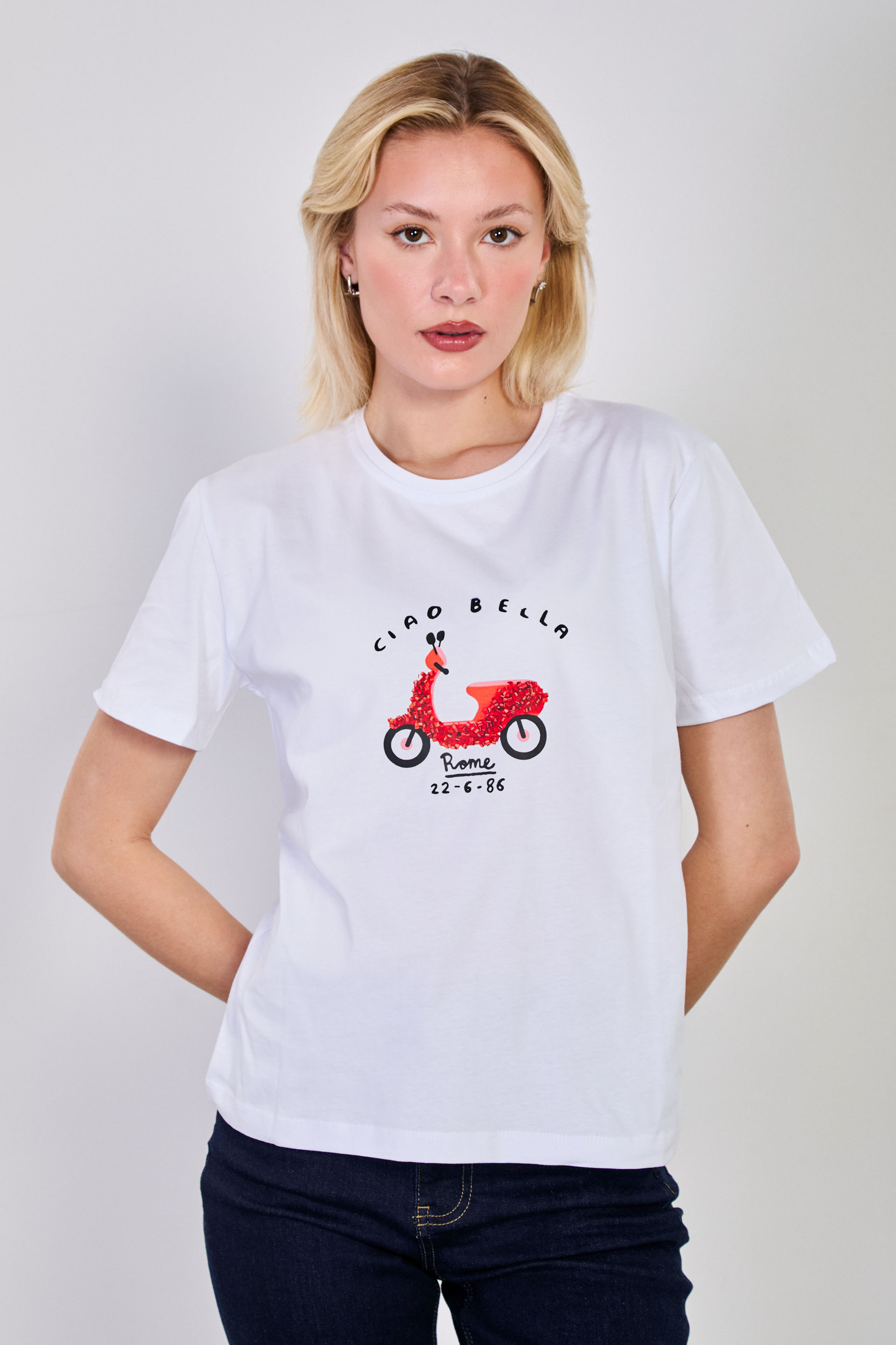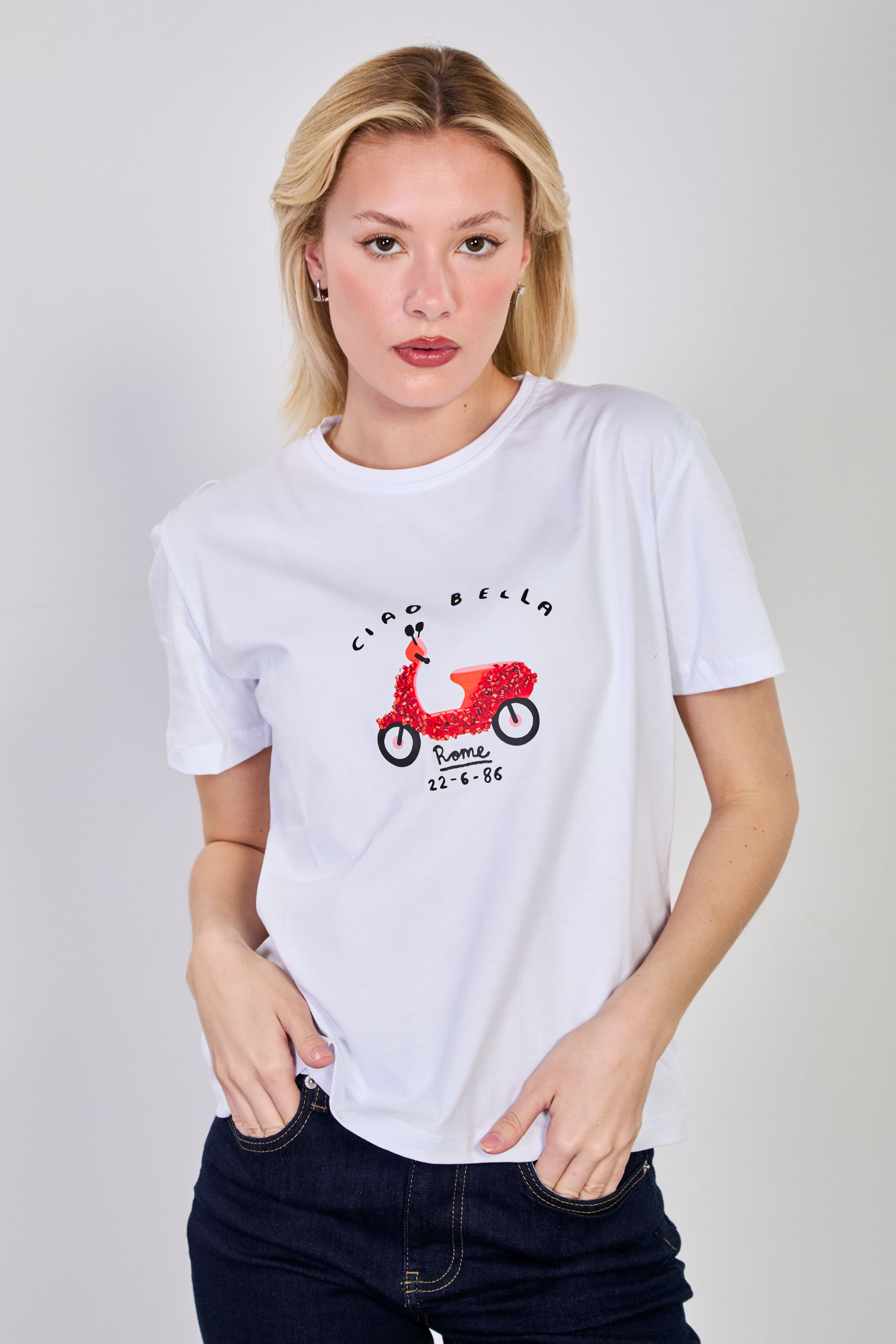 Kadın Bisiklet Baskılı T-Shirt - Beyaz