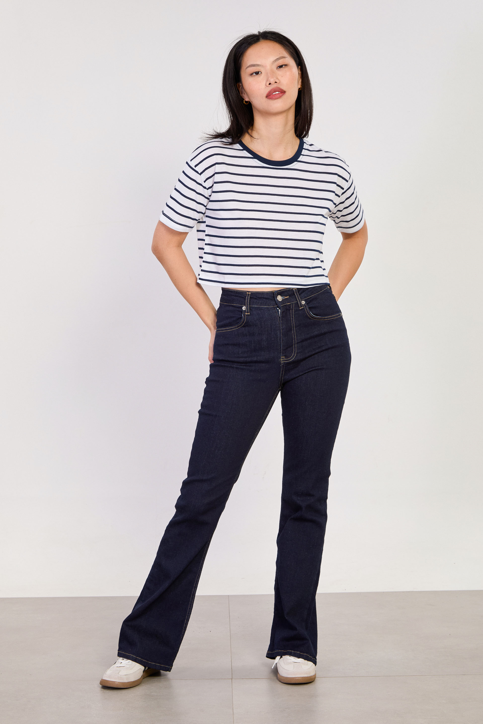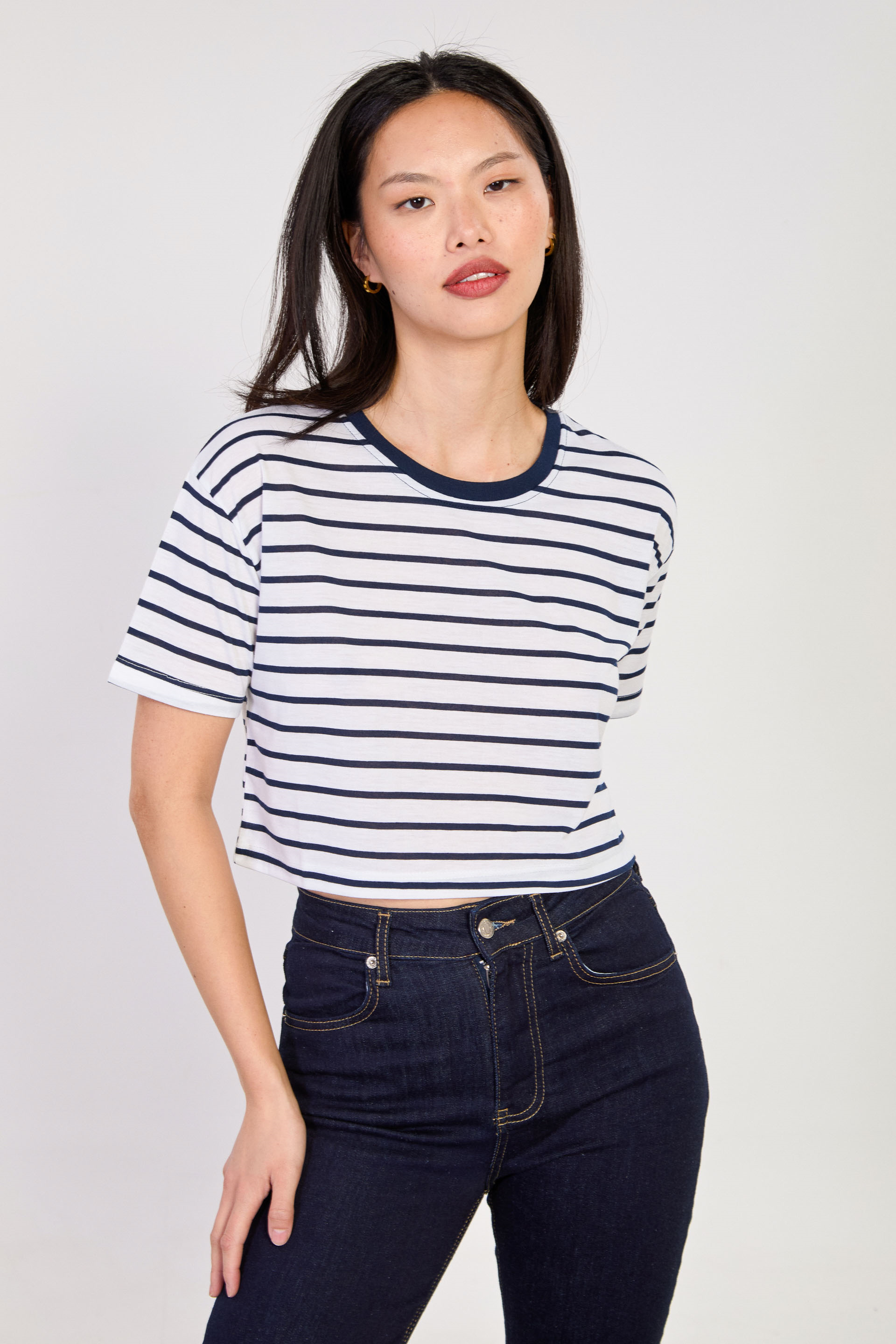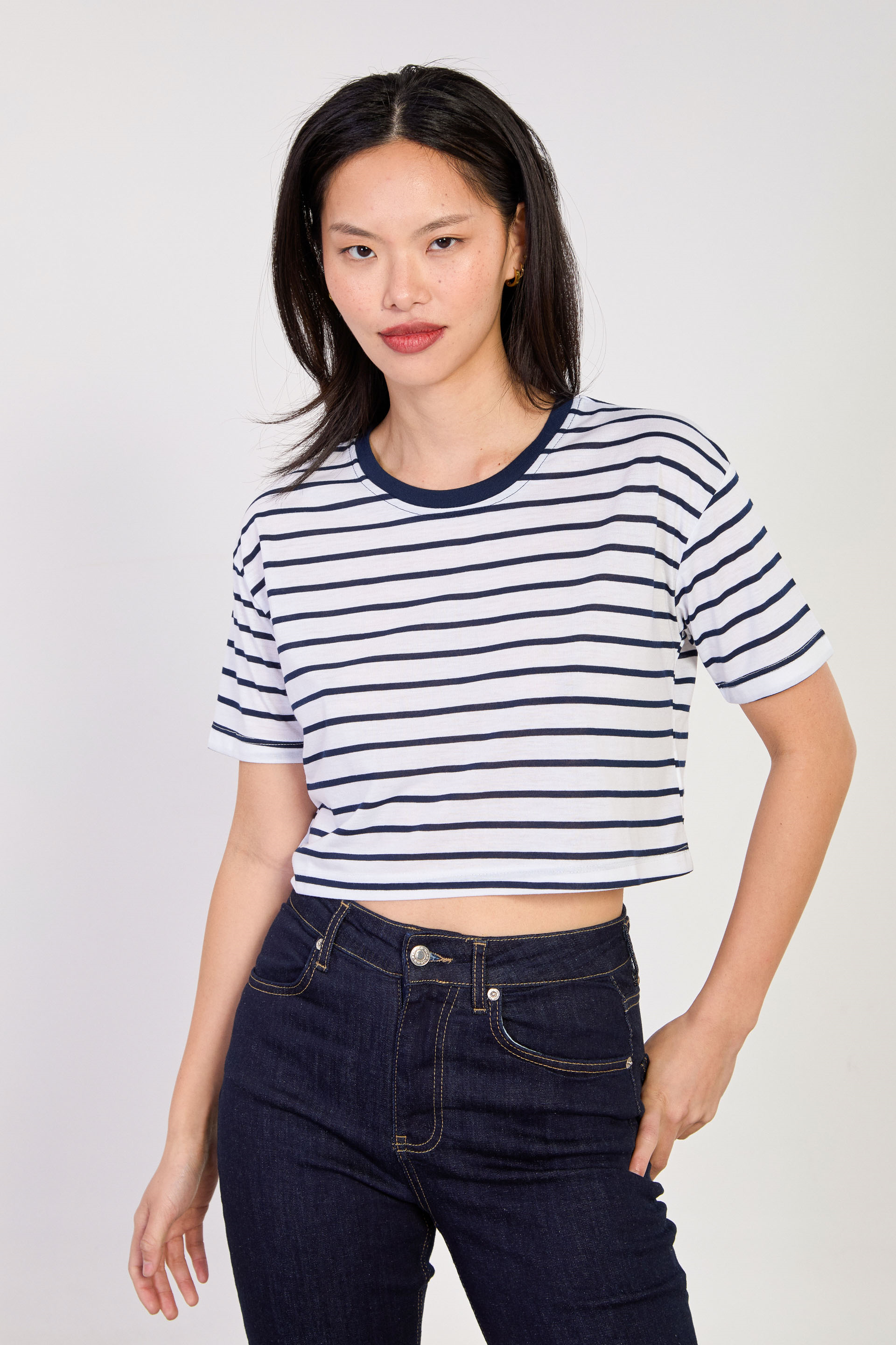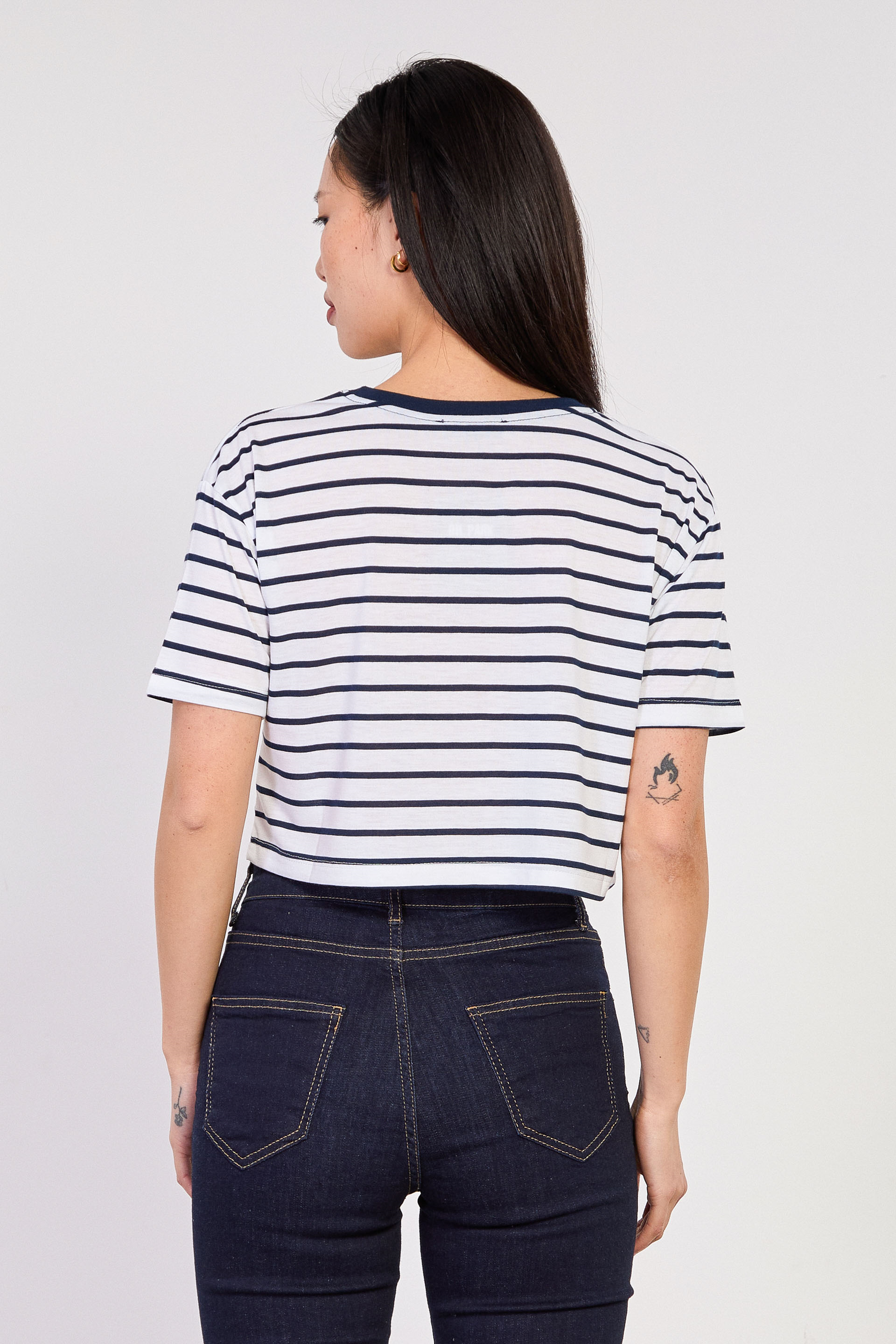 Kadın Bisiklet Yaka Çizgili Crop T-Shirt - Ekru/Lacivert