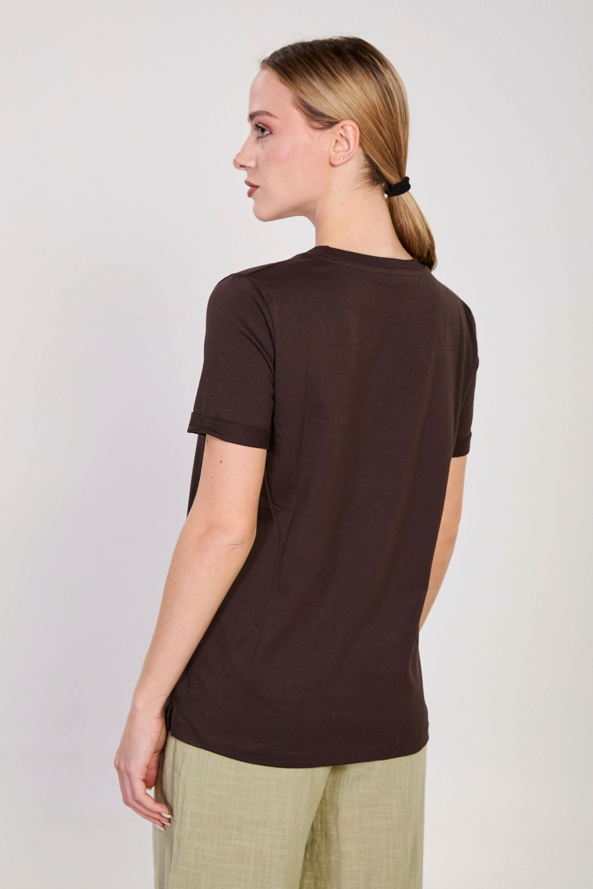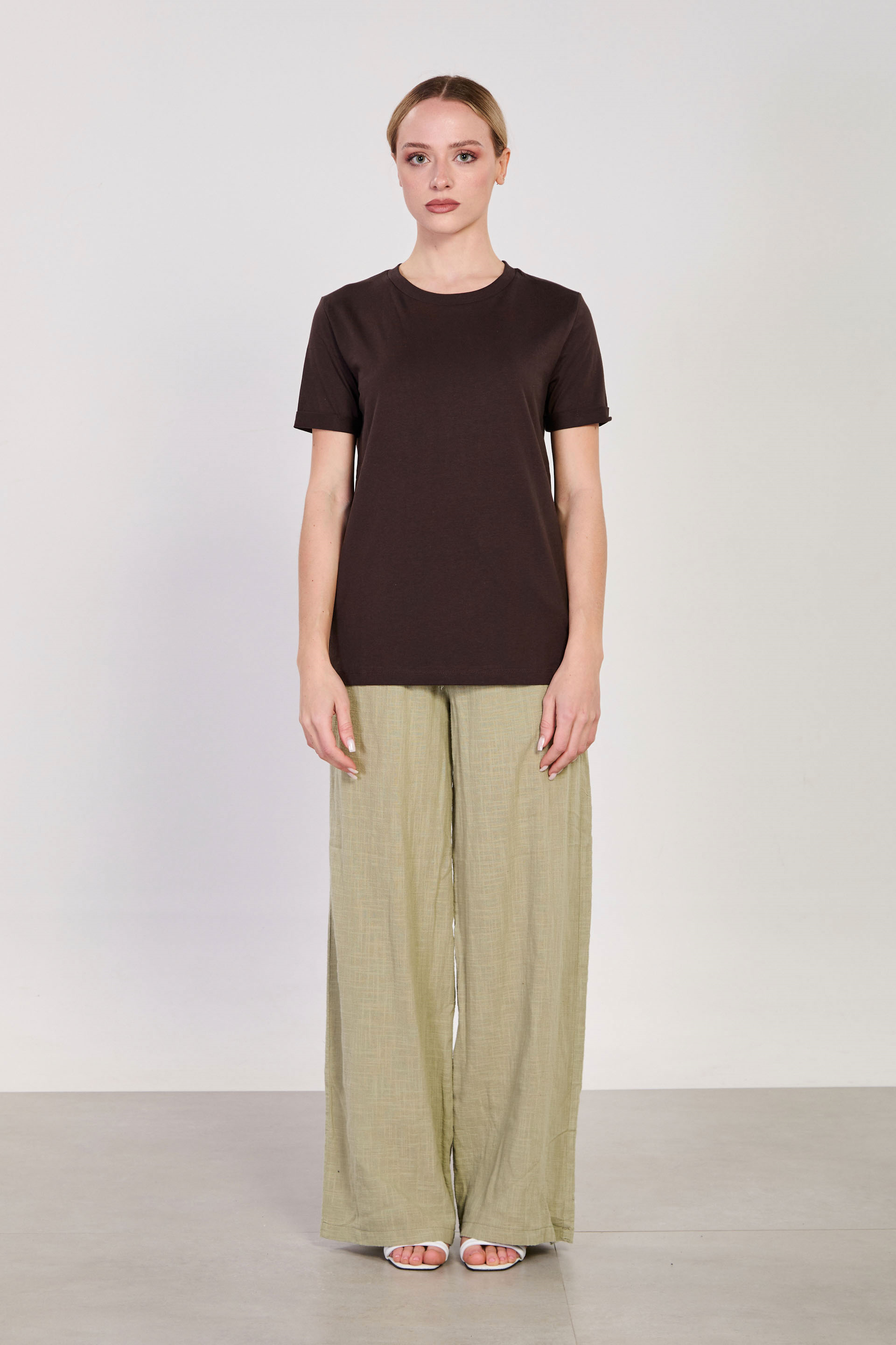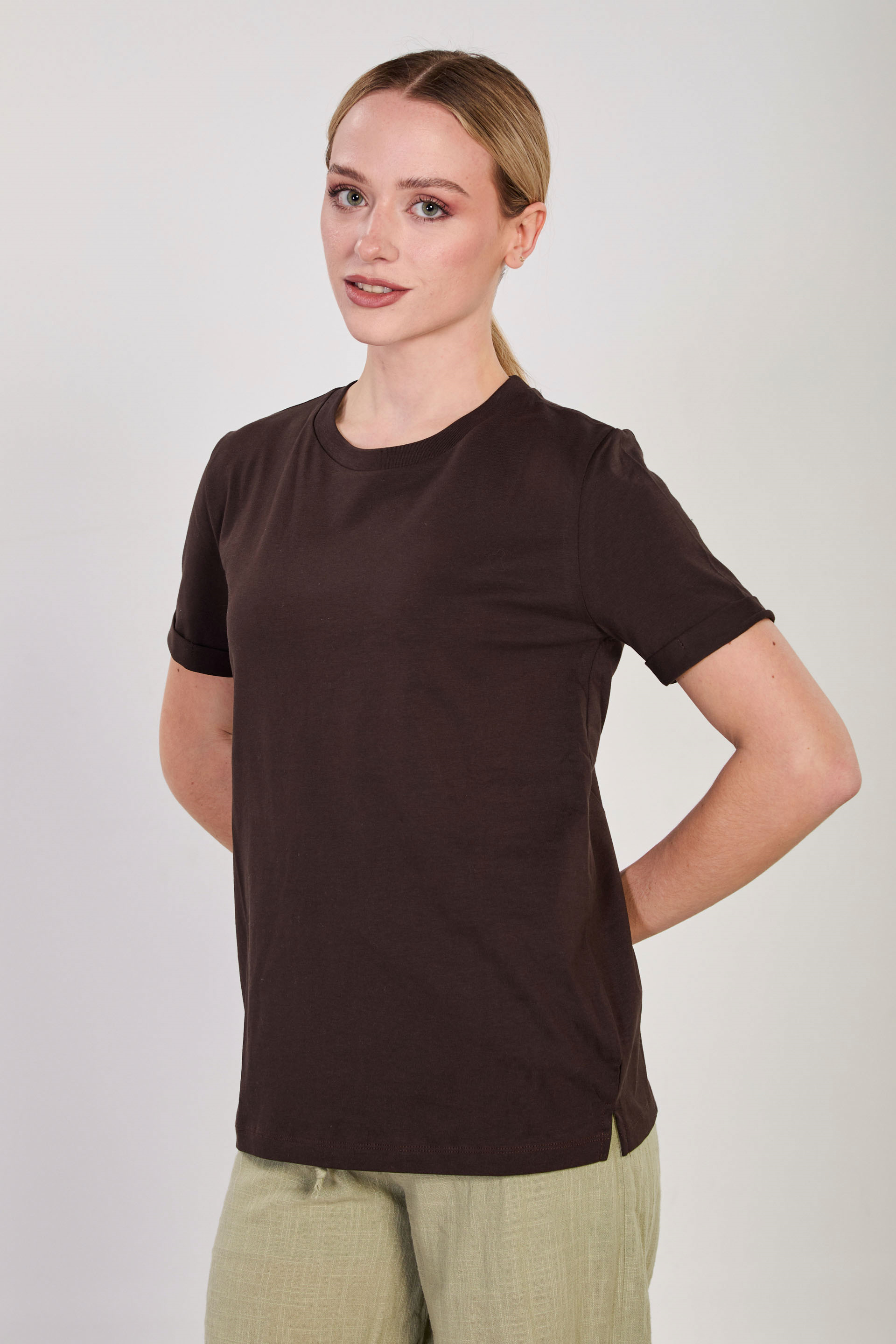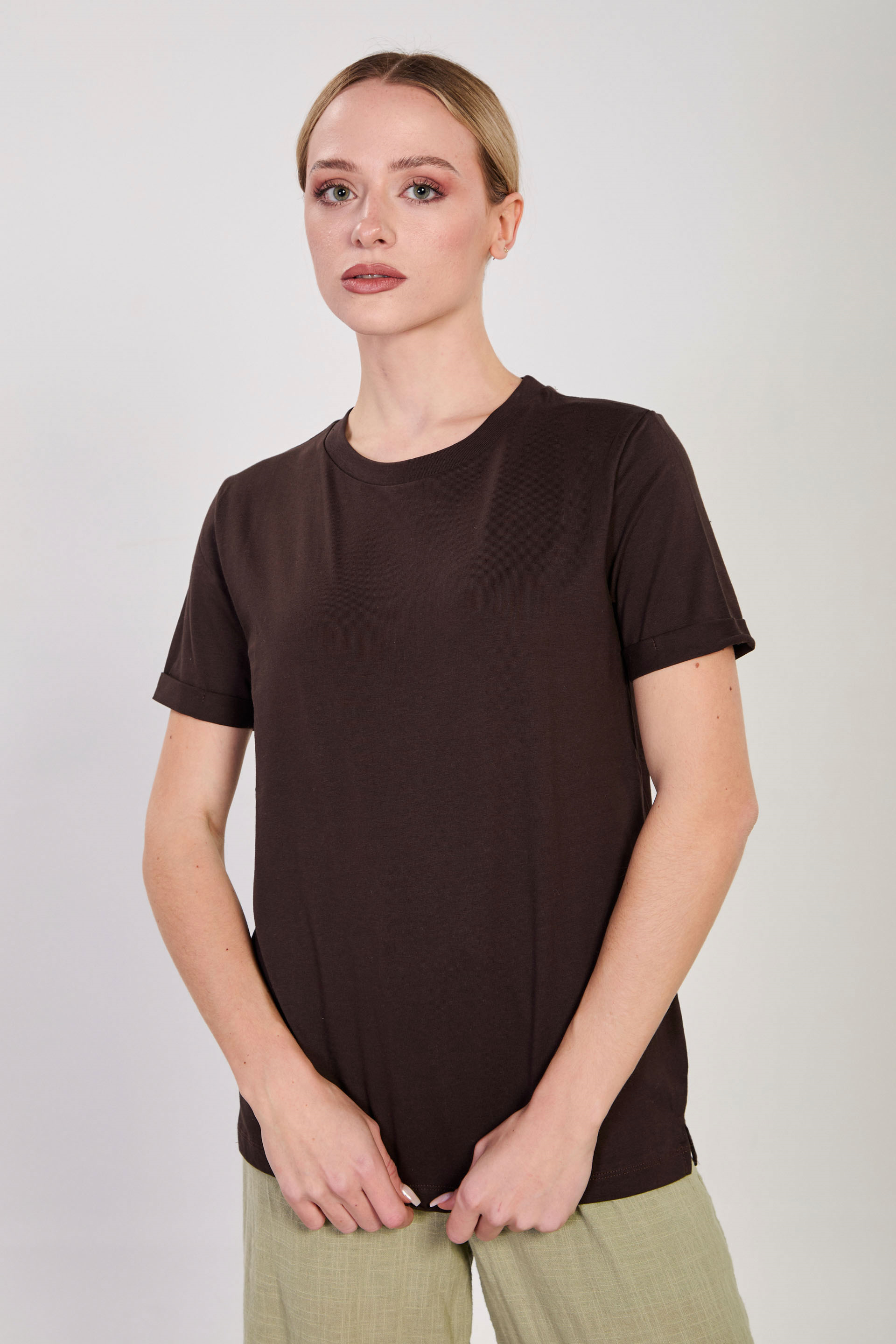Kadın Bisiklet Yaka Double Kol Basic T-Shirt - Acı Kahve