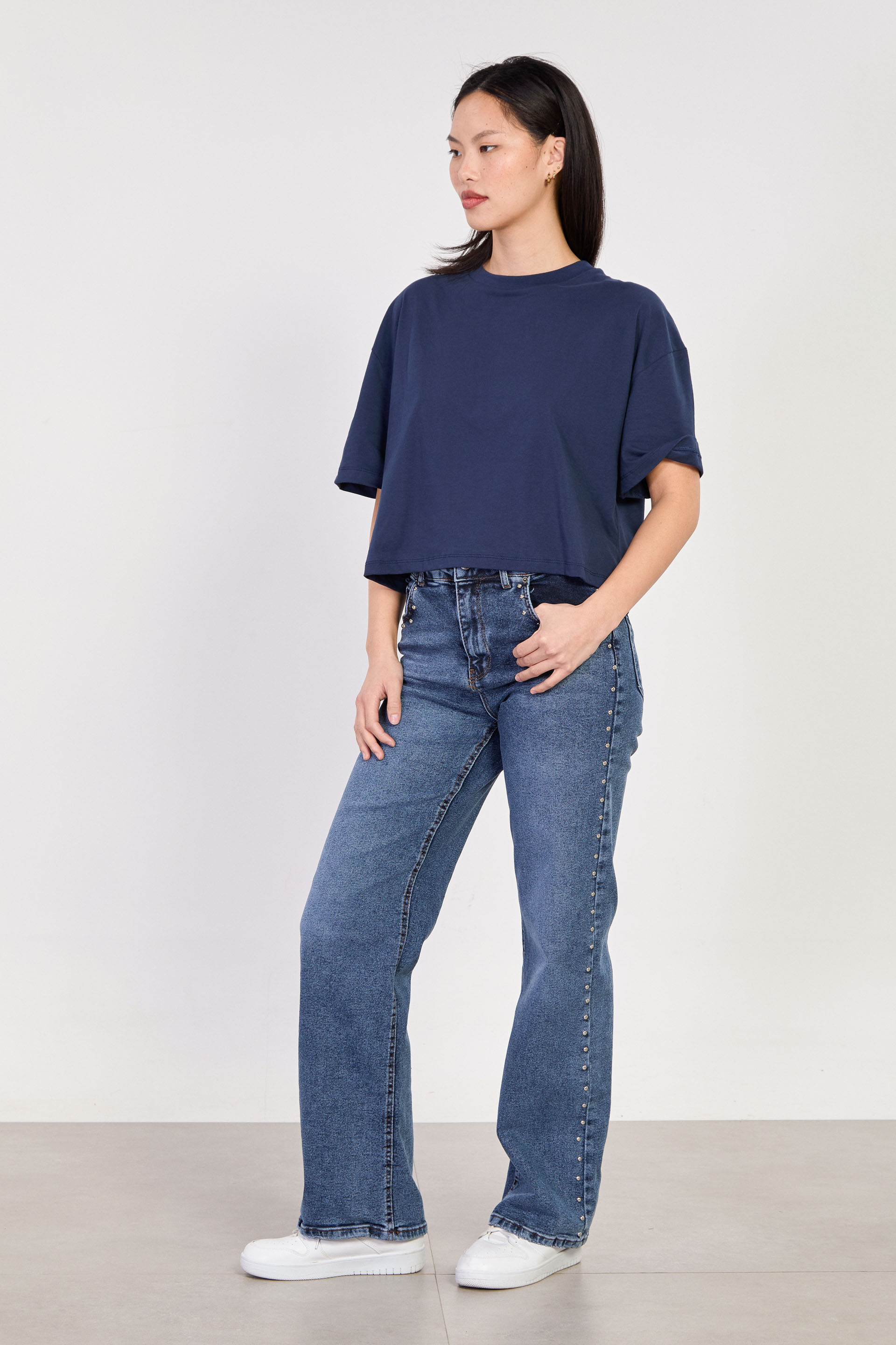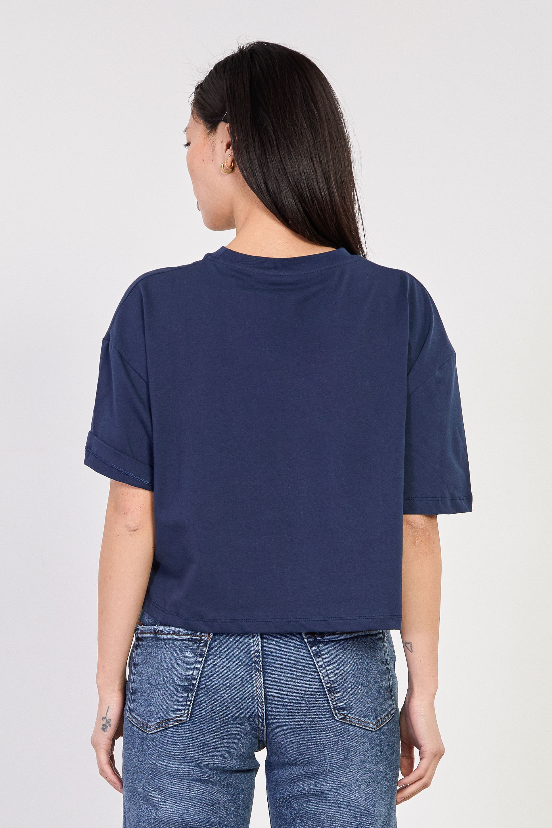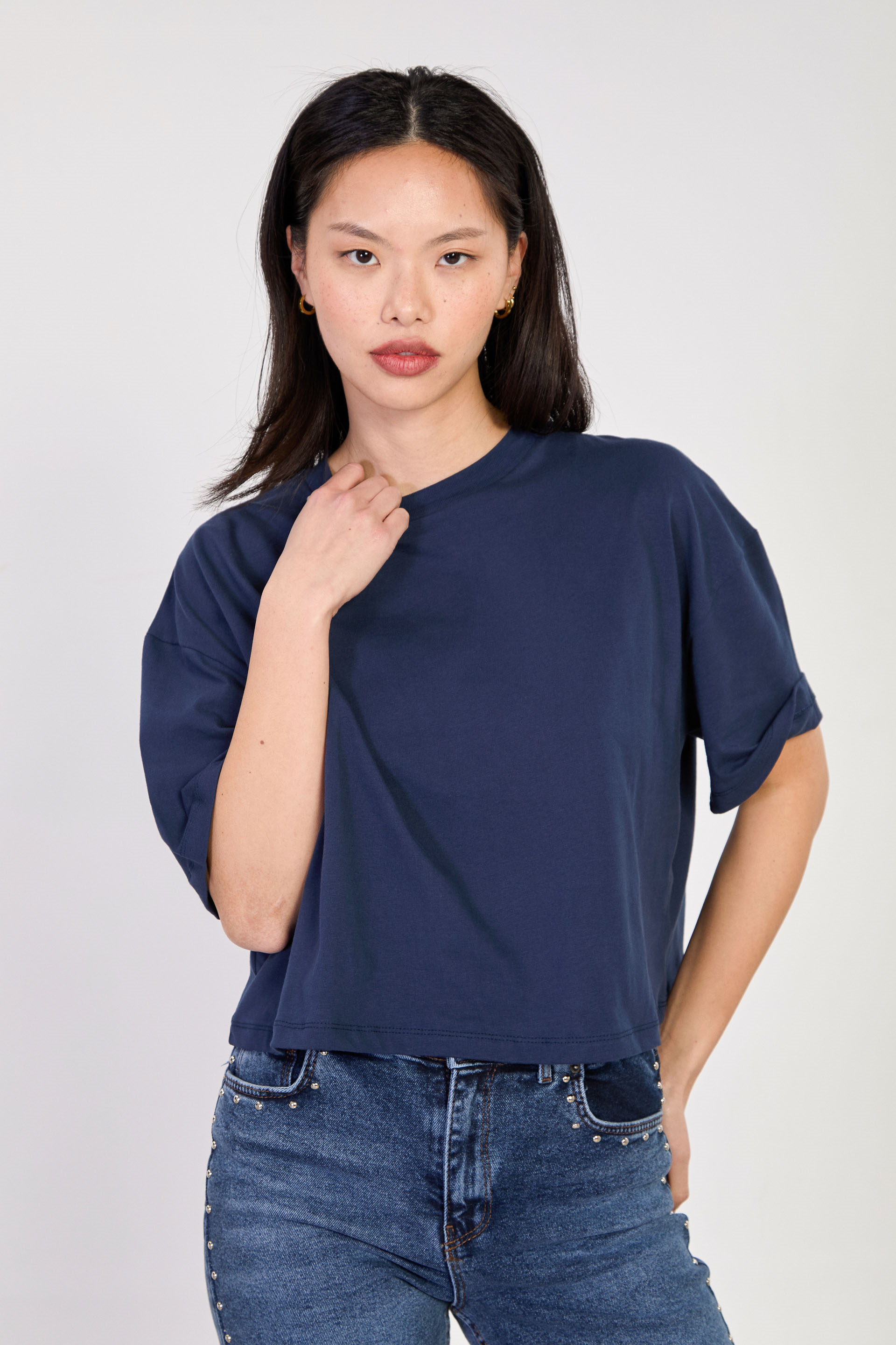 Kadın Bisiklet Yaka Kısa Oversize T-Shirt - Lacivert
