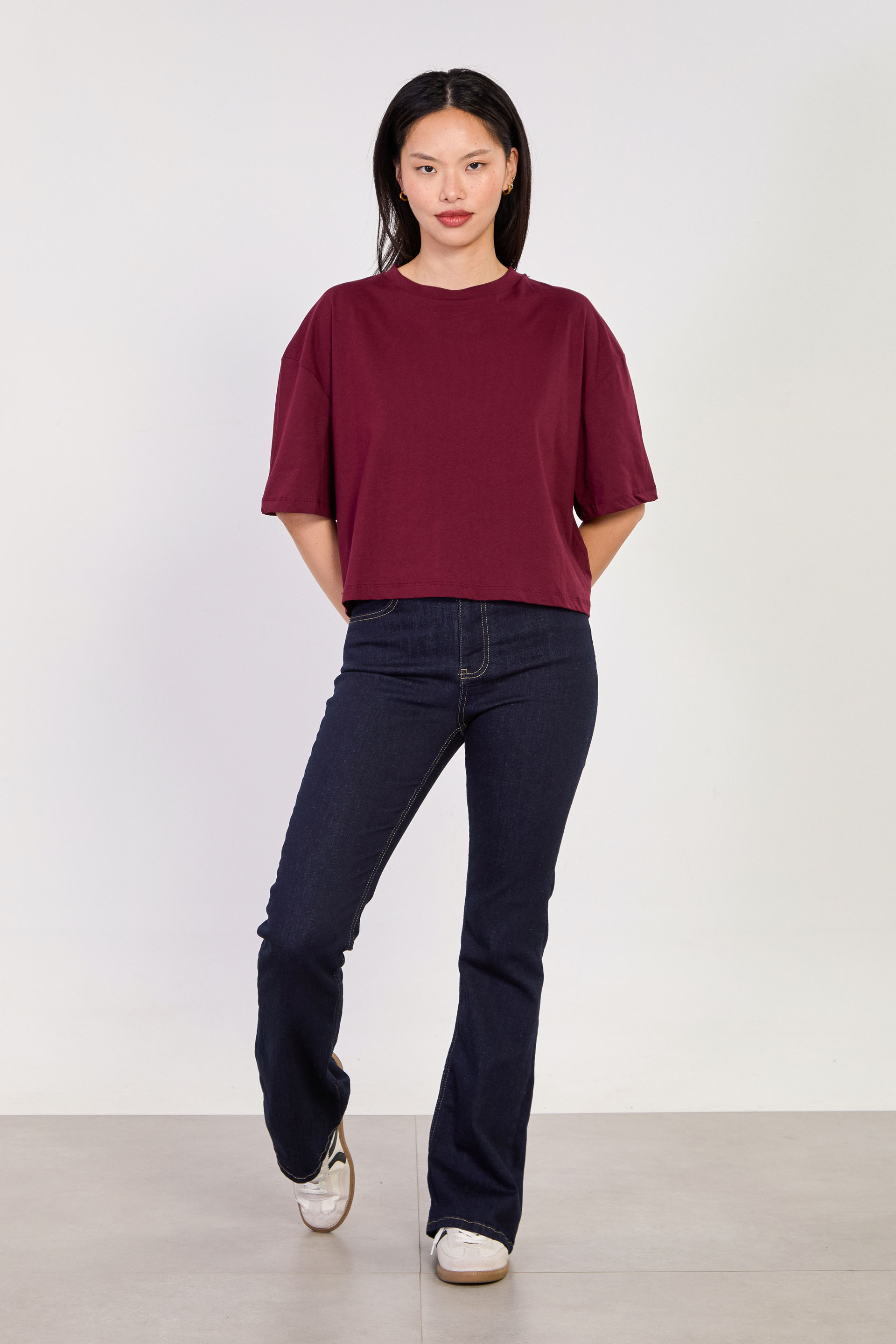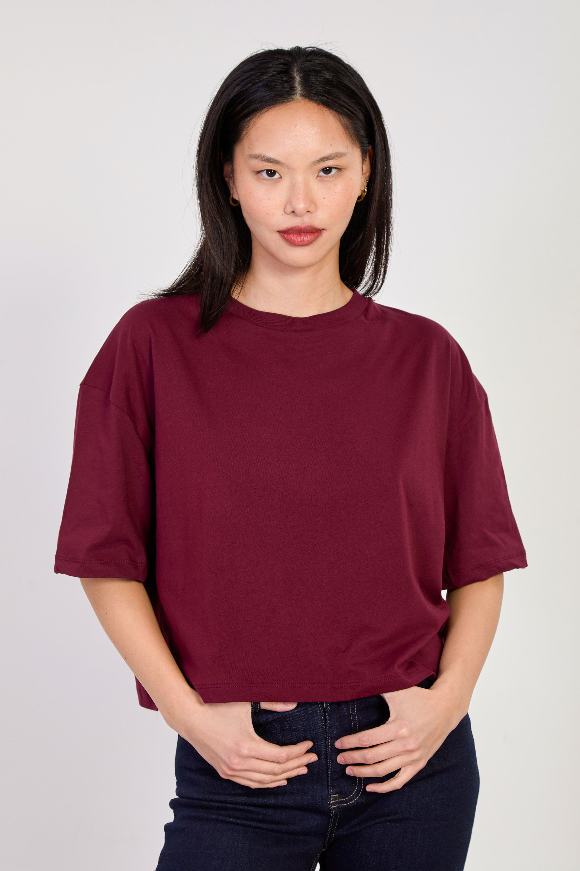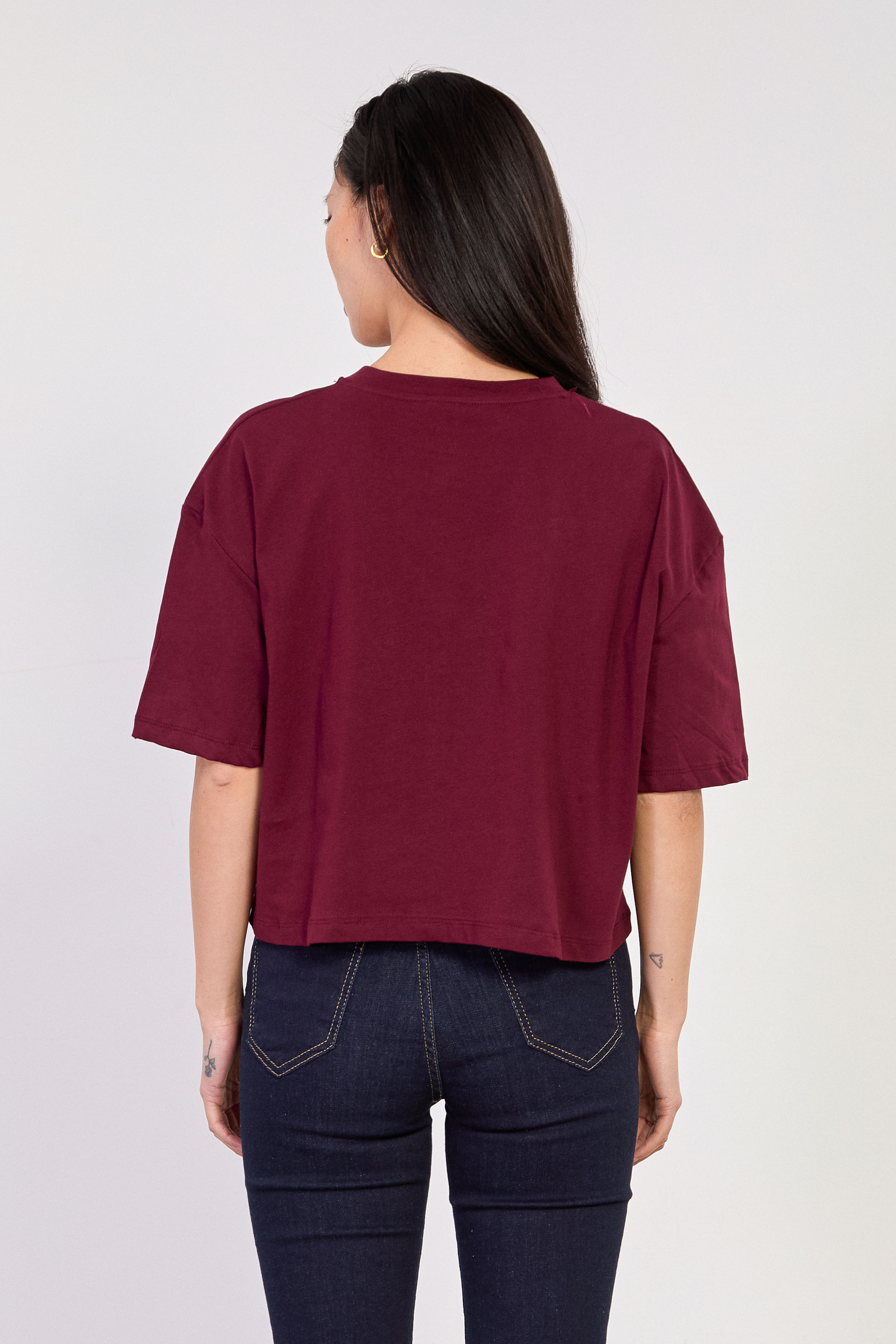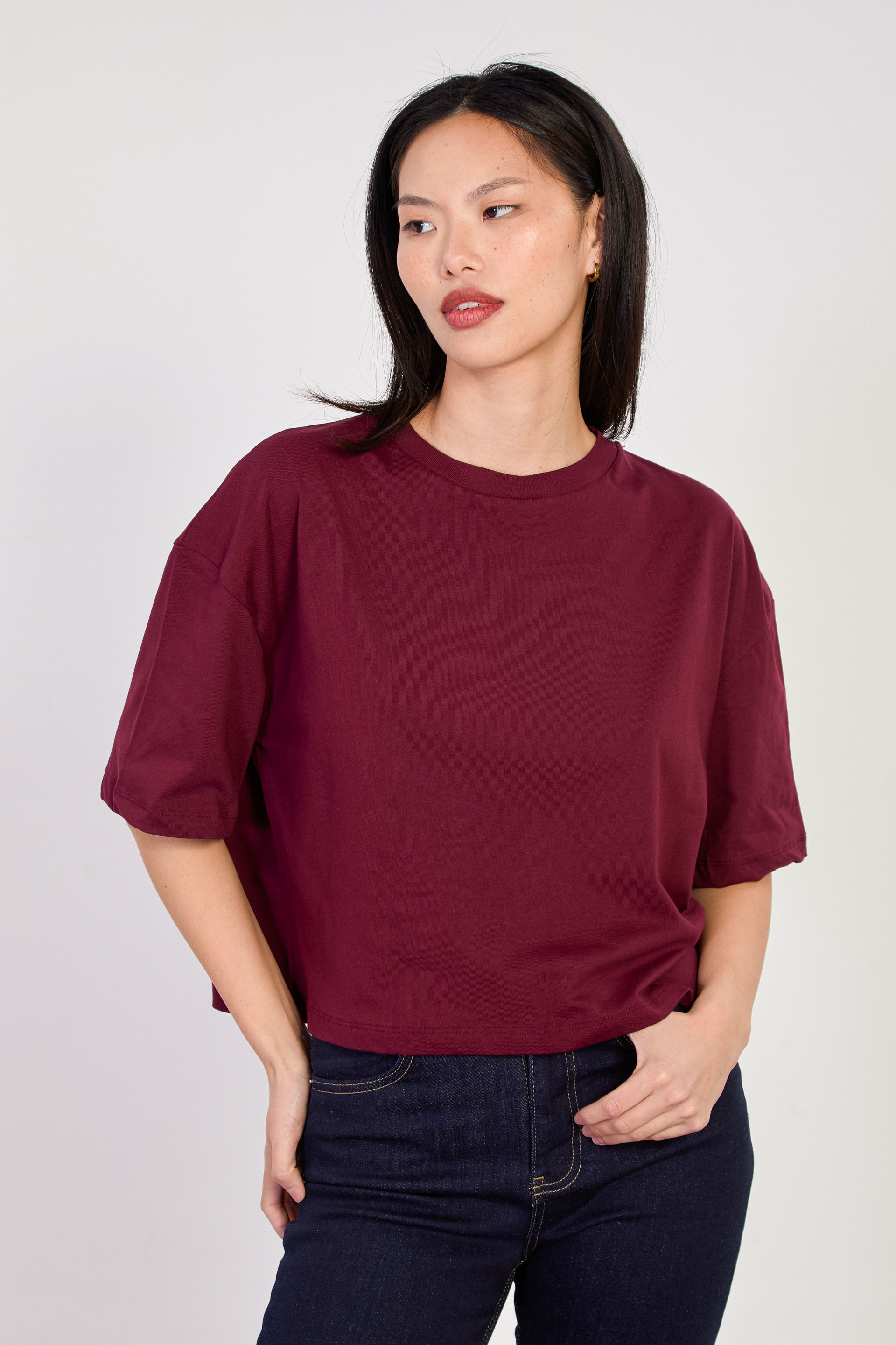 Kadın Bisiklet Yaka Kısa Oversize T-Shirt - Mürdüm
