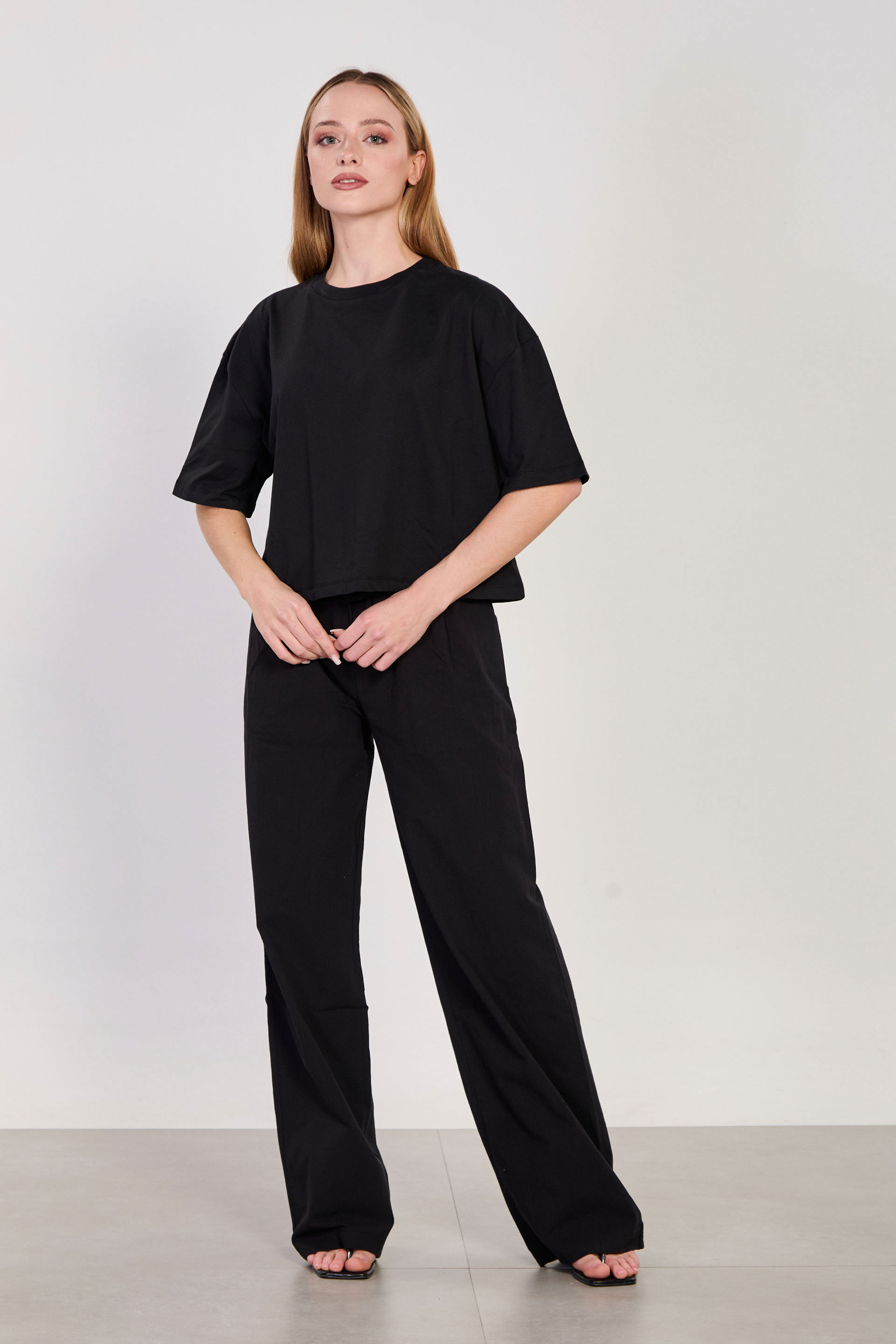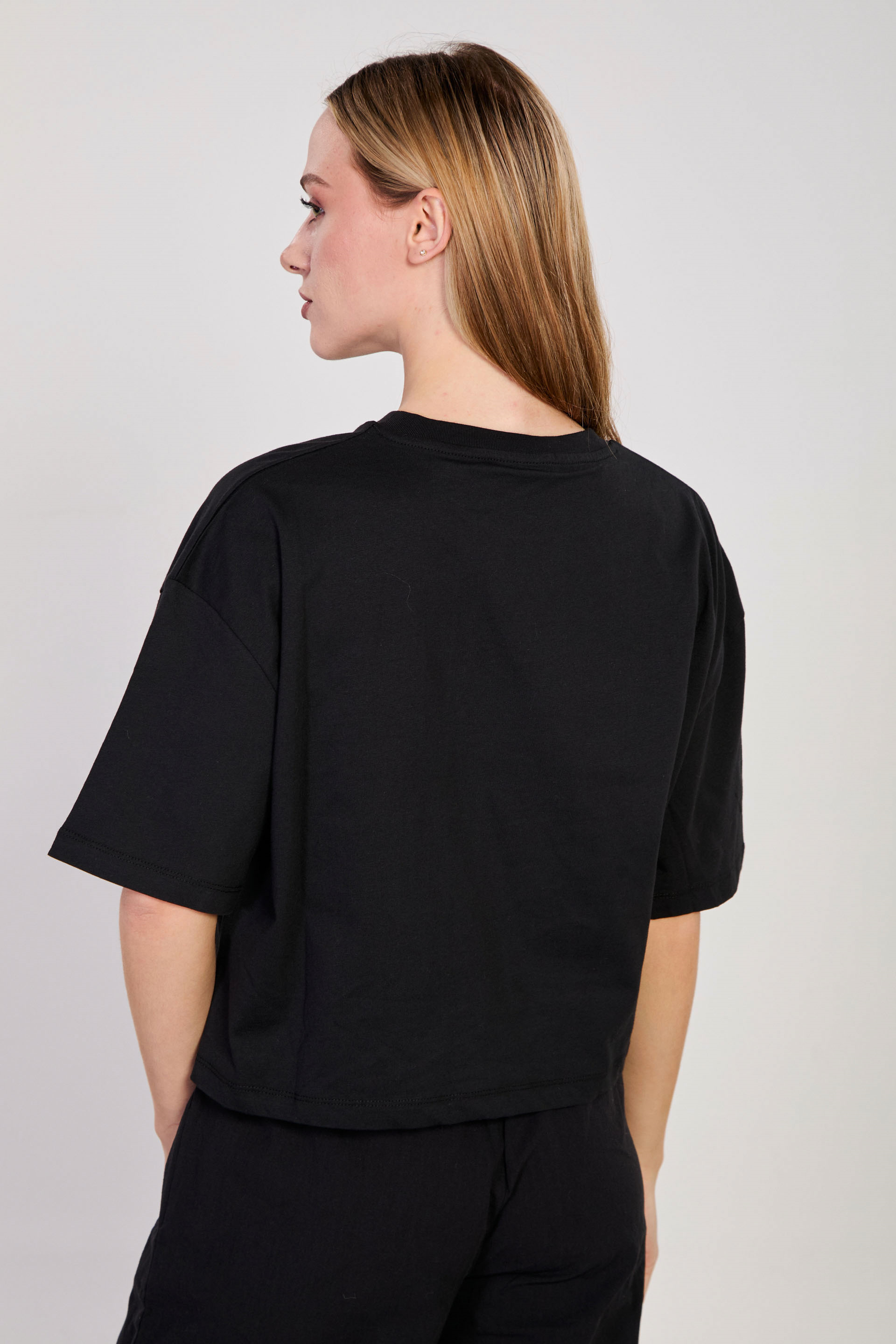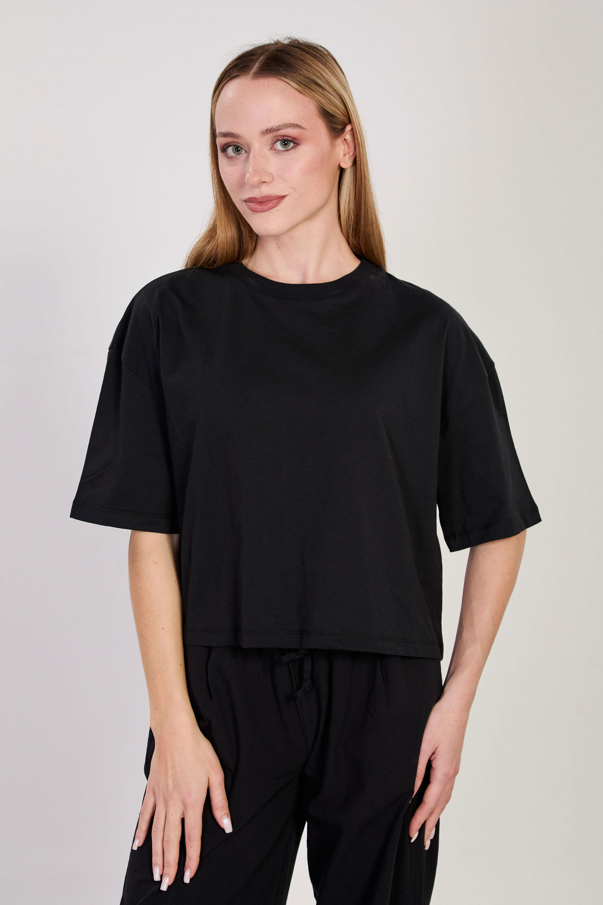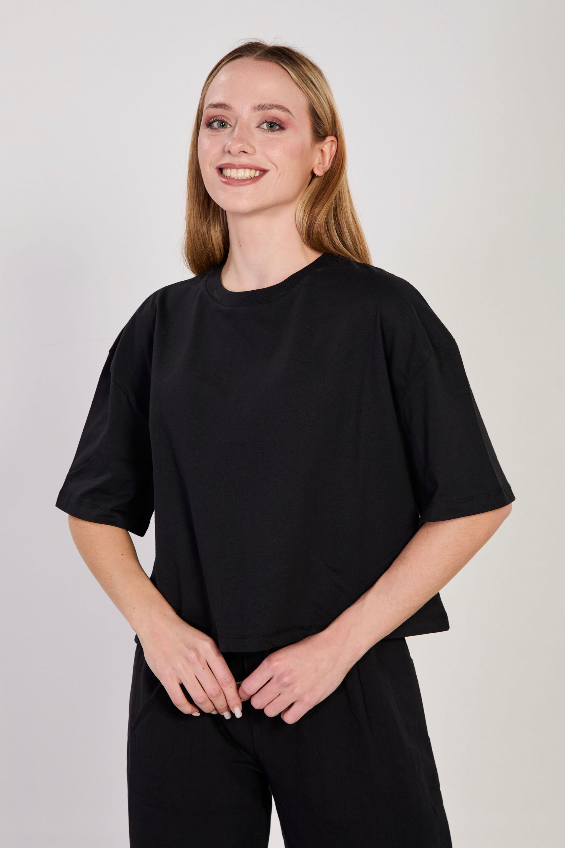 Kadın Bisiklet Yaka Kısa Oversize T-Shirt - Siyah