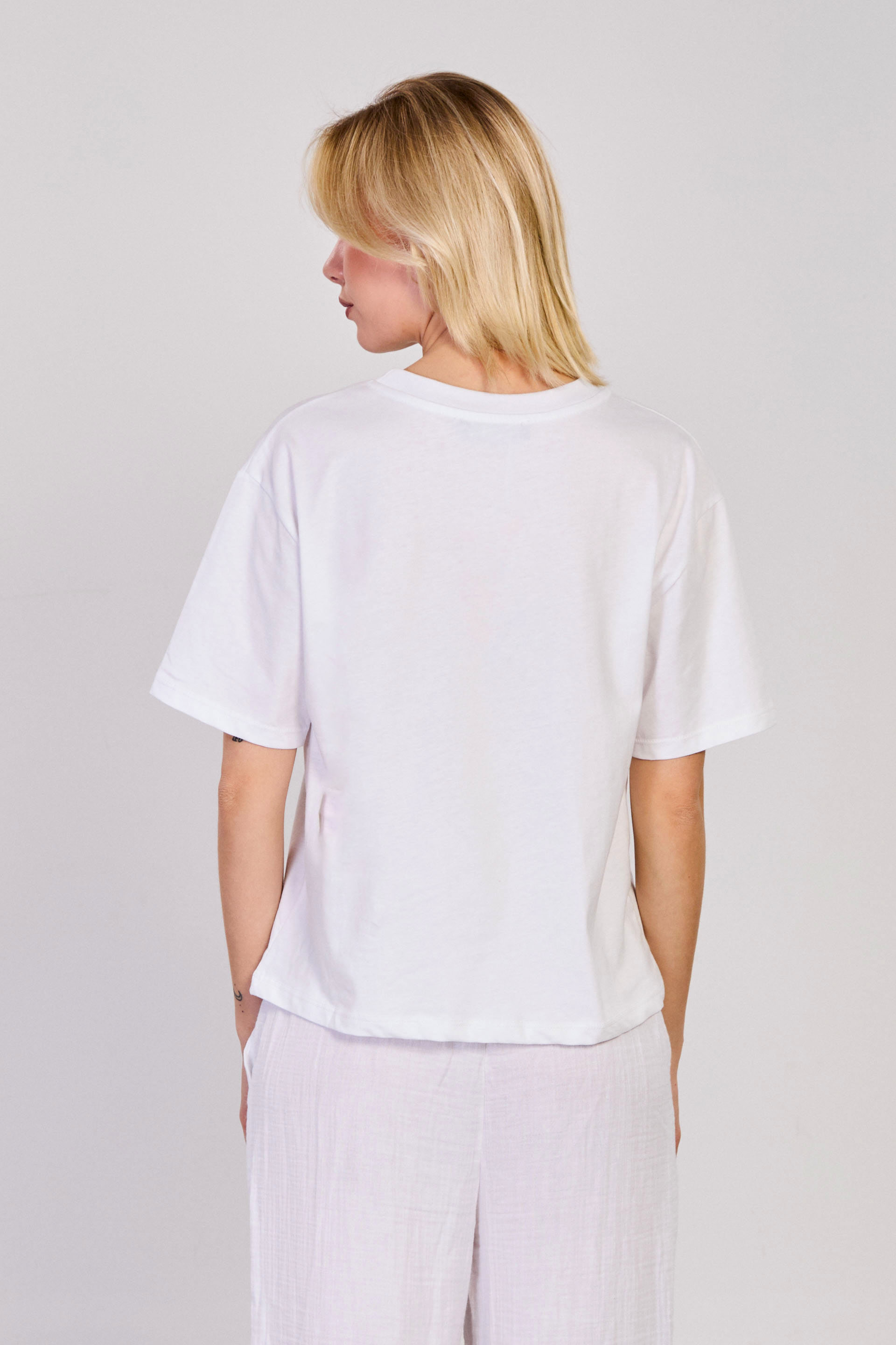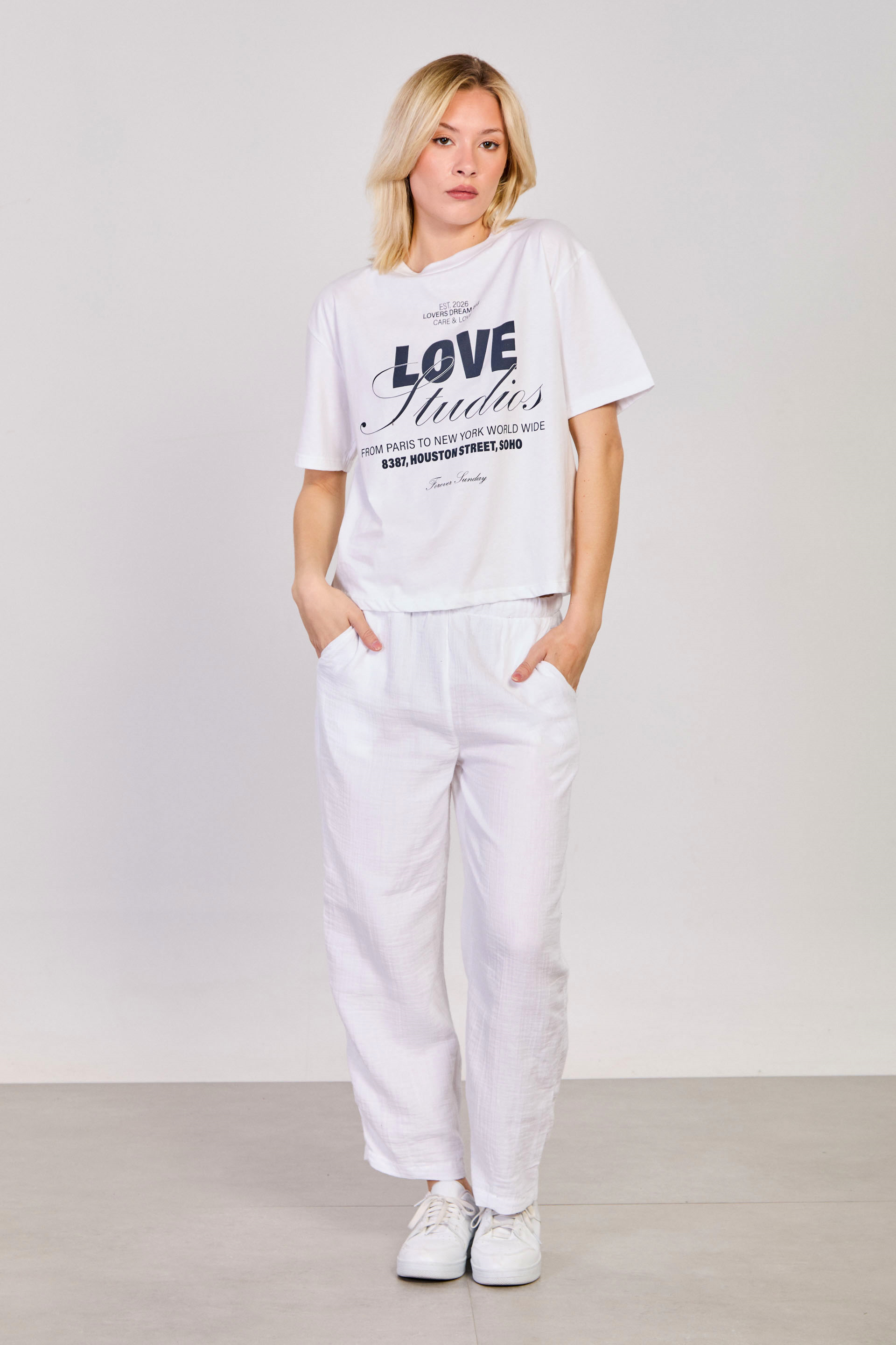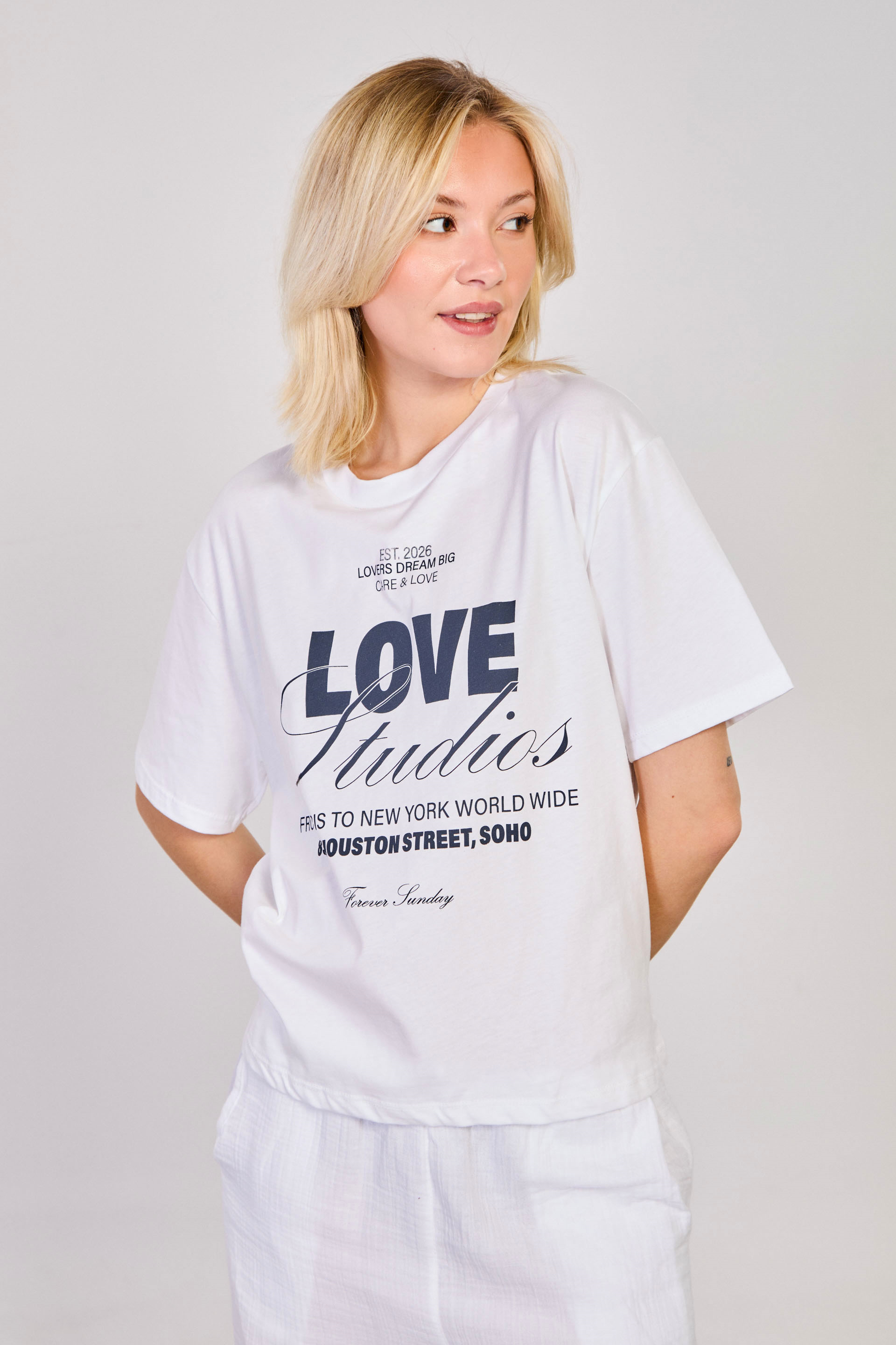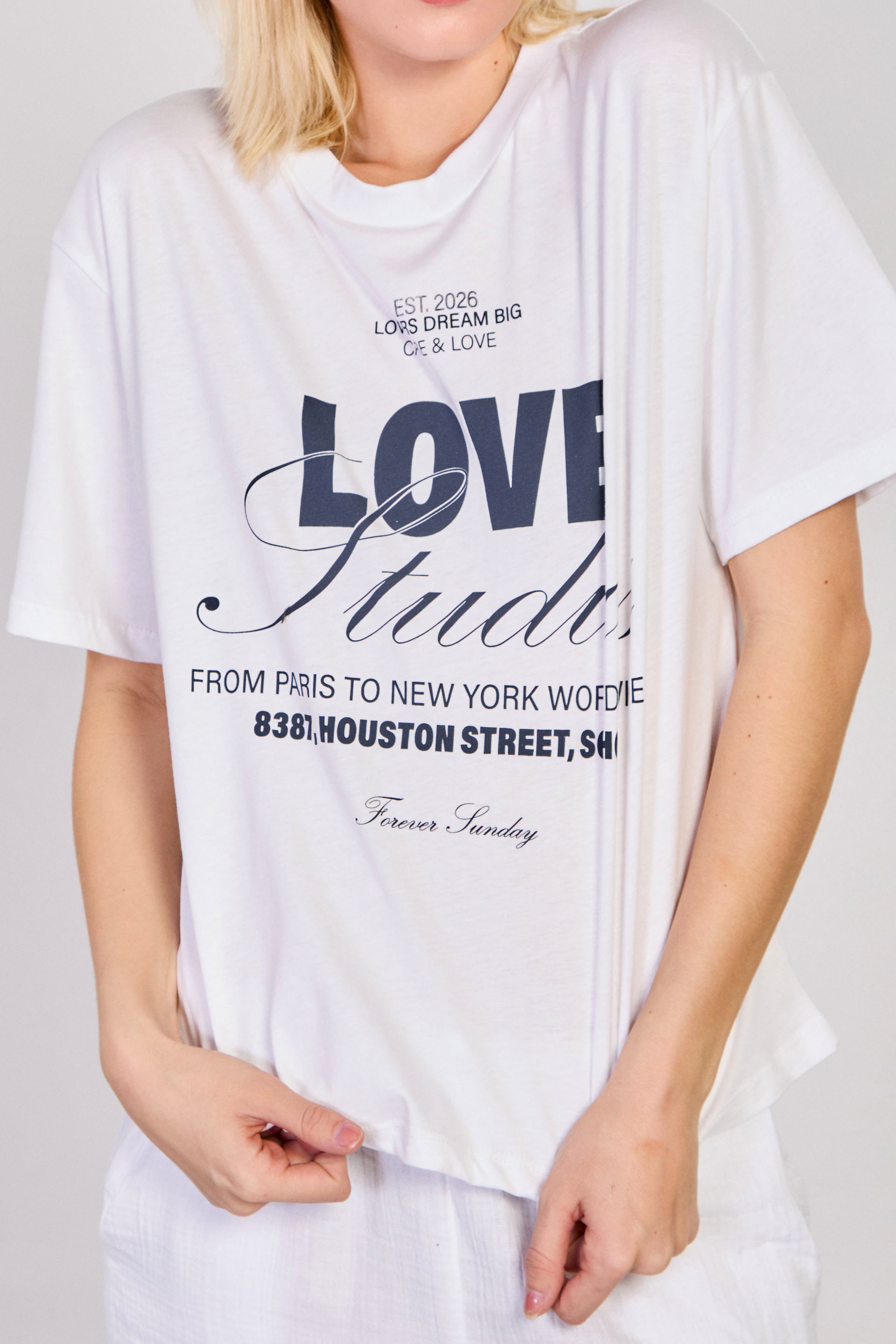 Kadın Bisiklet Yaka Love Studios Yazılı T-Shirt - Beyaz