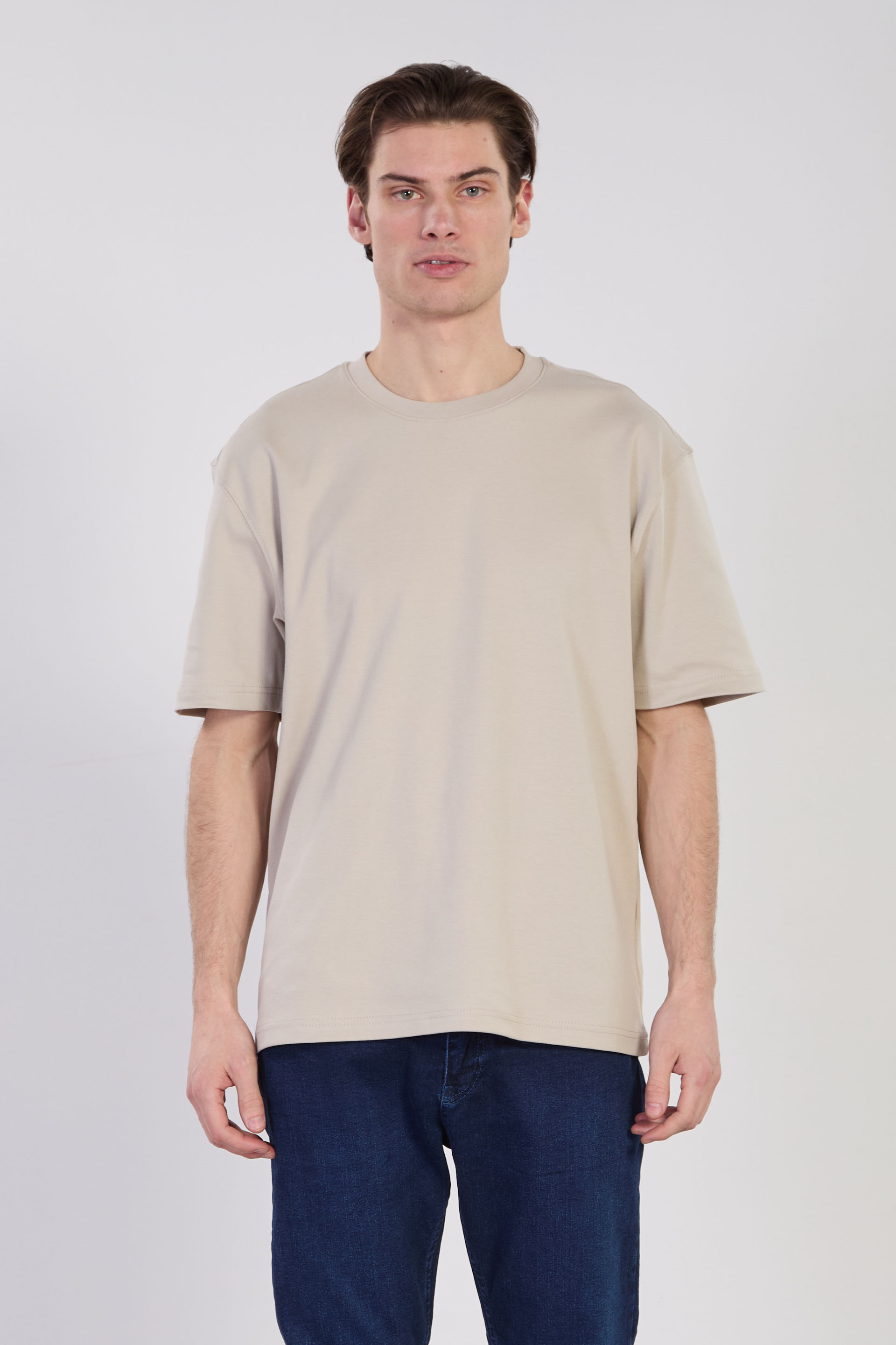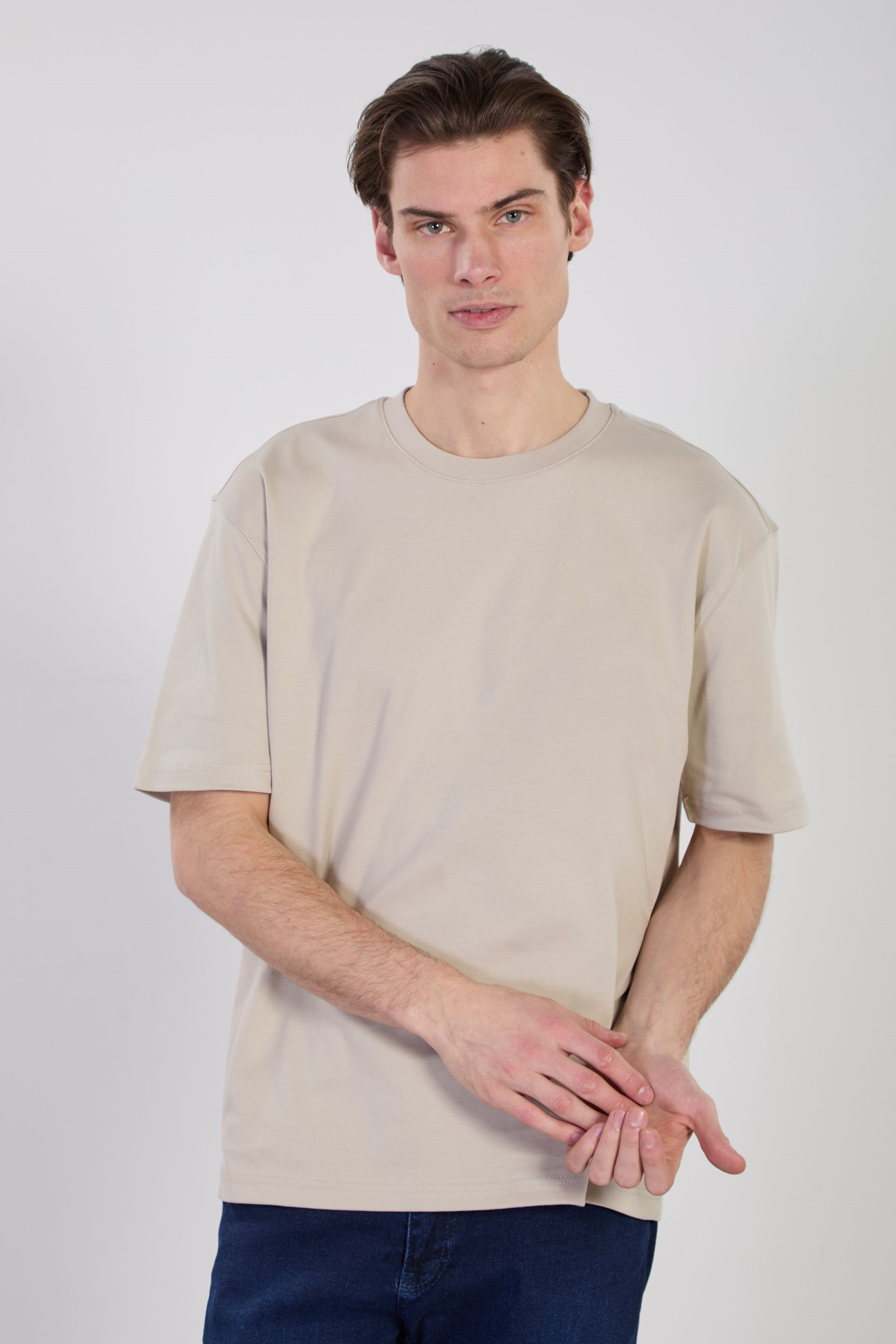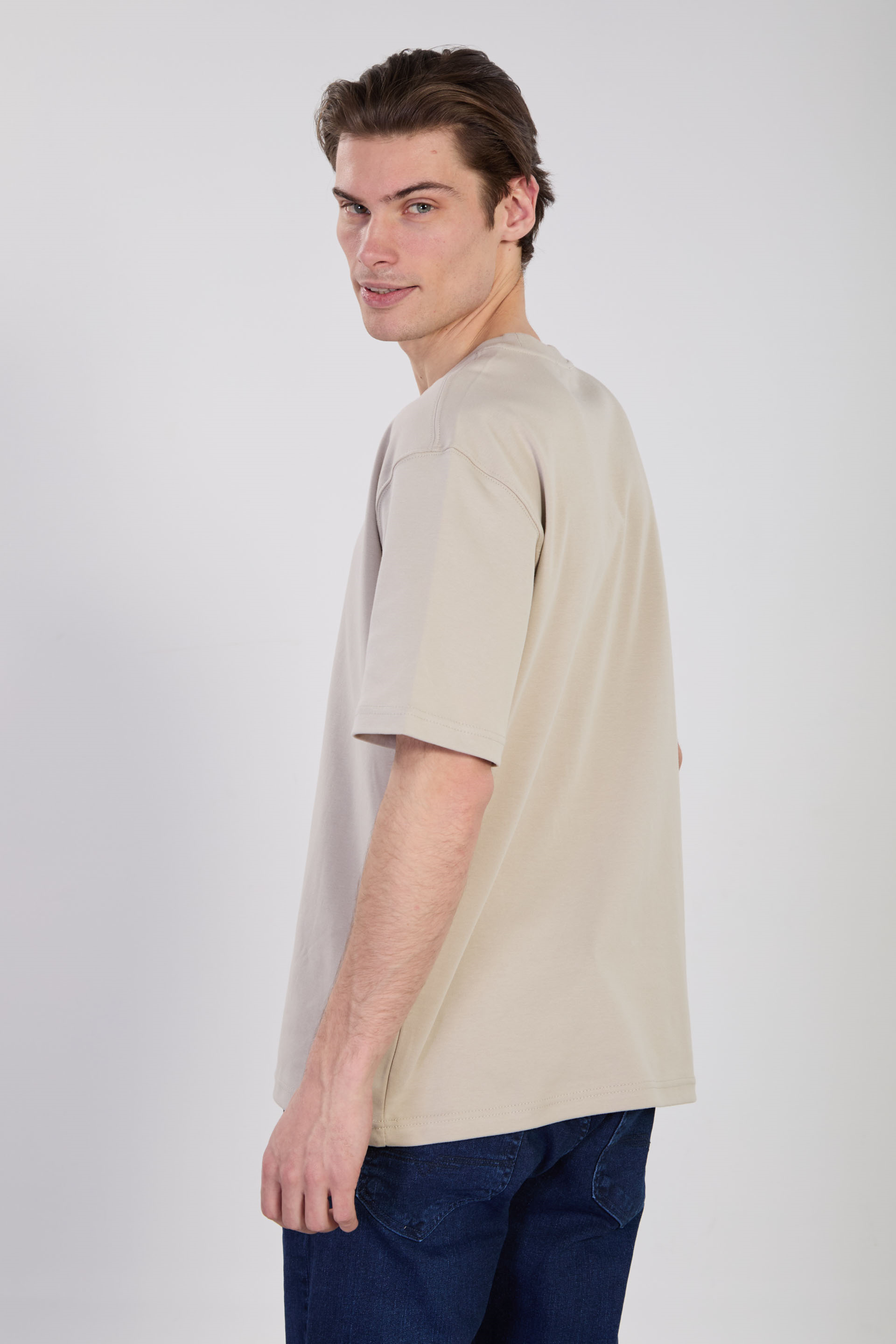Erkek Bisiklet Yaka Oversize T-Shirt - Taş