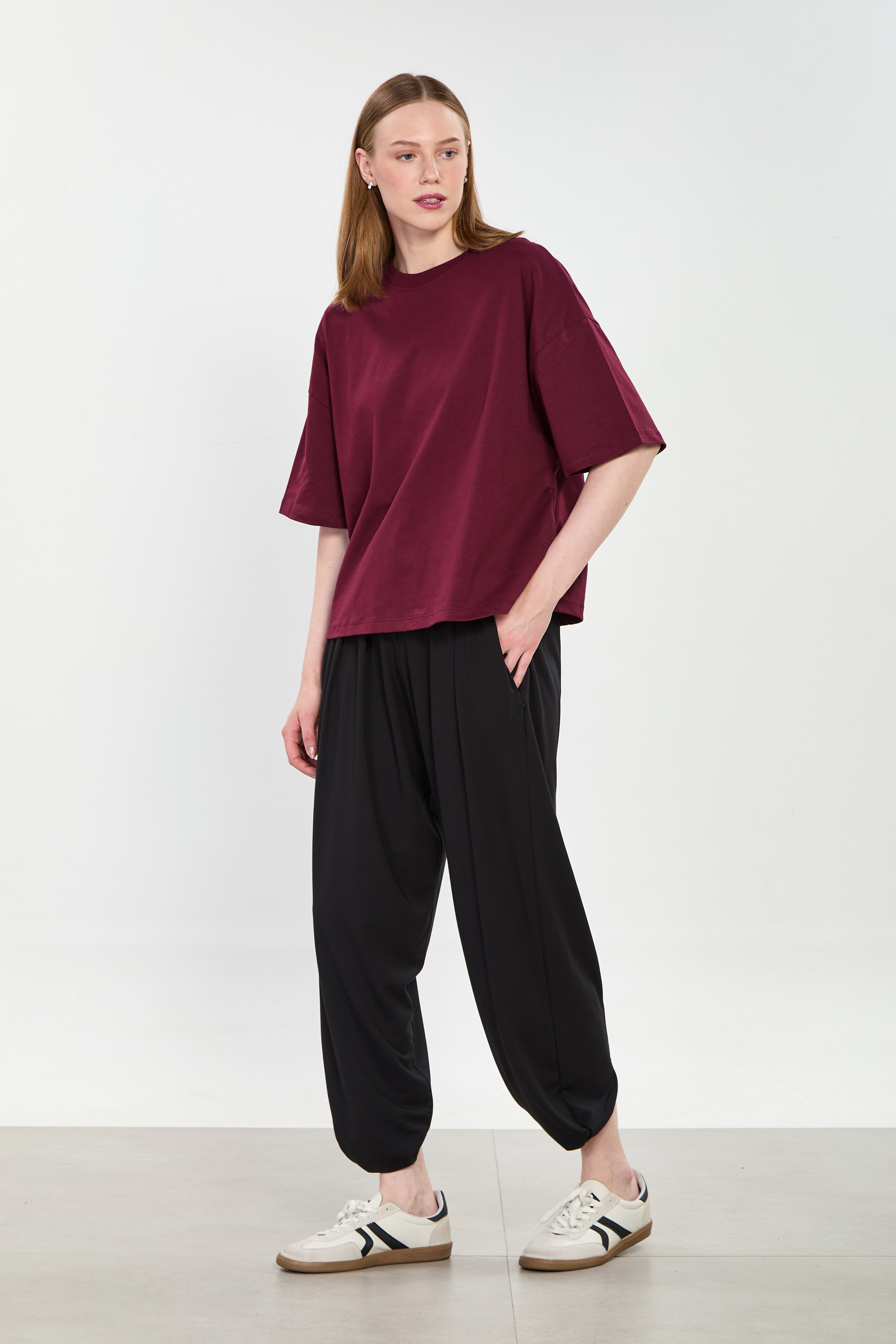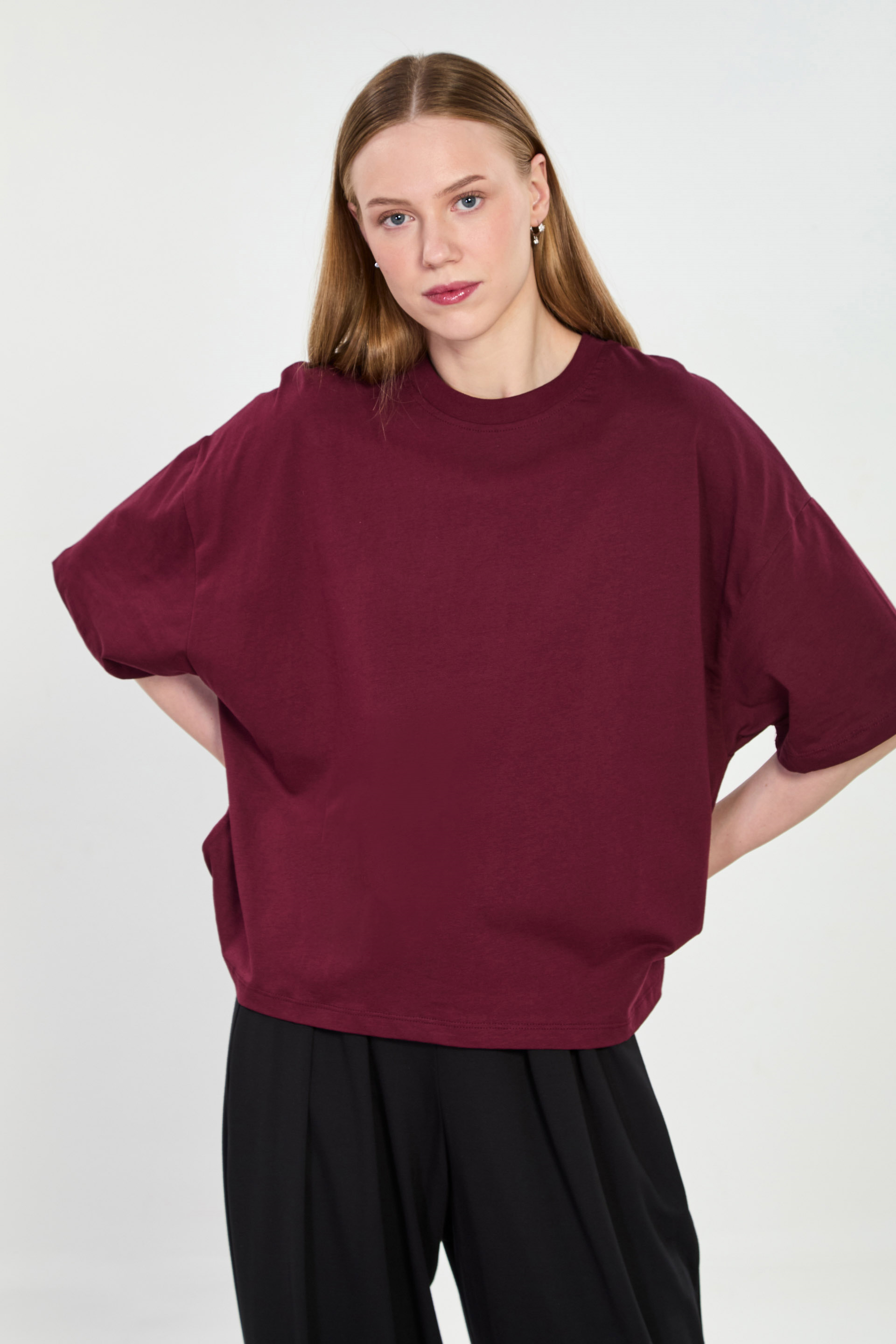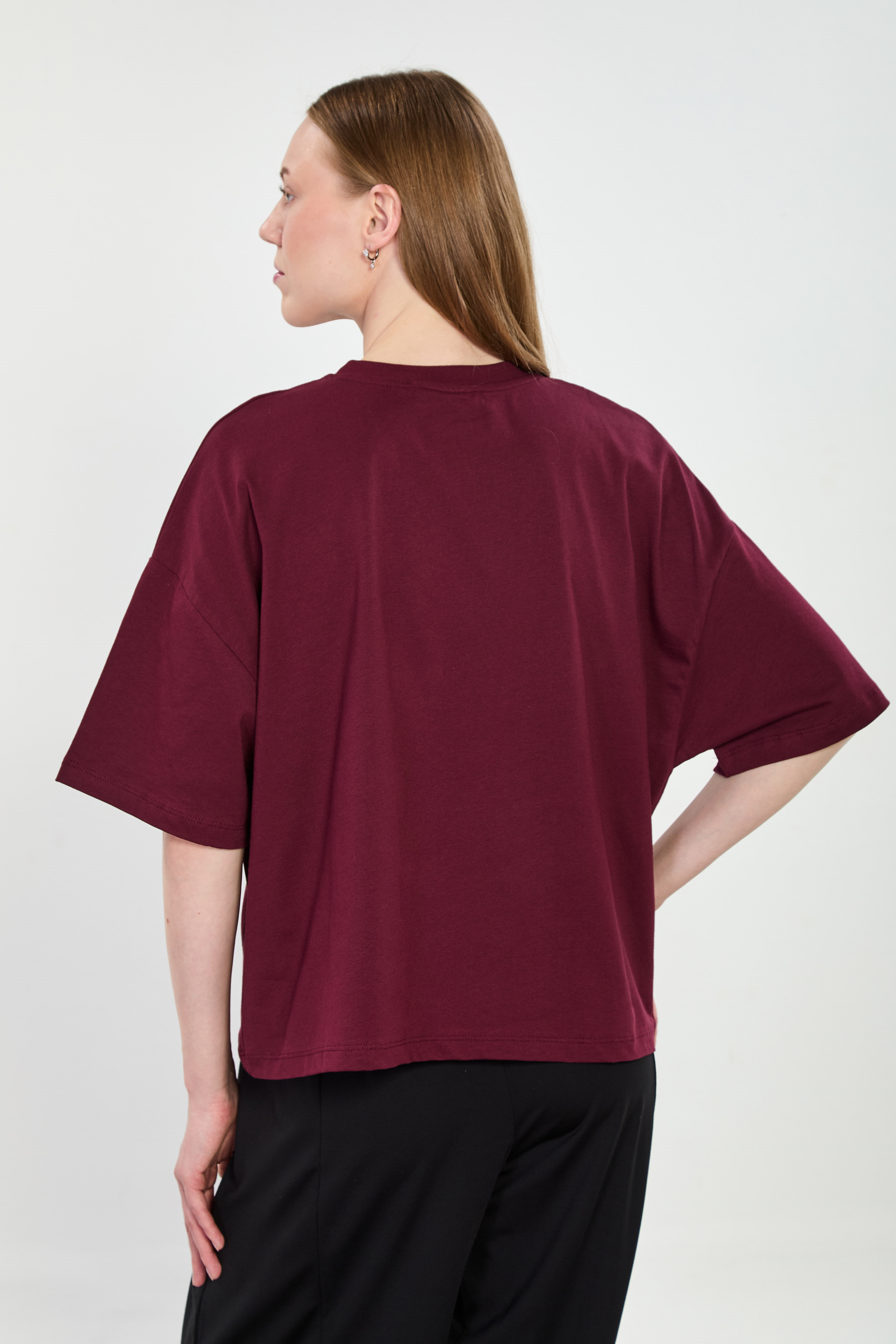 Kadın Bisiklet Yaka Oversize T-Shirt - Mürdüm
