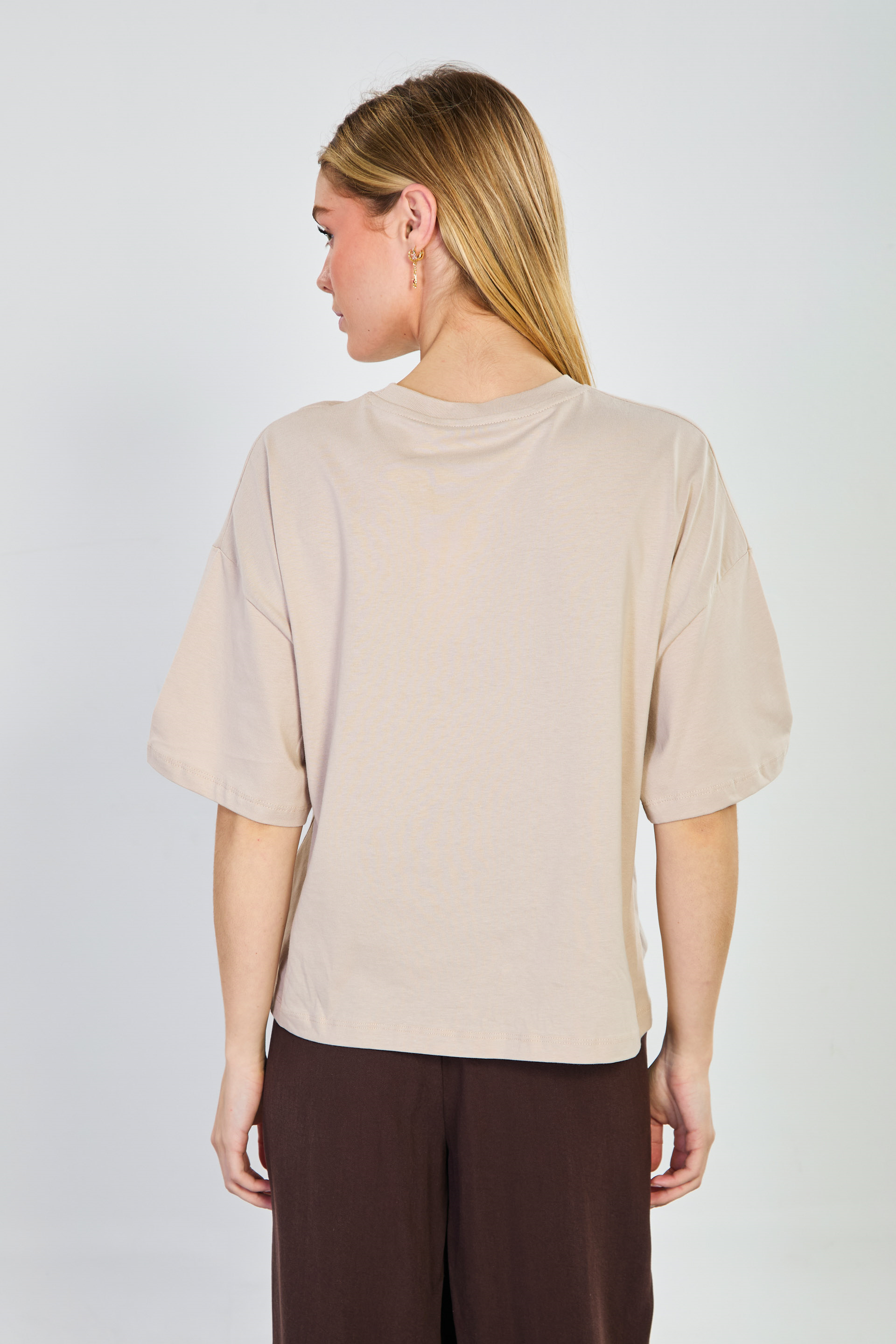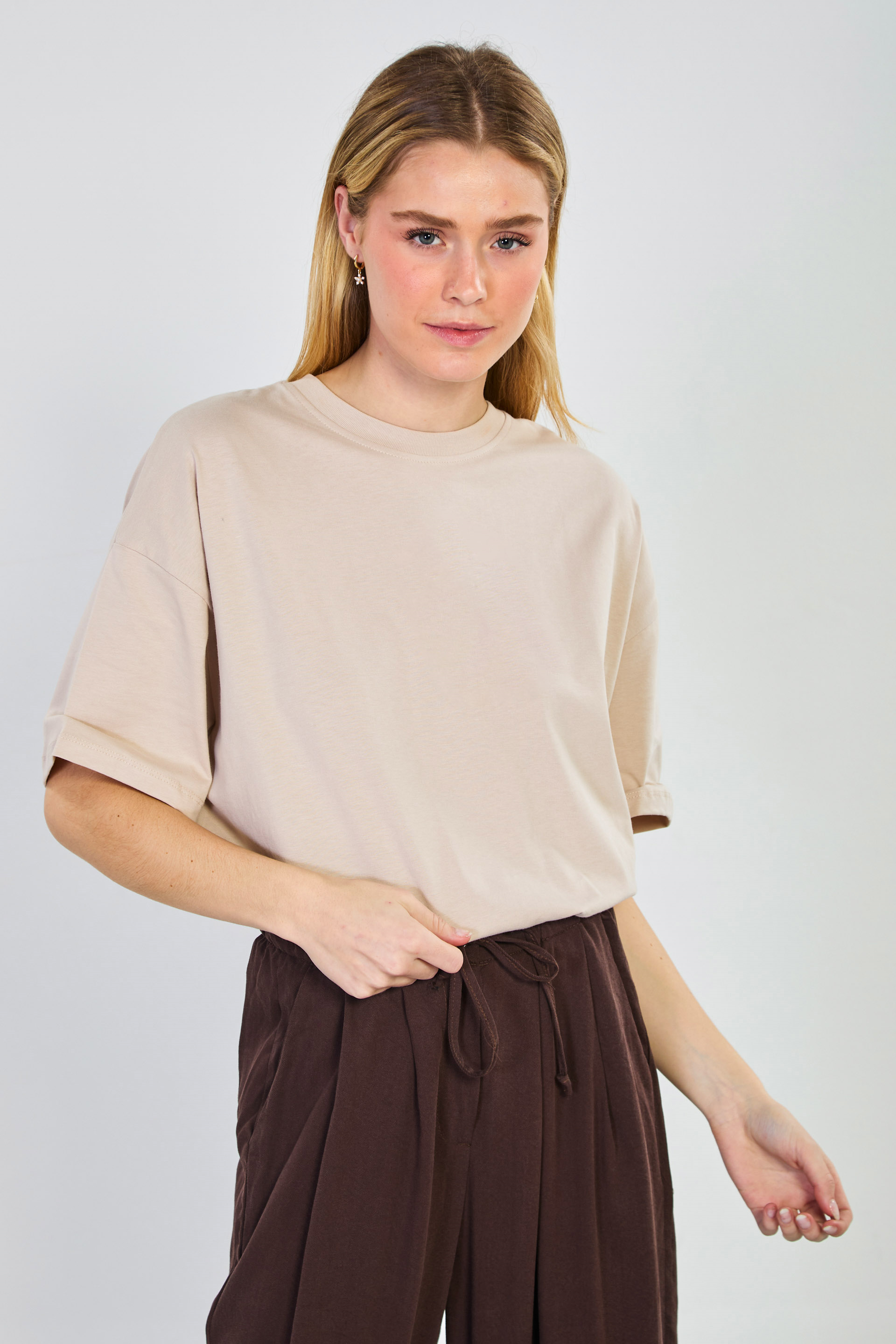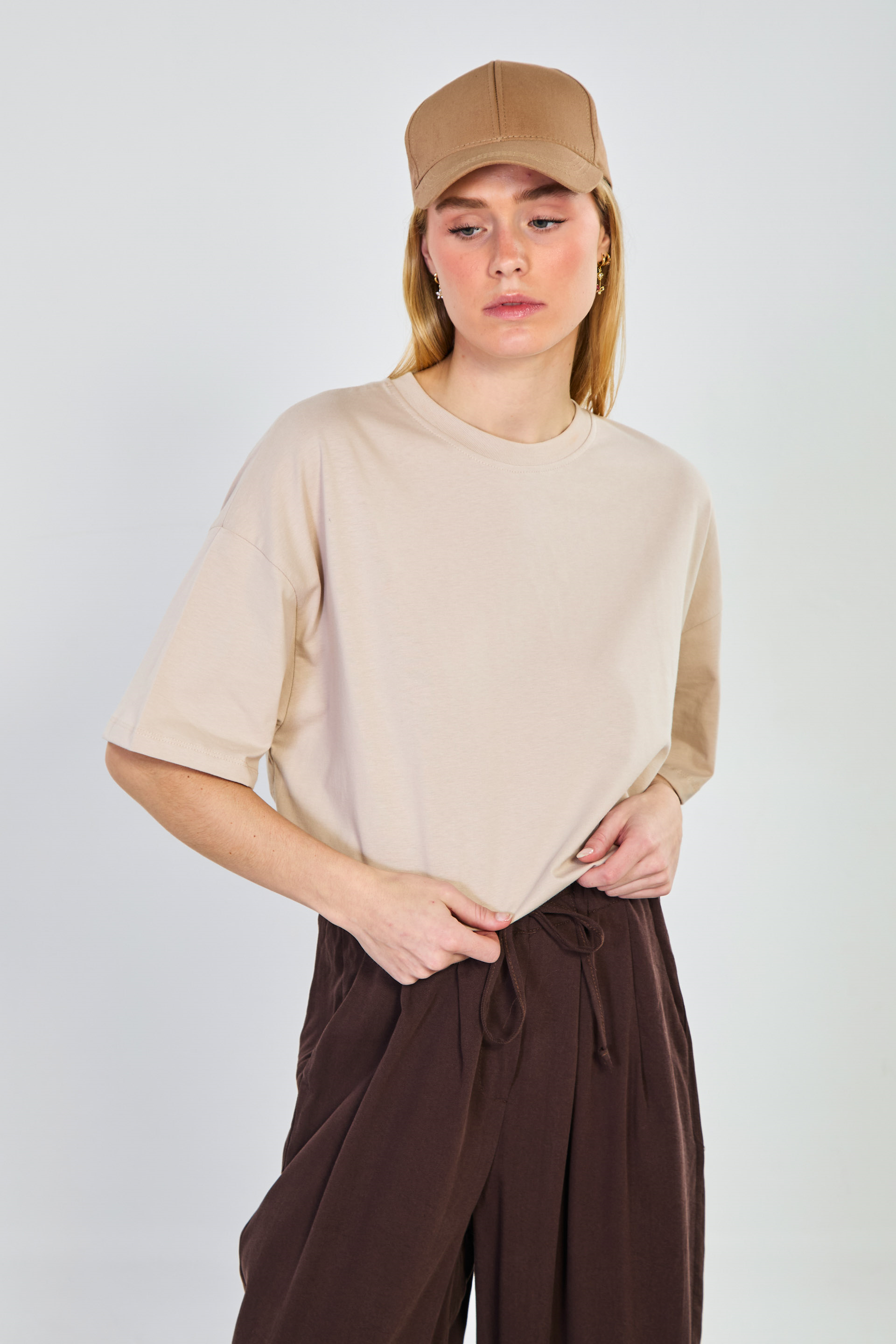 Kadın Bisiklet Yaka Oversize T-Shirt - Taş