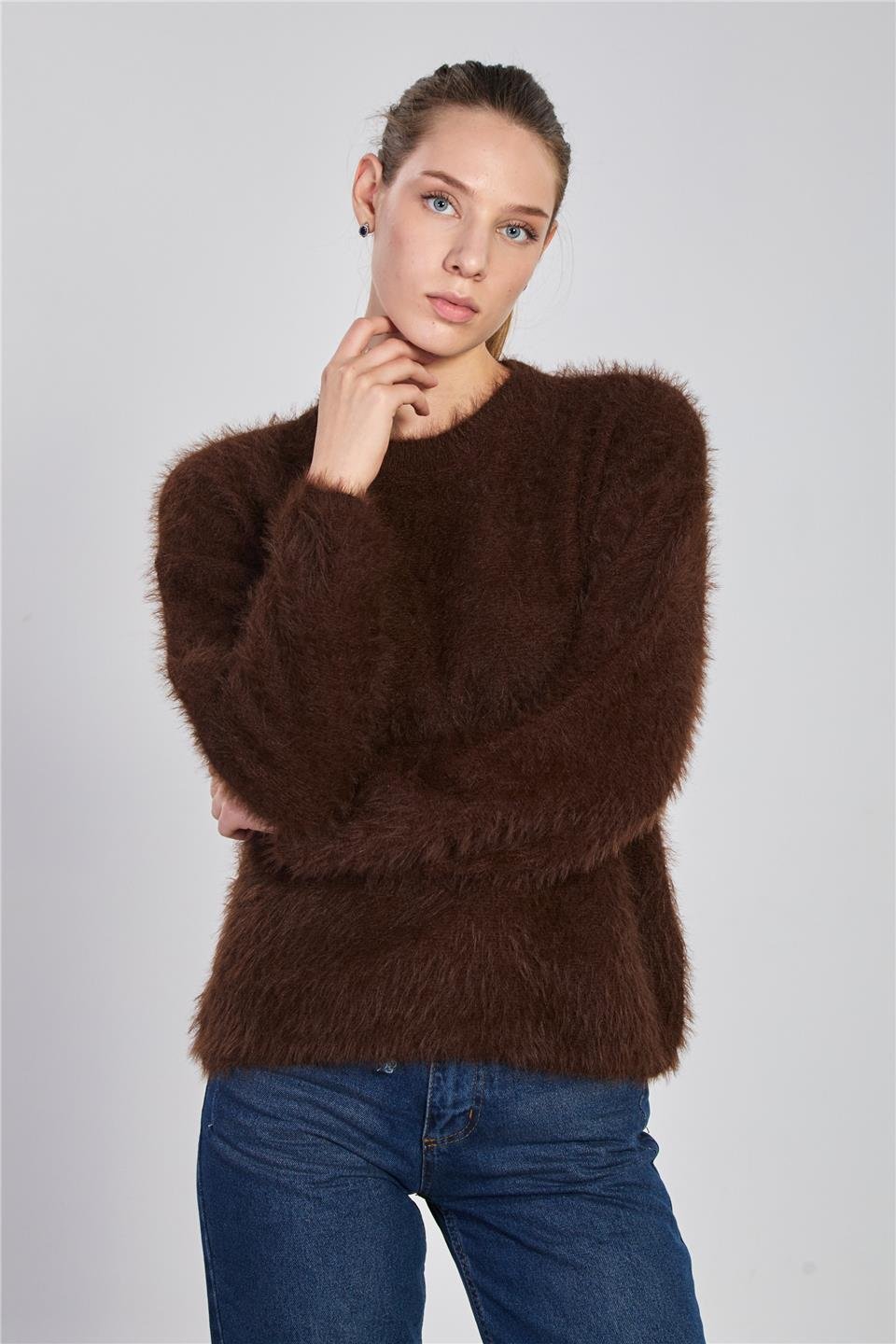 Kadın Bisiklet Yaka Sakallı Triko Kazak - Kahve