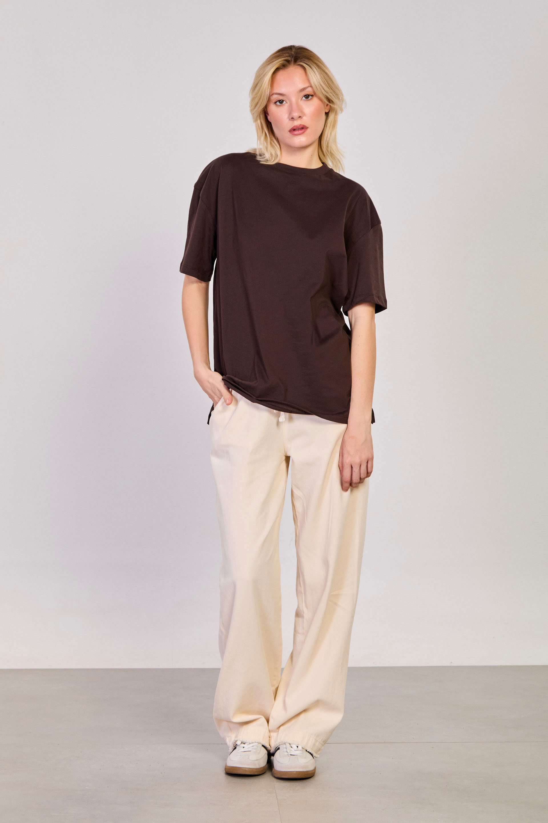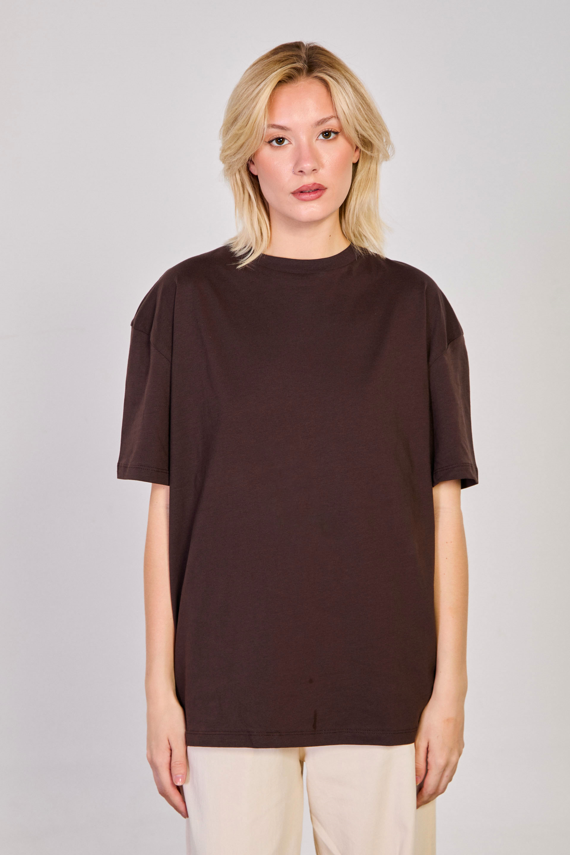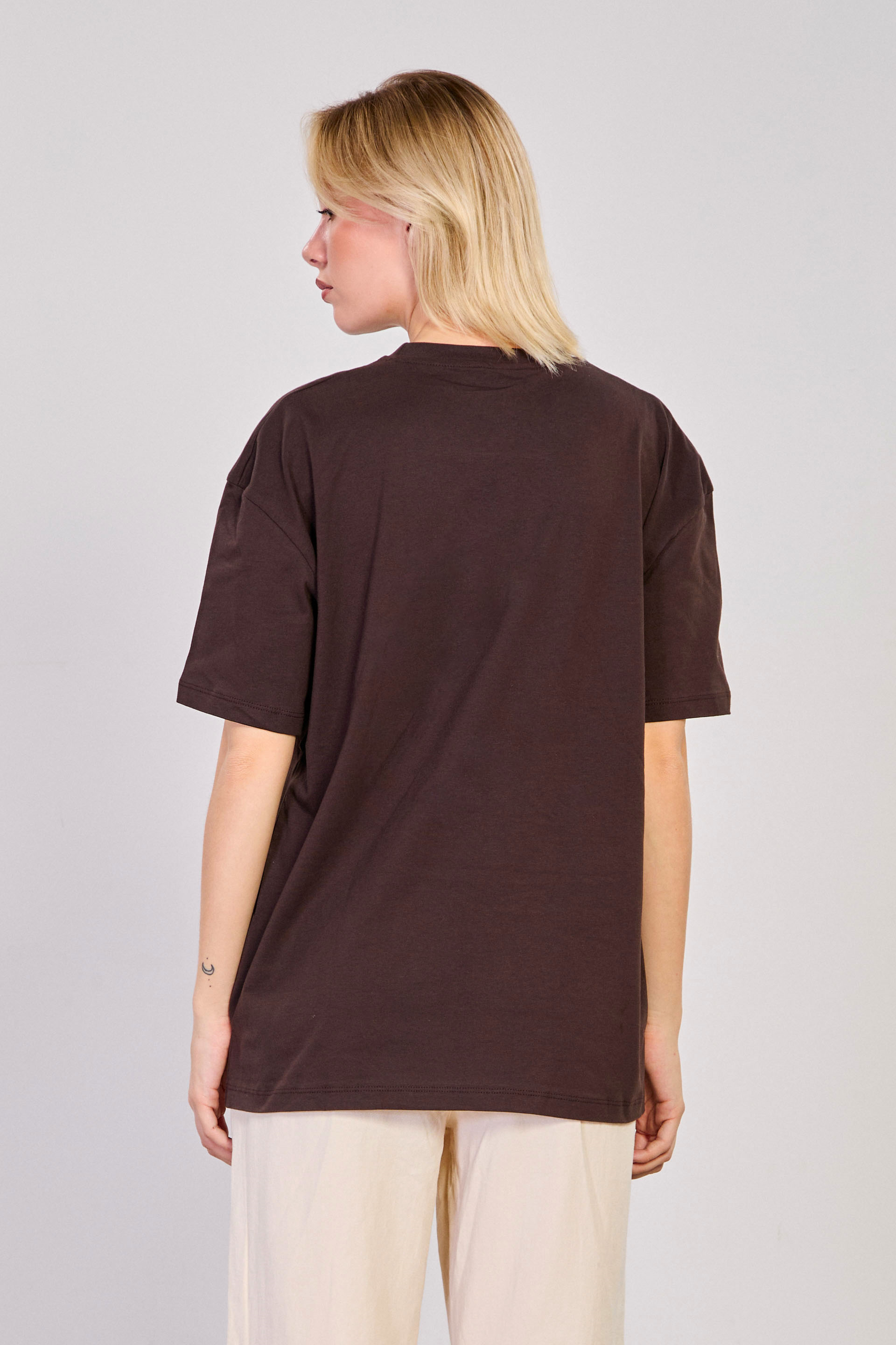 Yaka Bisiklet Yaka Yanı Yırtmaçlı Basic T-Shirt - Acı kahve