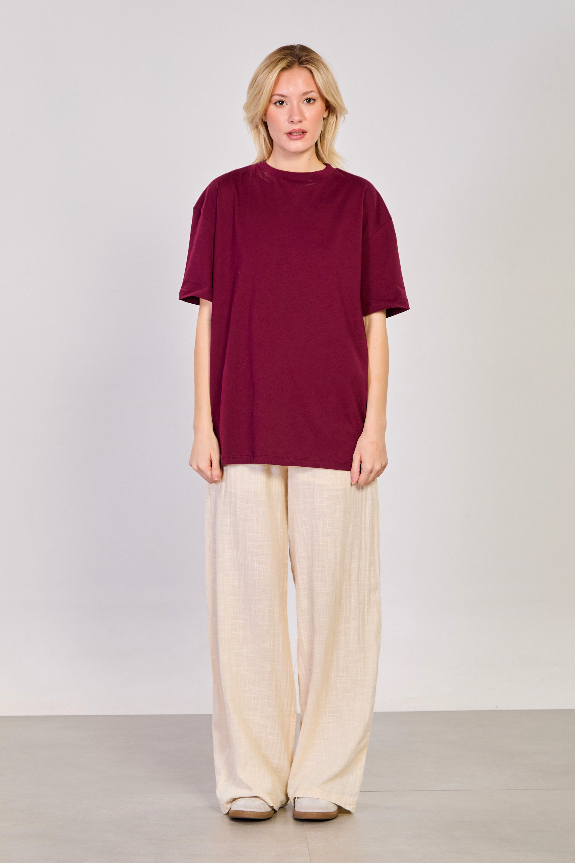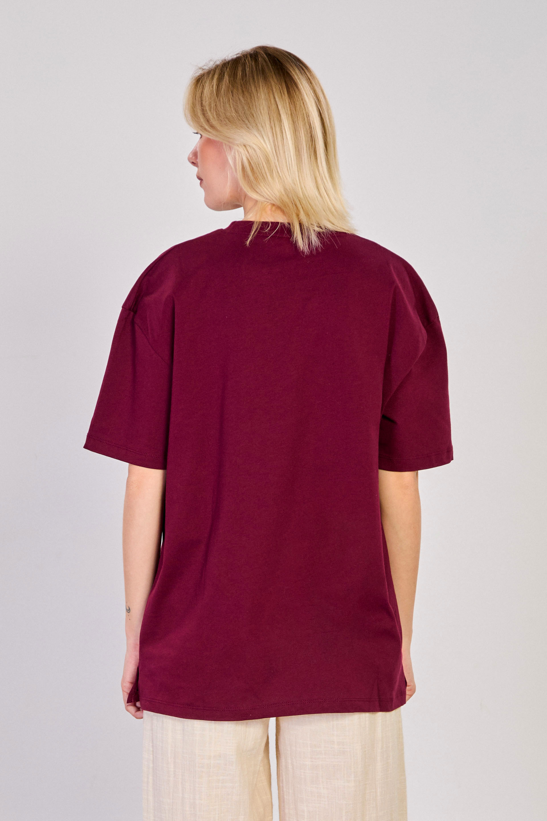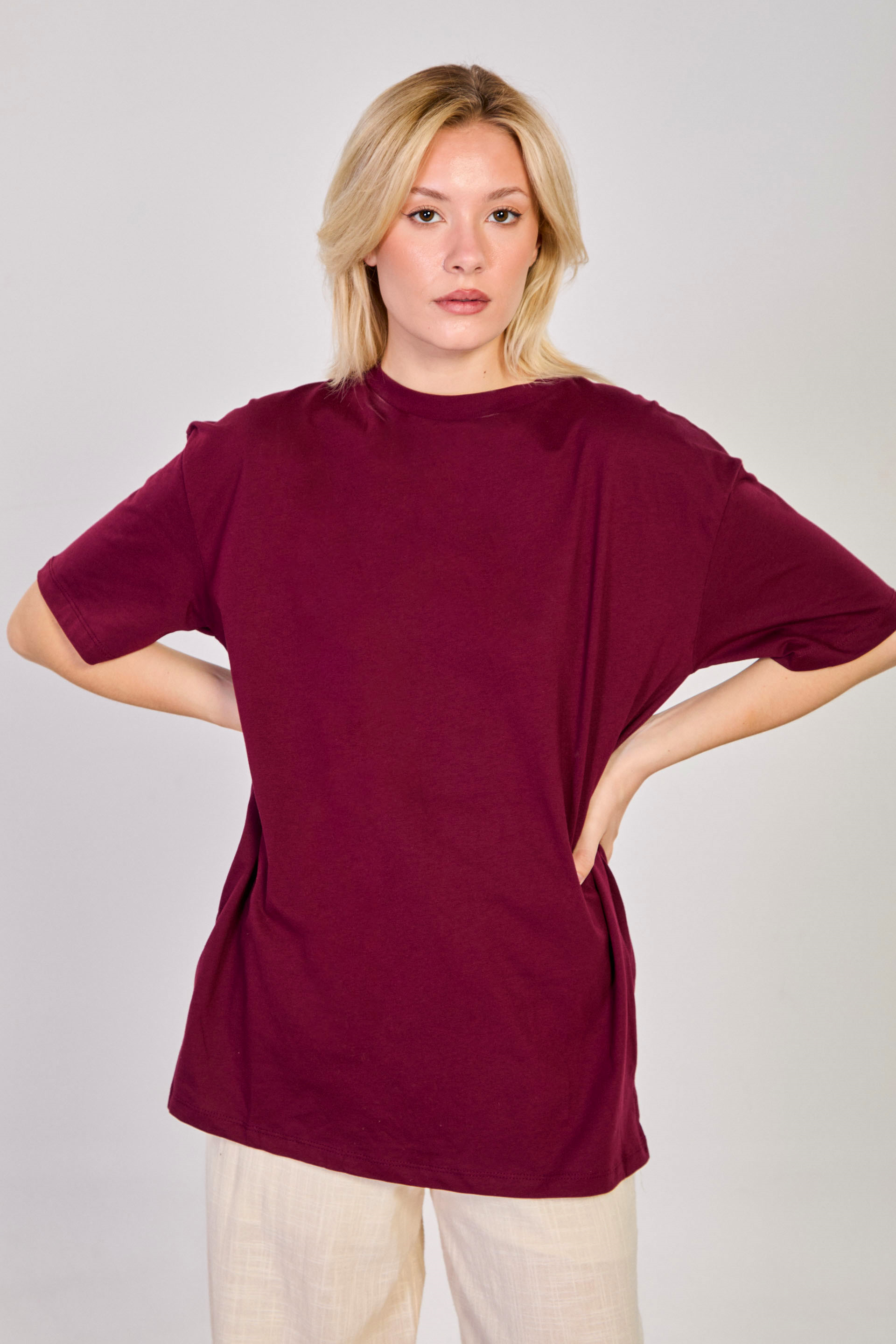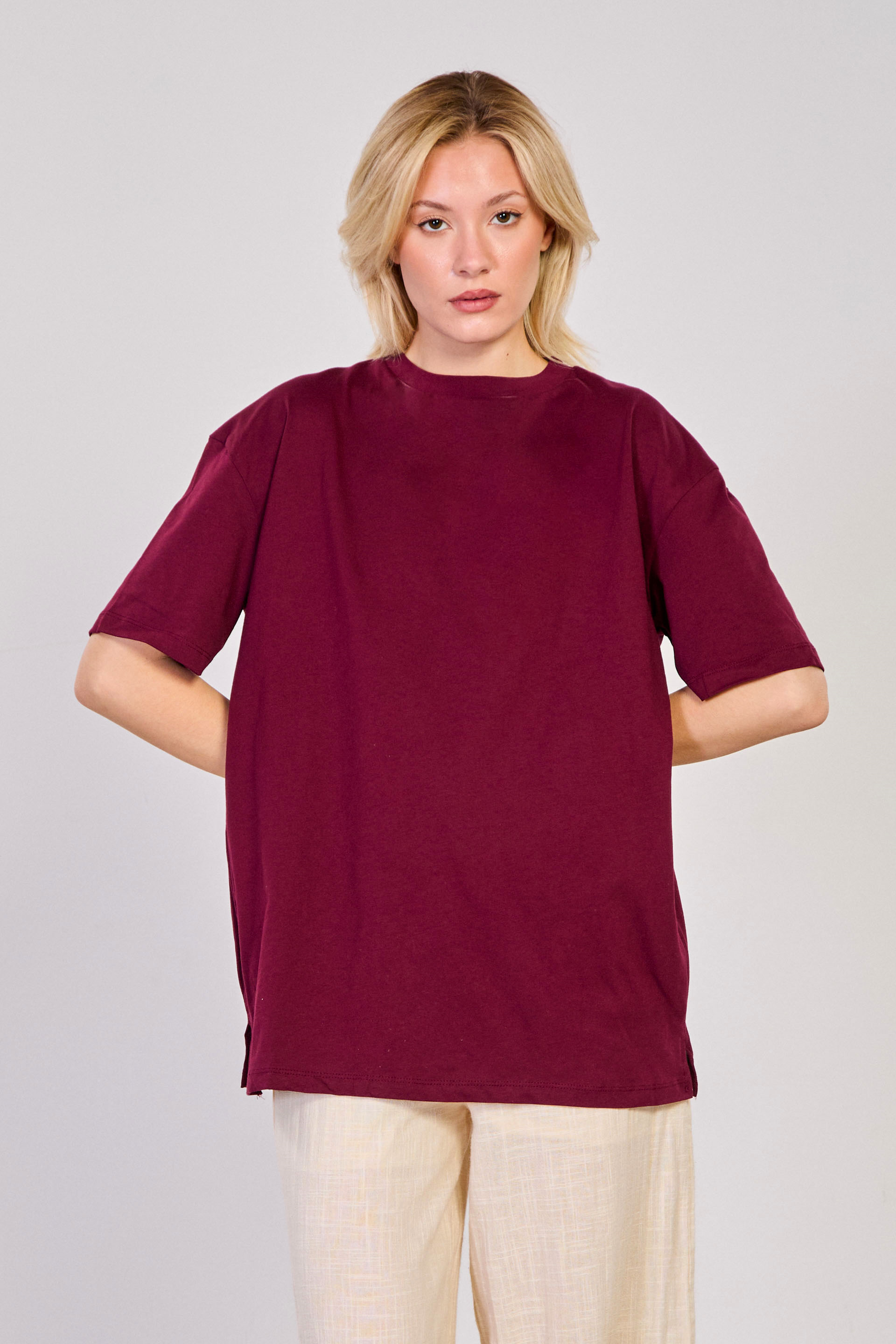 Yaka Bisiklet Yaka Yanı Yırtmaçlı Basic T-Shirt - Mürdüm