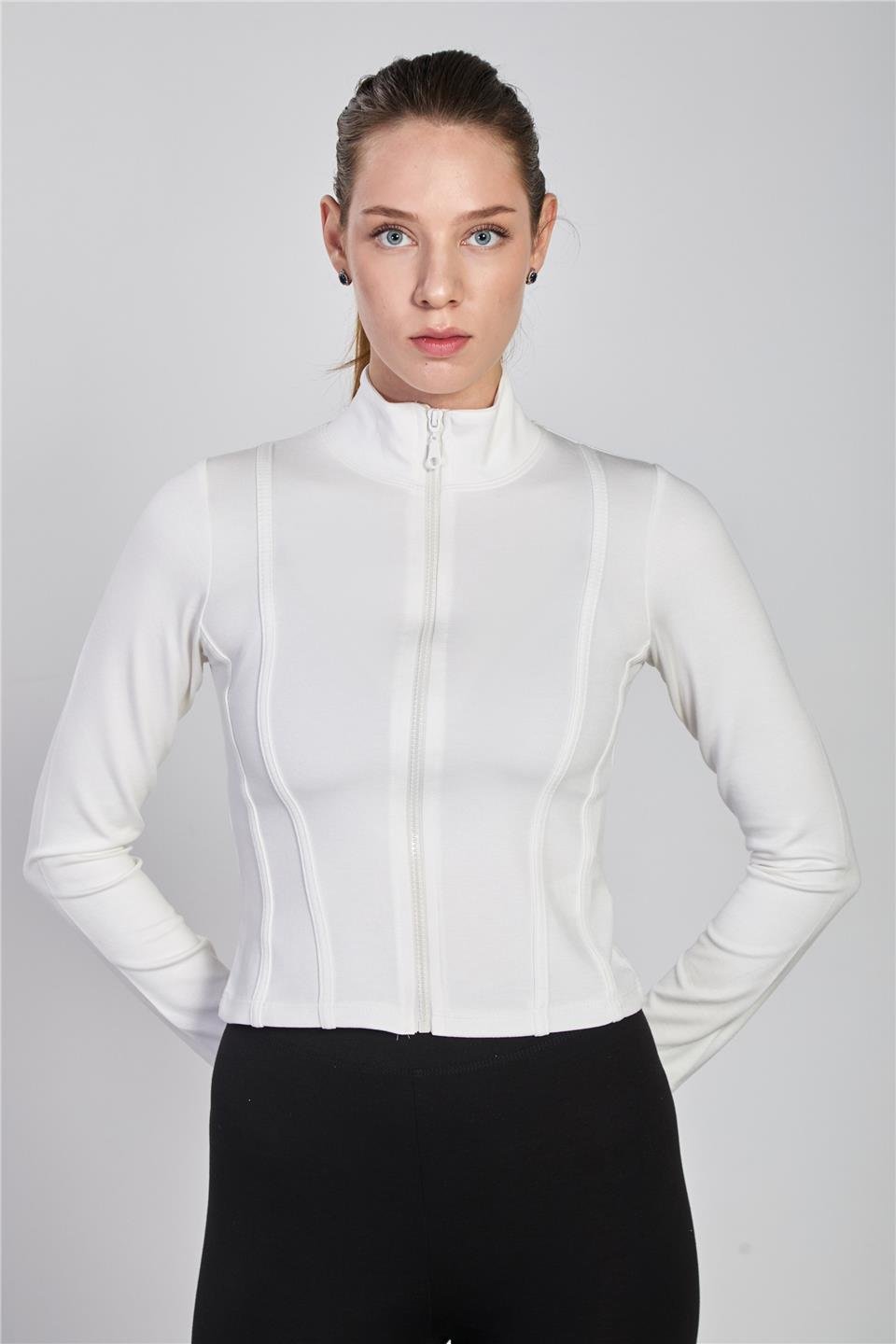 Kadın Biyeli Fermuarlı Uzun Kol Body - Beyaz