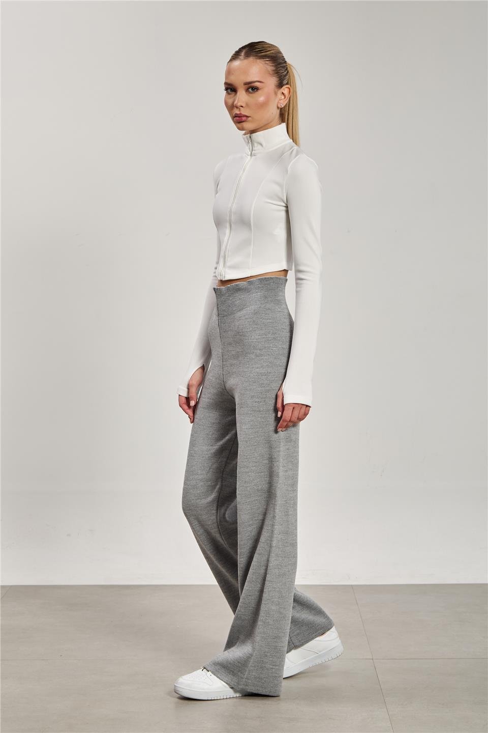 Kadın Bol Paça Triko Pantolon - Gri