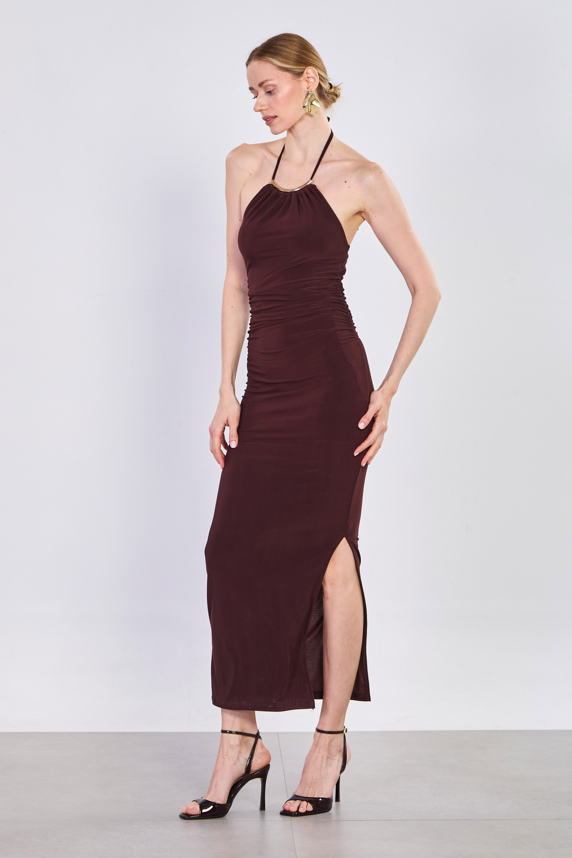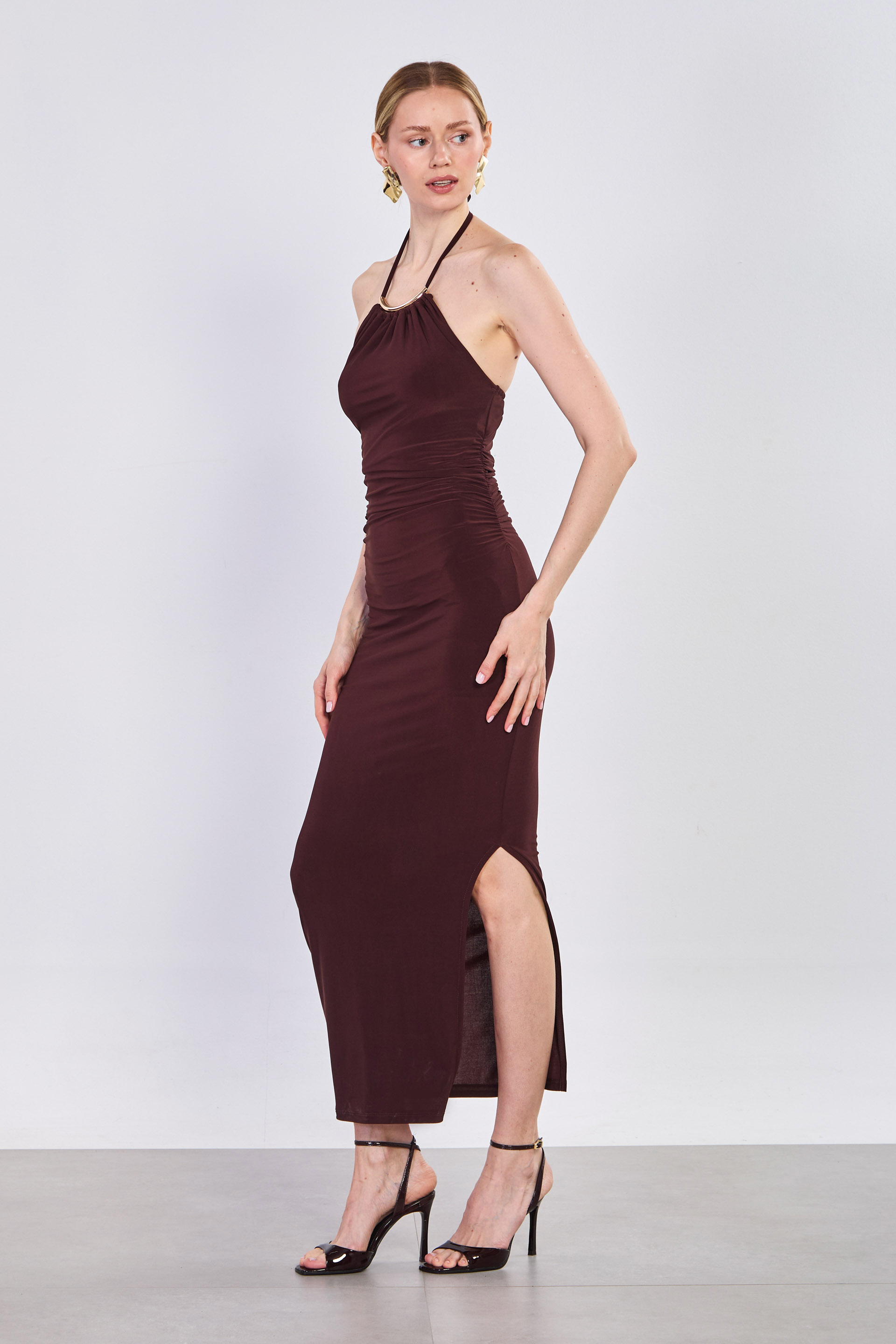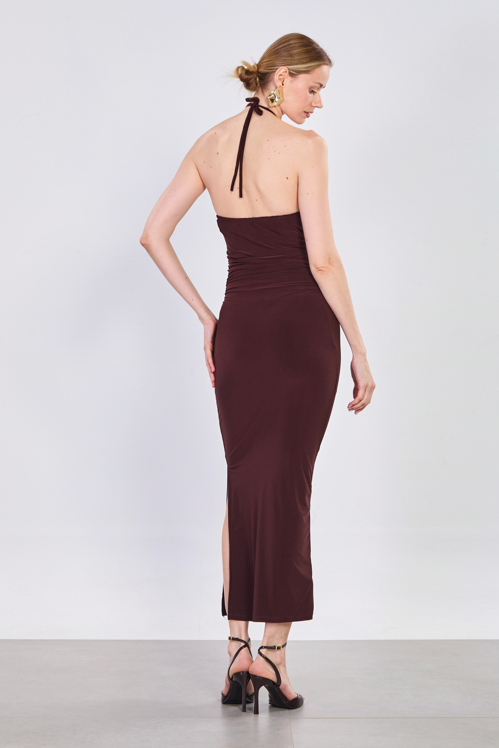 Kadın Boyundan Bağlamalı Drapeli Elbise - Acı Kahve