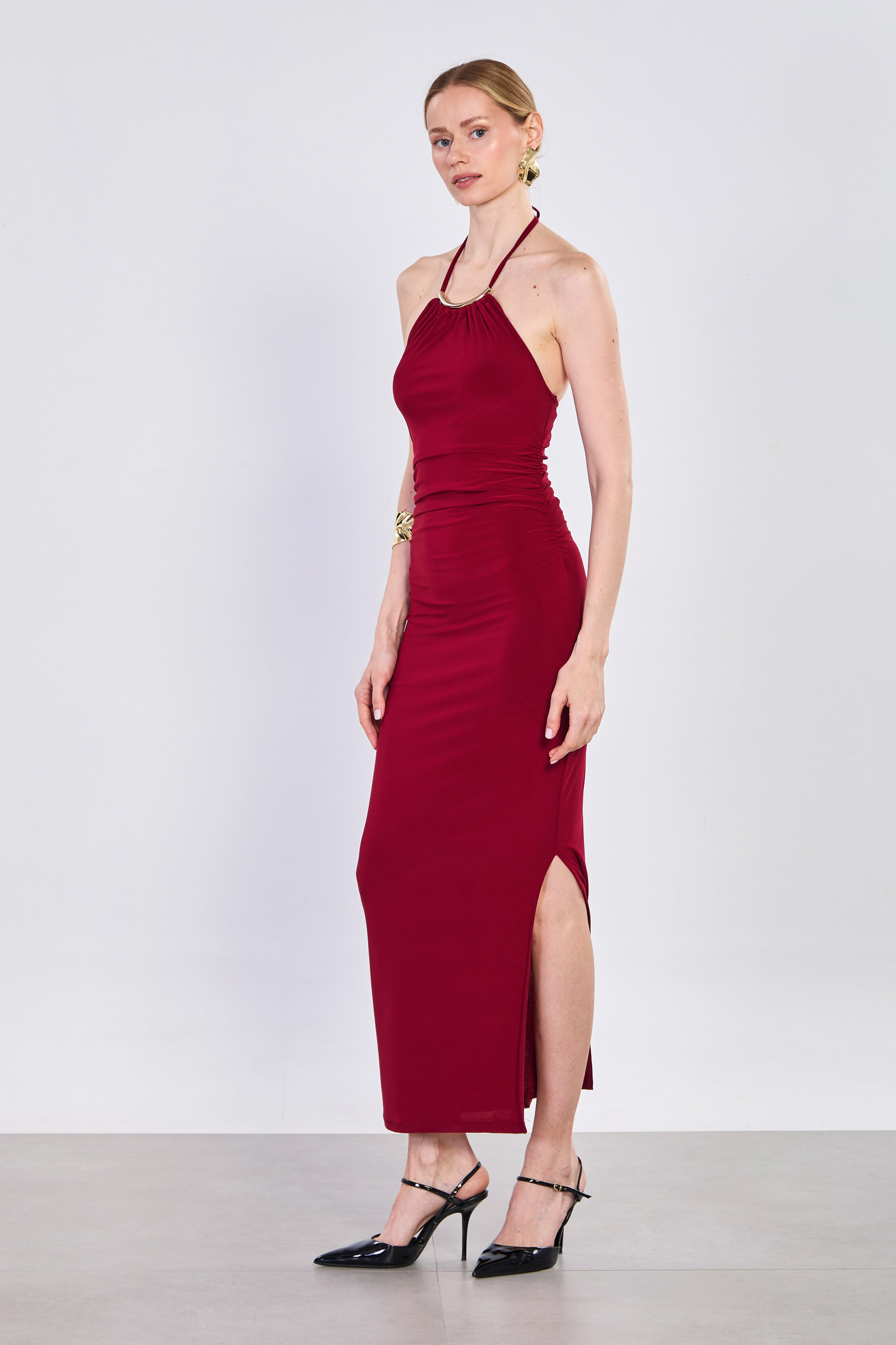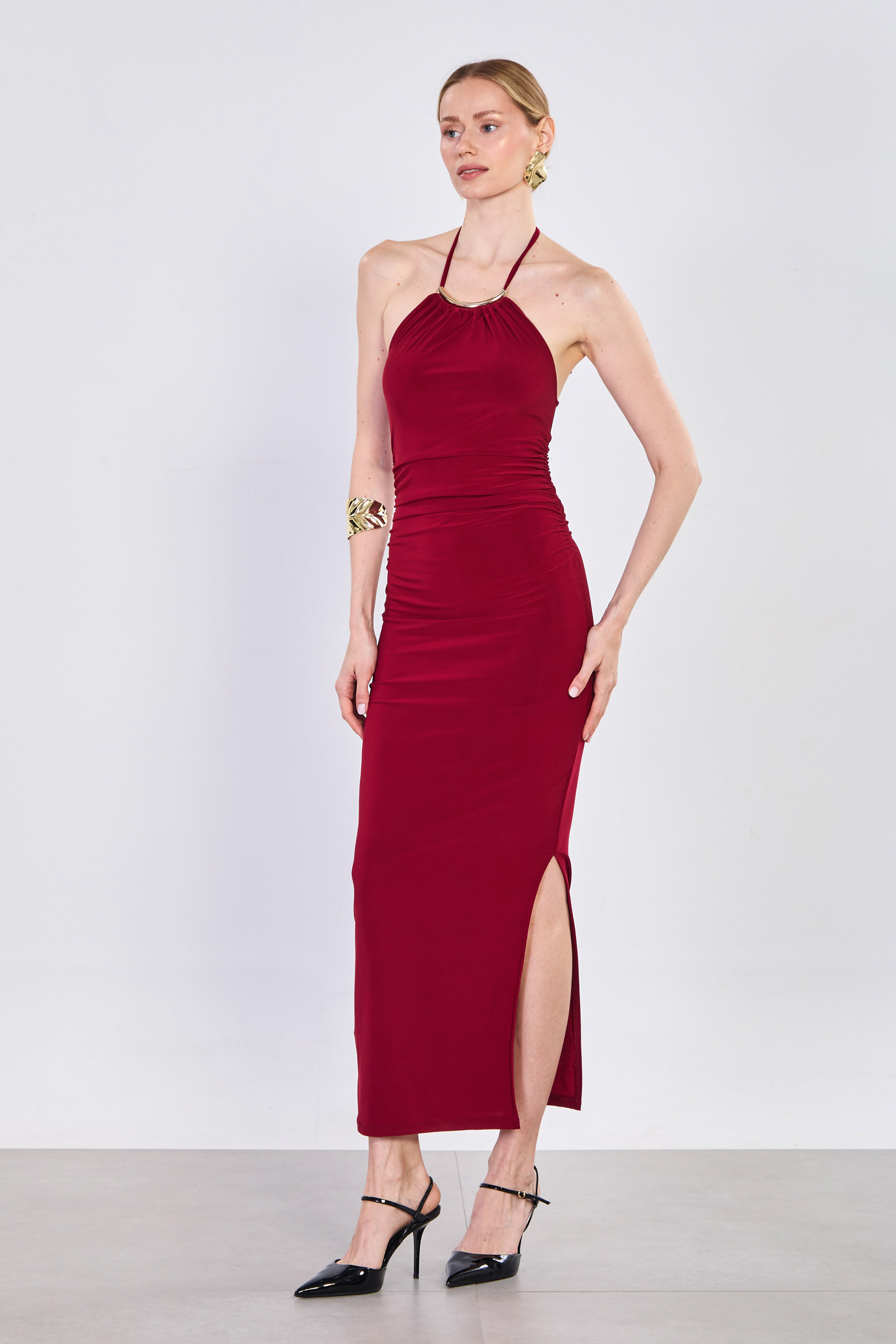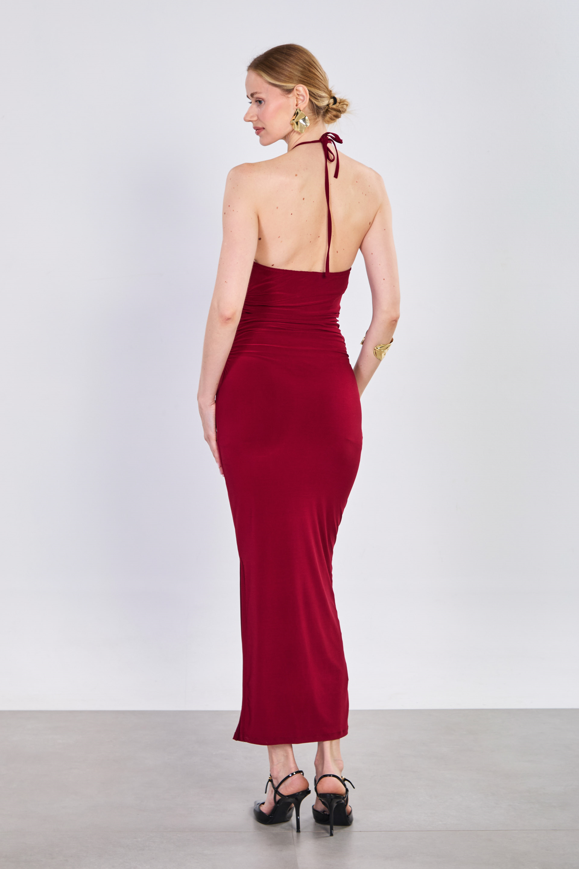 Kadın Boyundan Bağlamalı Drapeli Elbise - Bordo