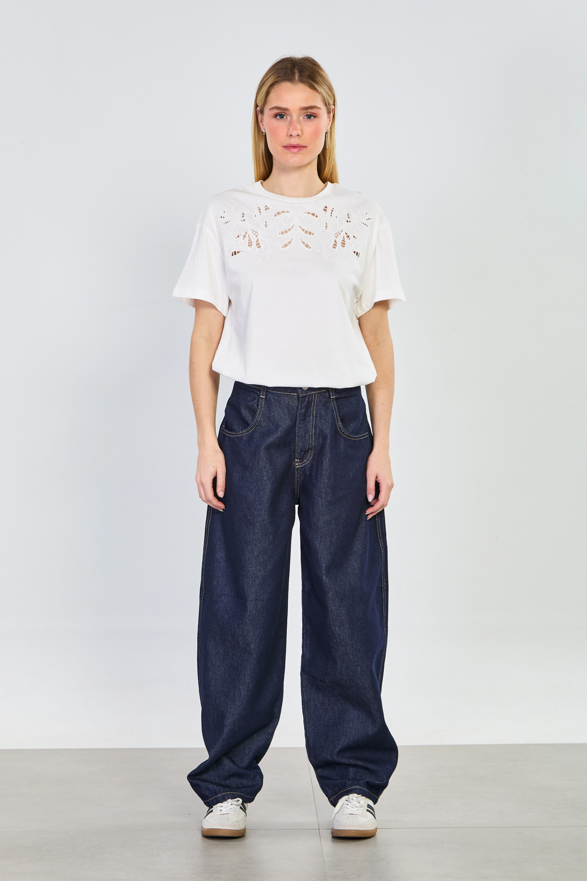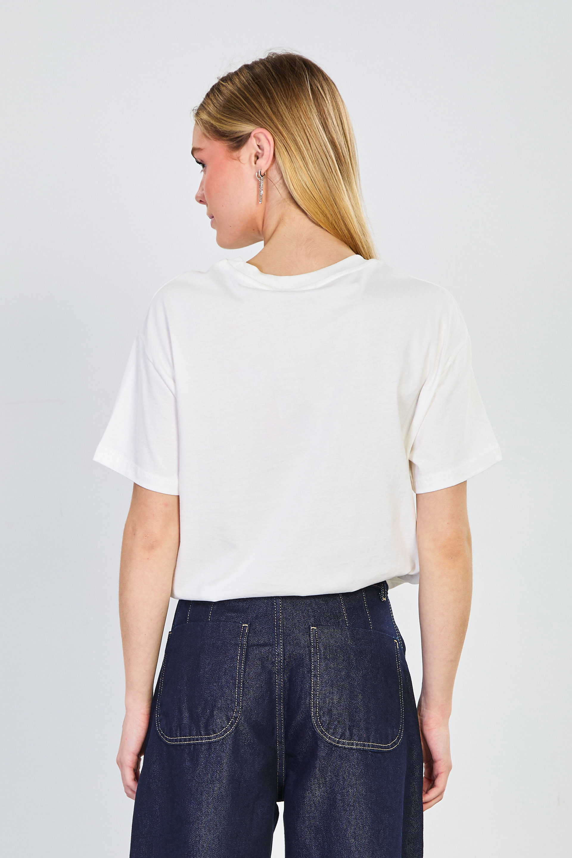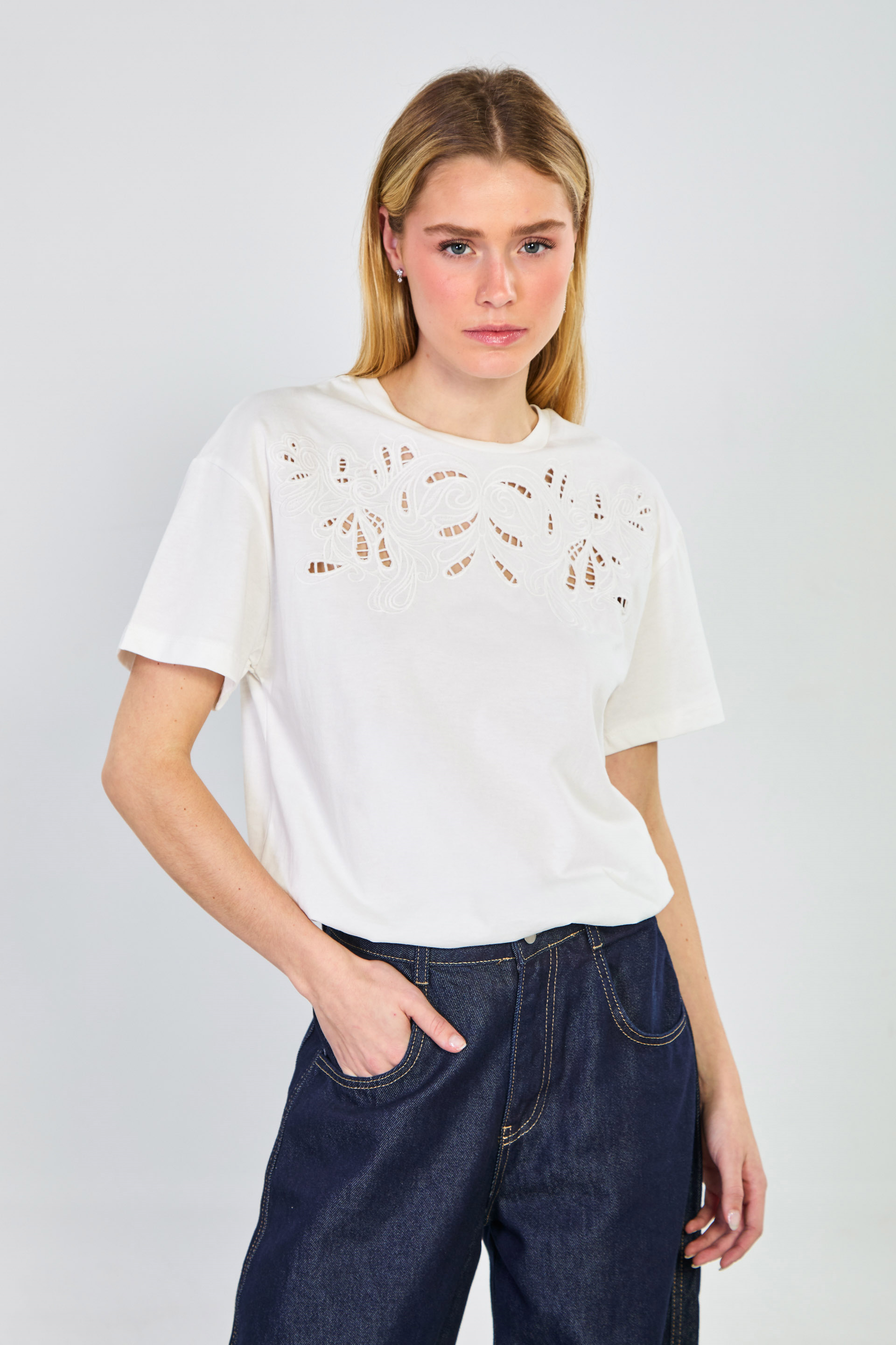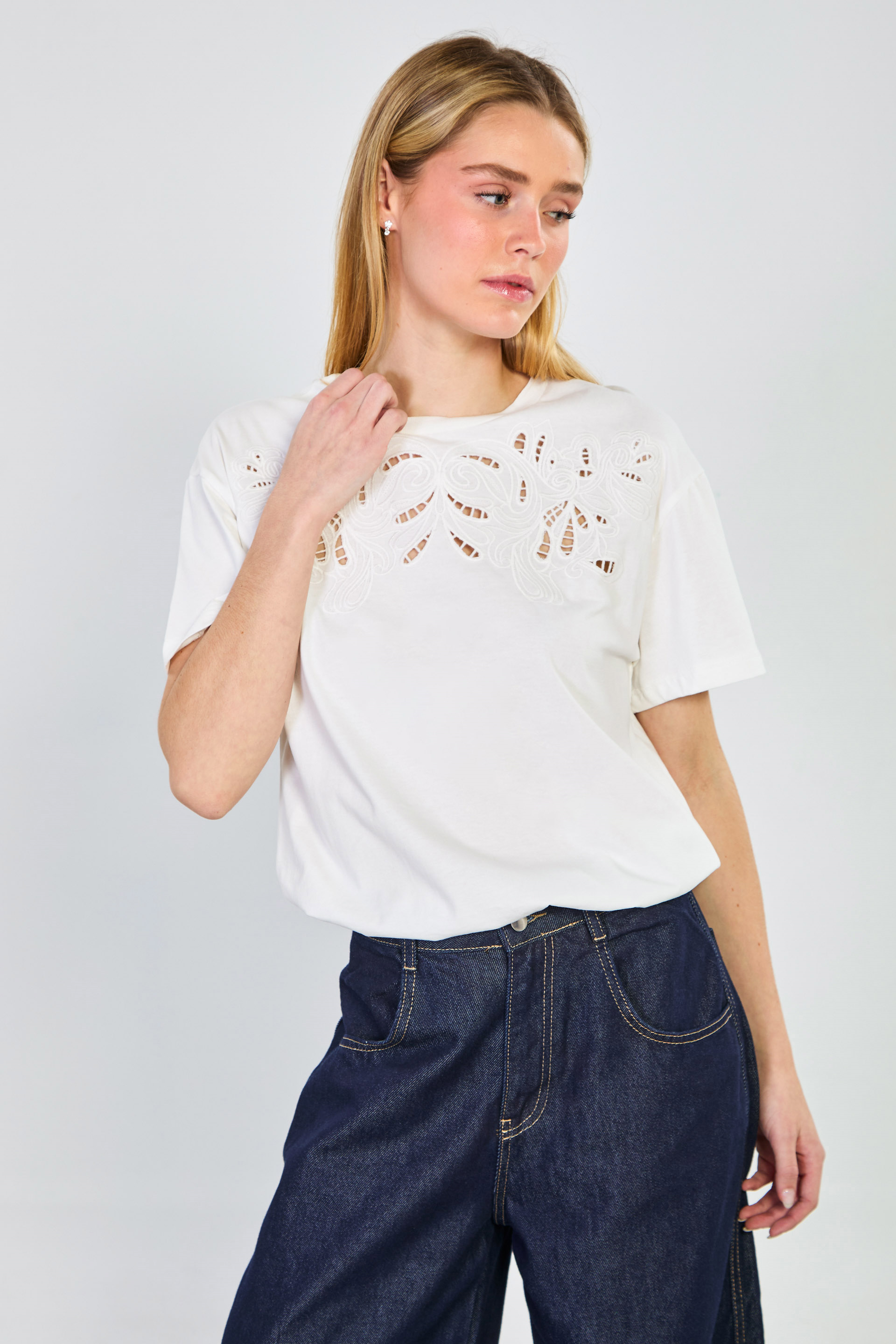 Kadın Brode İşlemeli T-Shirt - Ekru