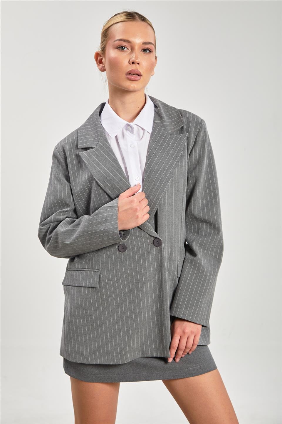 Kadın Cep Kapaklı Çizgili Blazer Ceket - Okul Gri