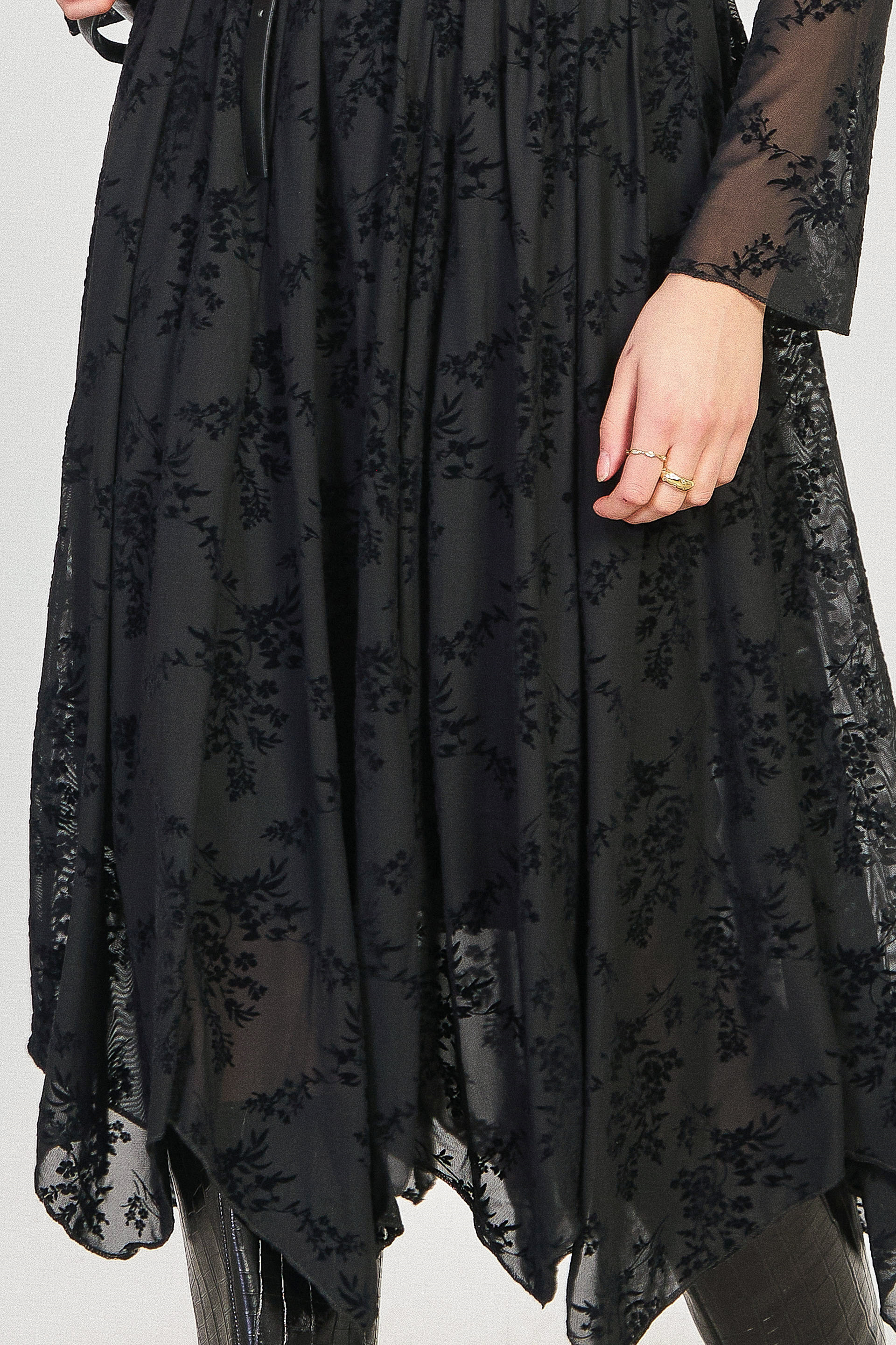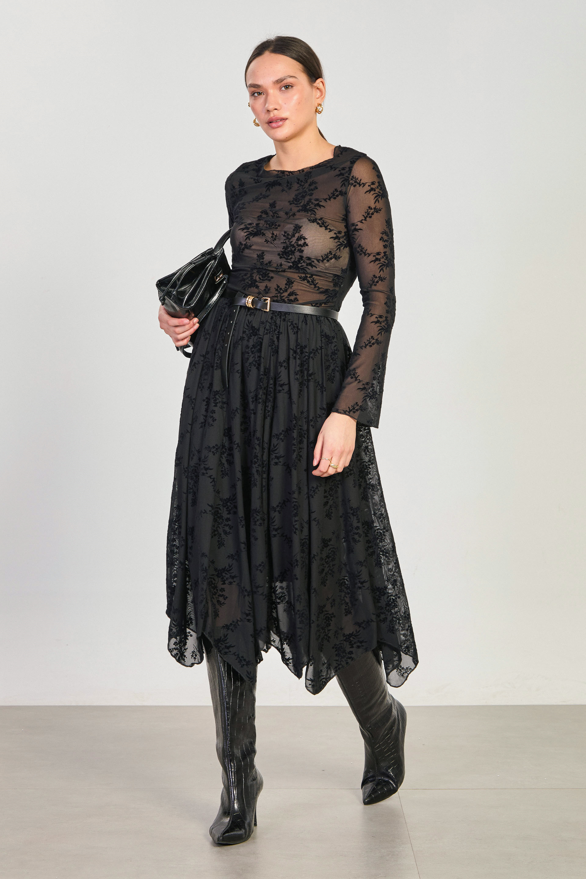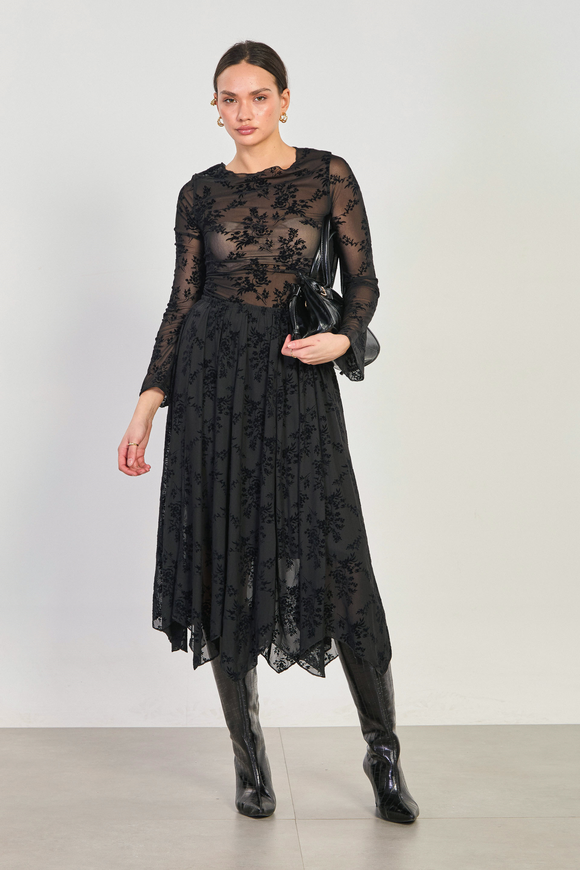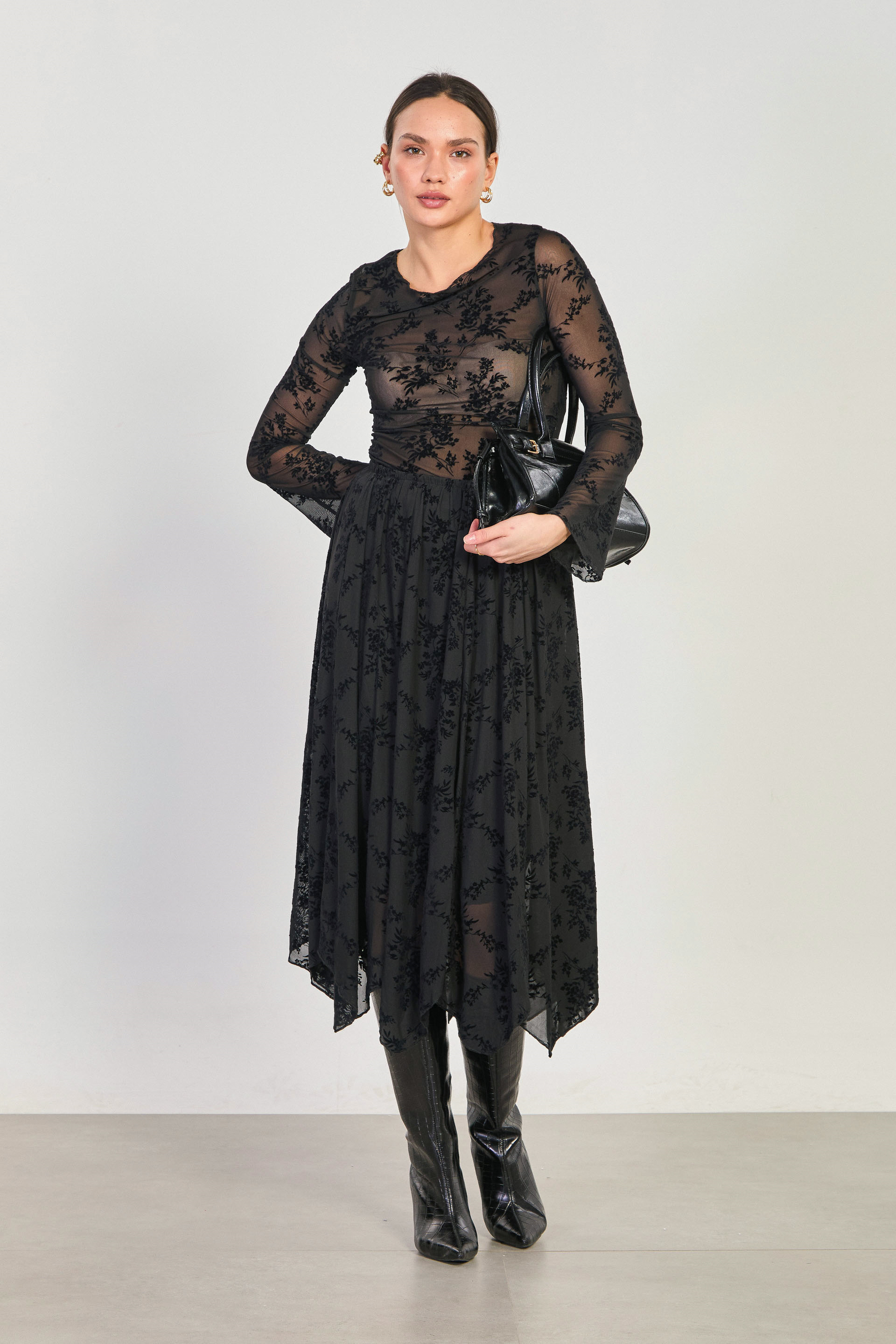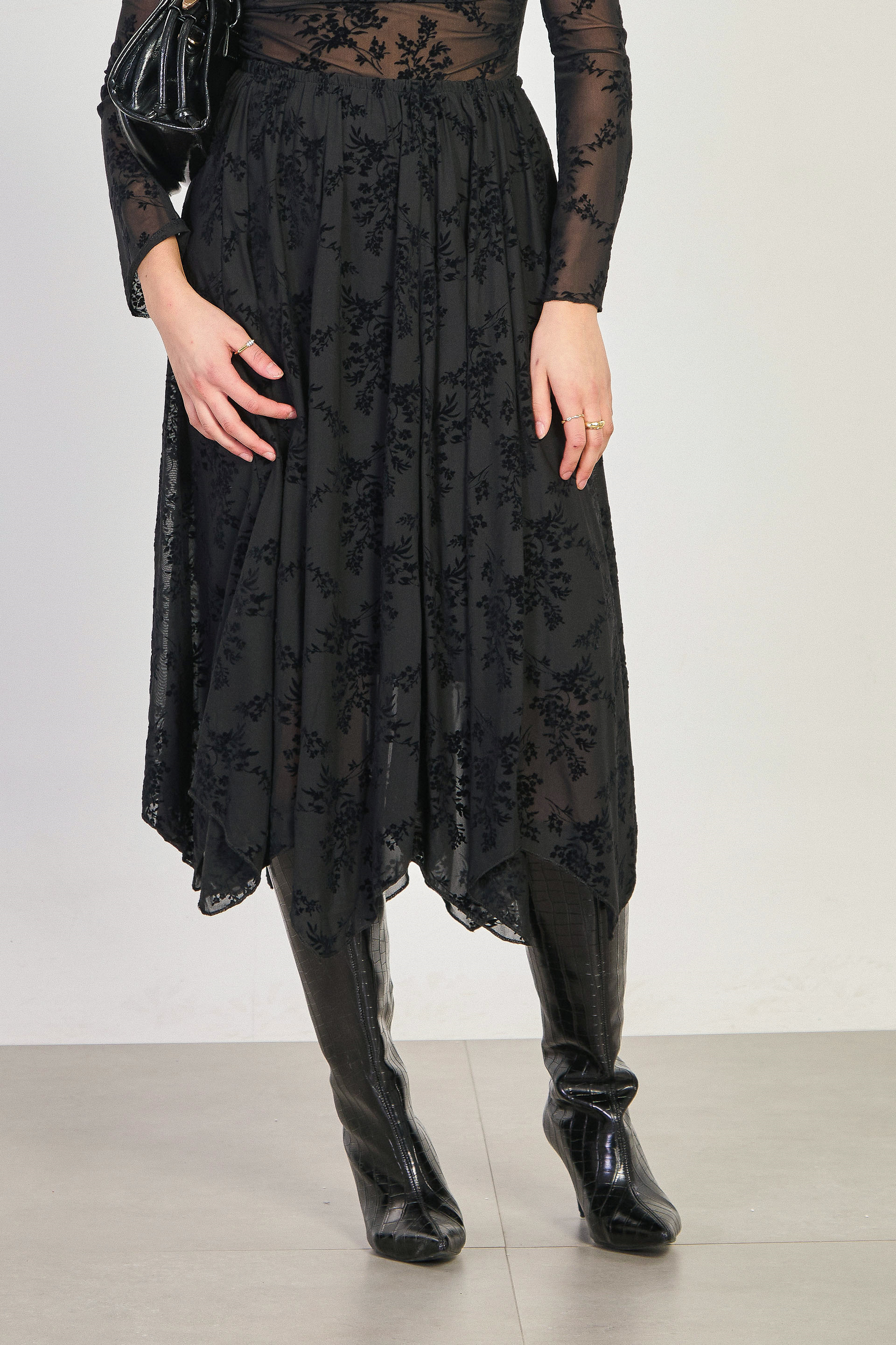 Kadın Çiçek Desenli Asimetrik Tül Etek - Siyah