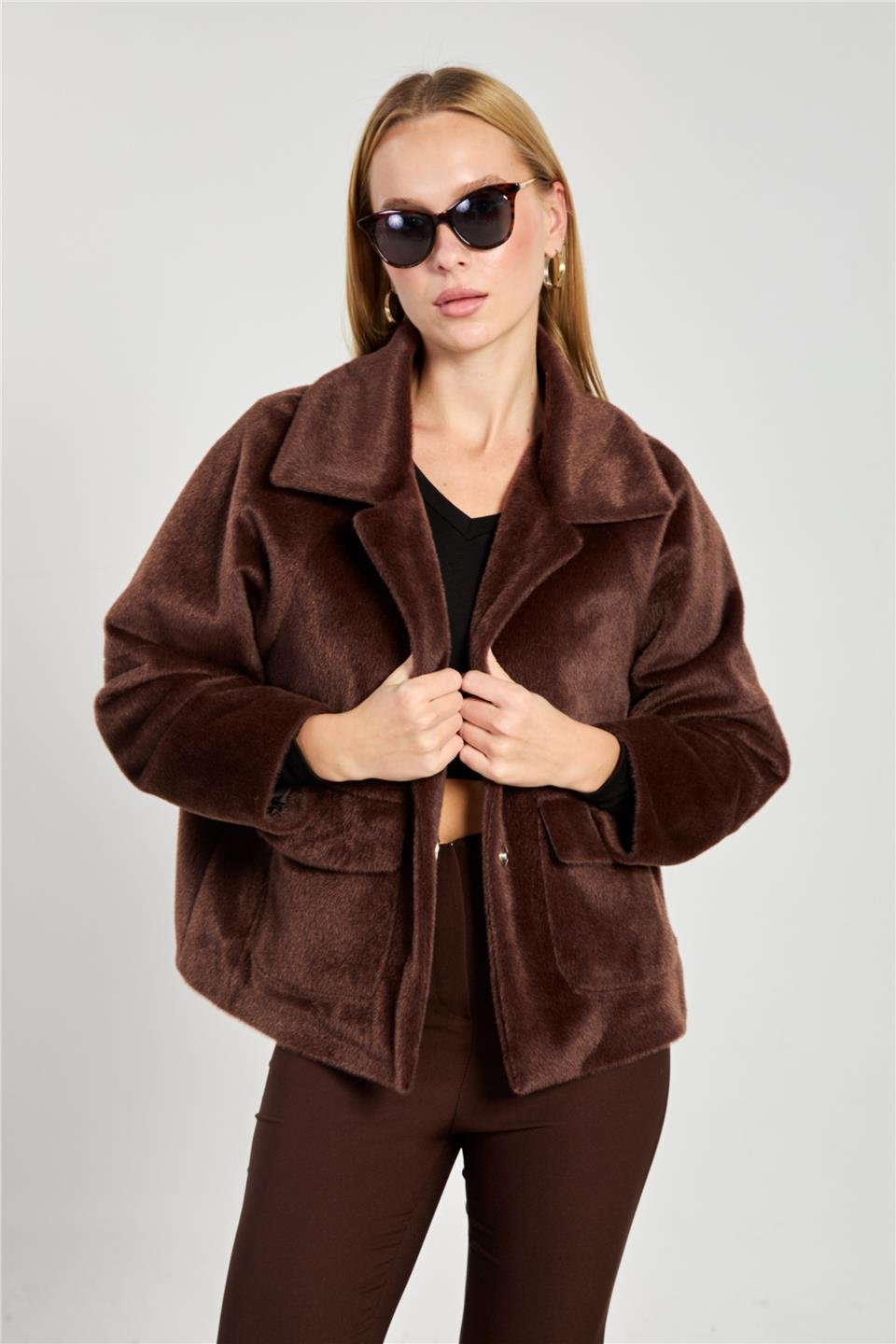 Kadın Çift Cep Oversize Kısa Kaşe Ceket - Kahve