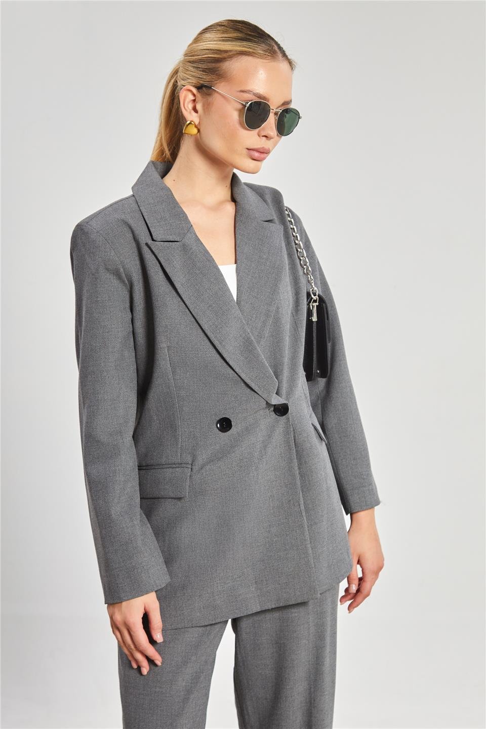 Kadın Çift Düğmeli Blazer Ceket - Okul Gri