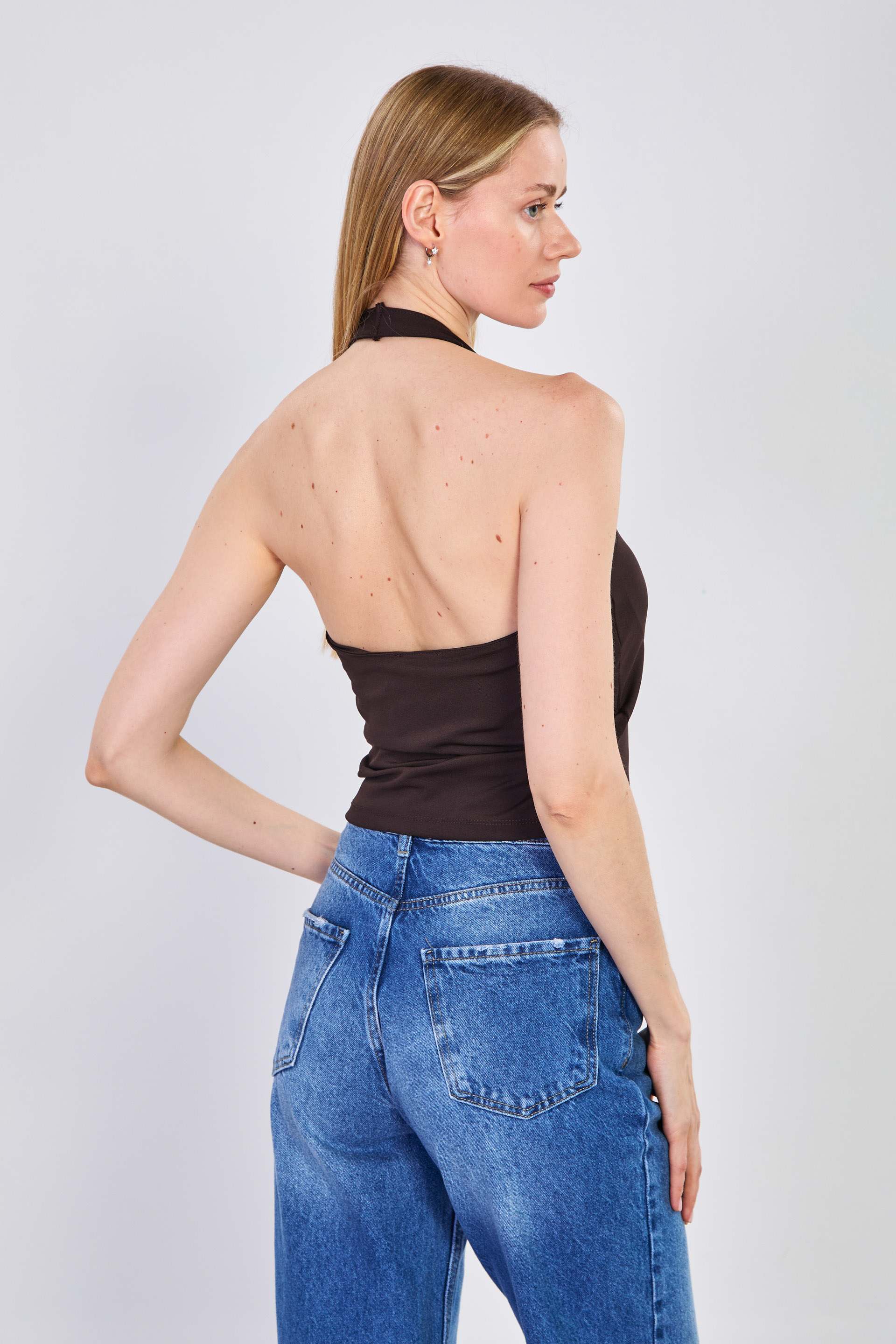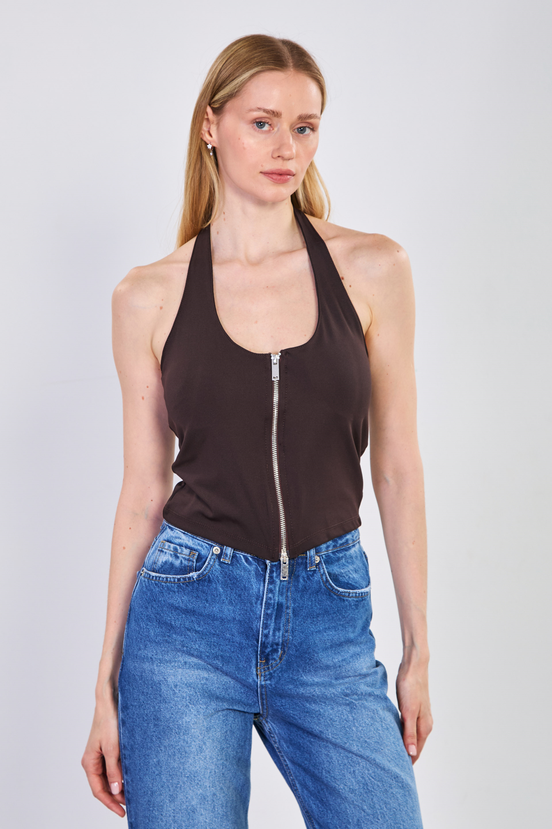 Kadın Çift Fermuarlı Boyundan Geçmeli Body - Acı Kahve