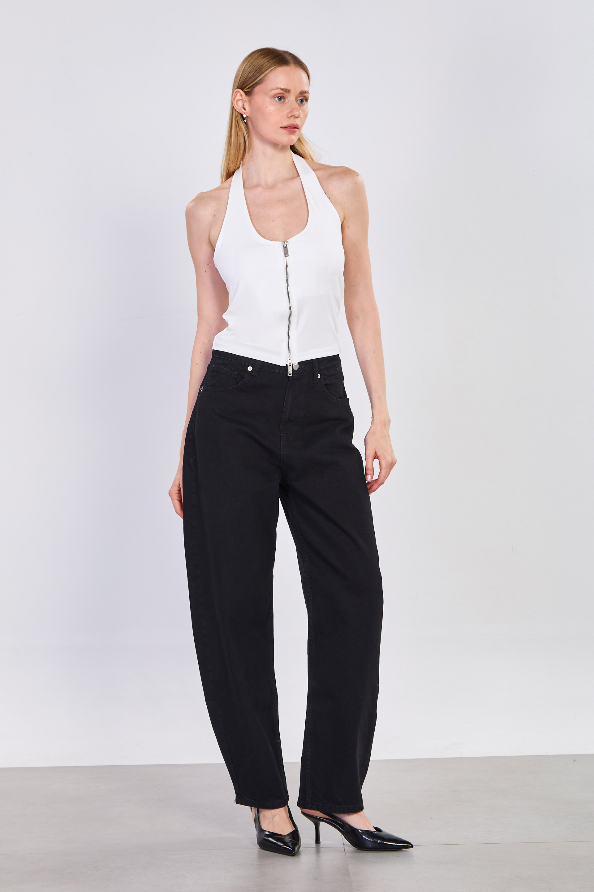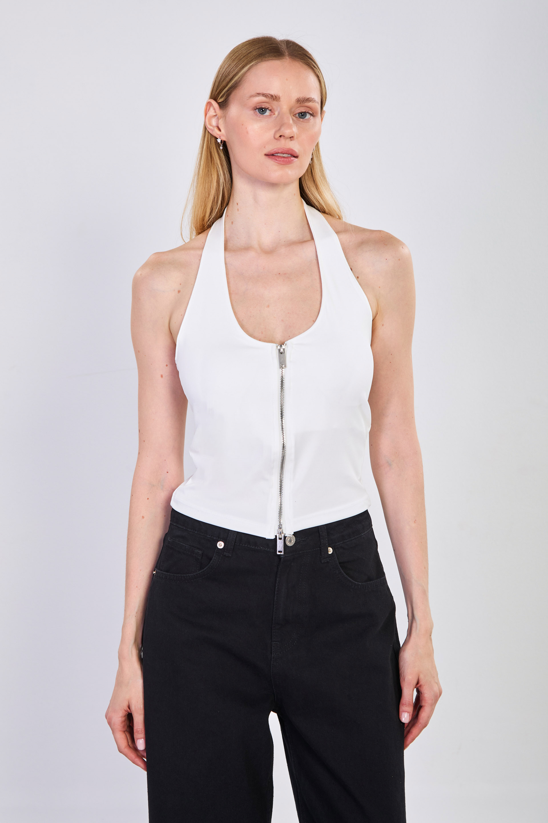 Kadın Çift Fermuarlı Boyundan Geçmeli Body - Ekru