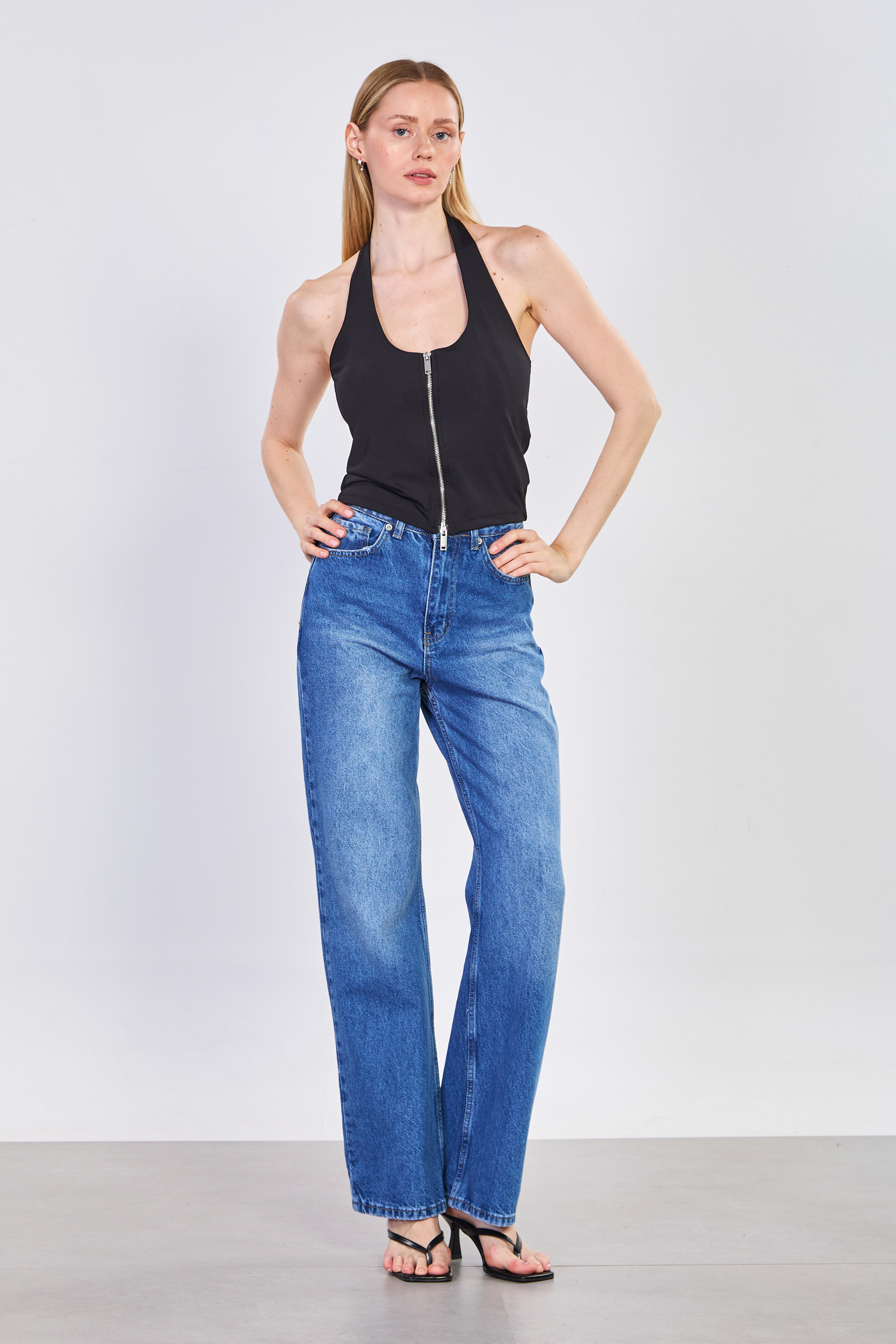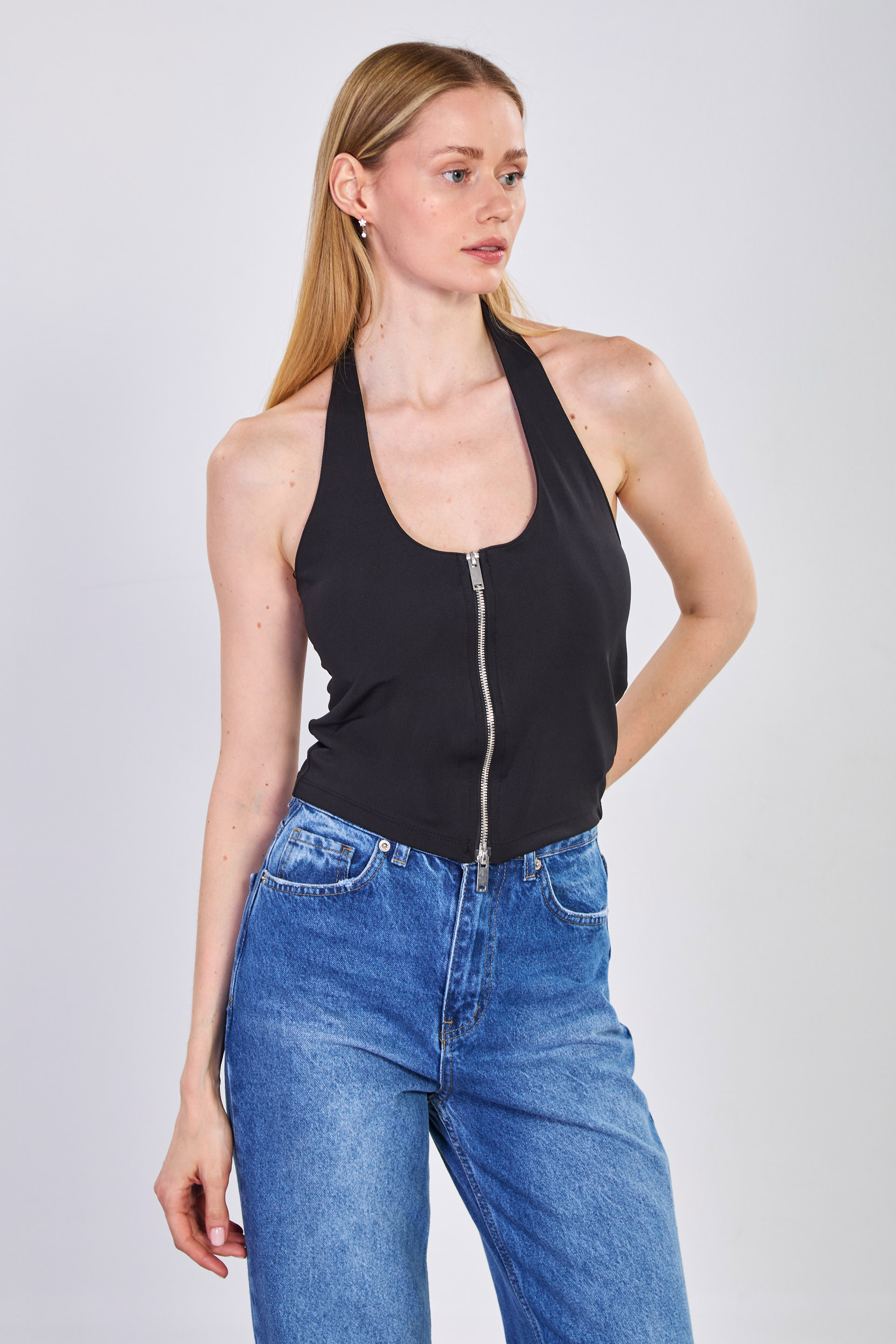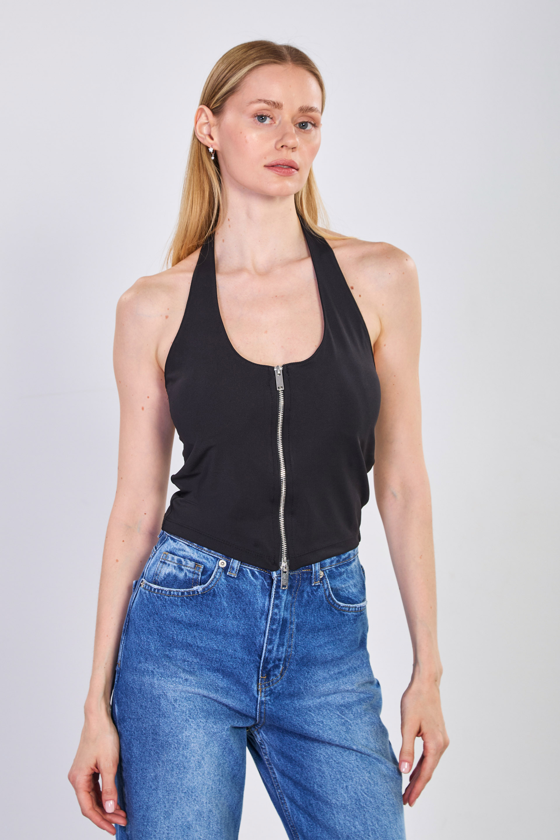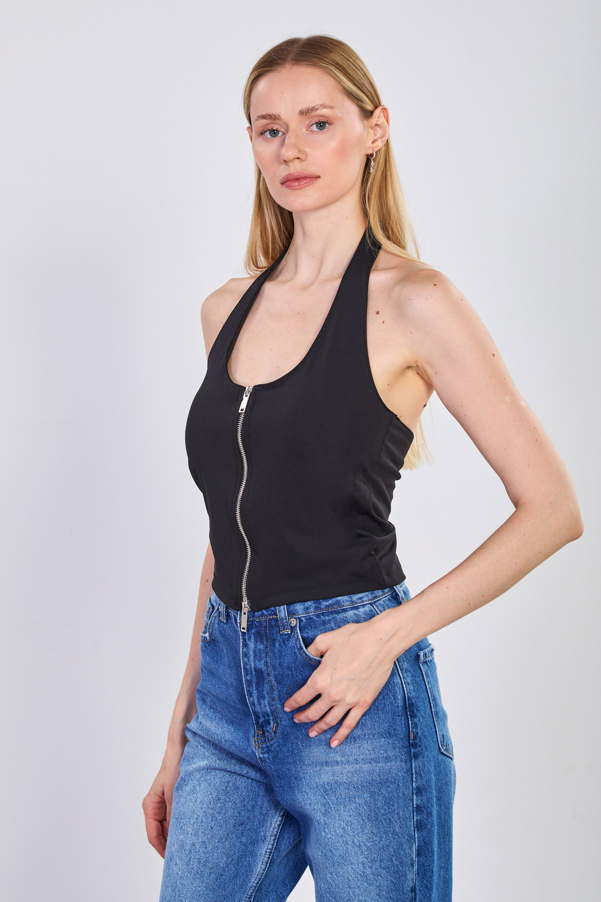 Kadın Çift Fermuarlı Boyundan Geçmeli Body - Siyah