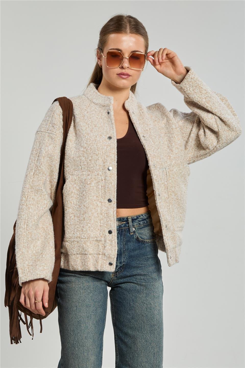 Kadın Çıtçıtlı Bomber Ceket - Taş Rengi