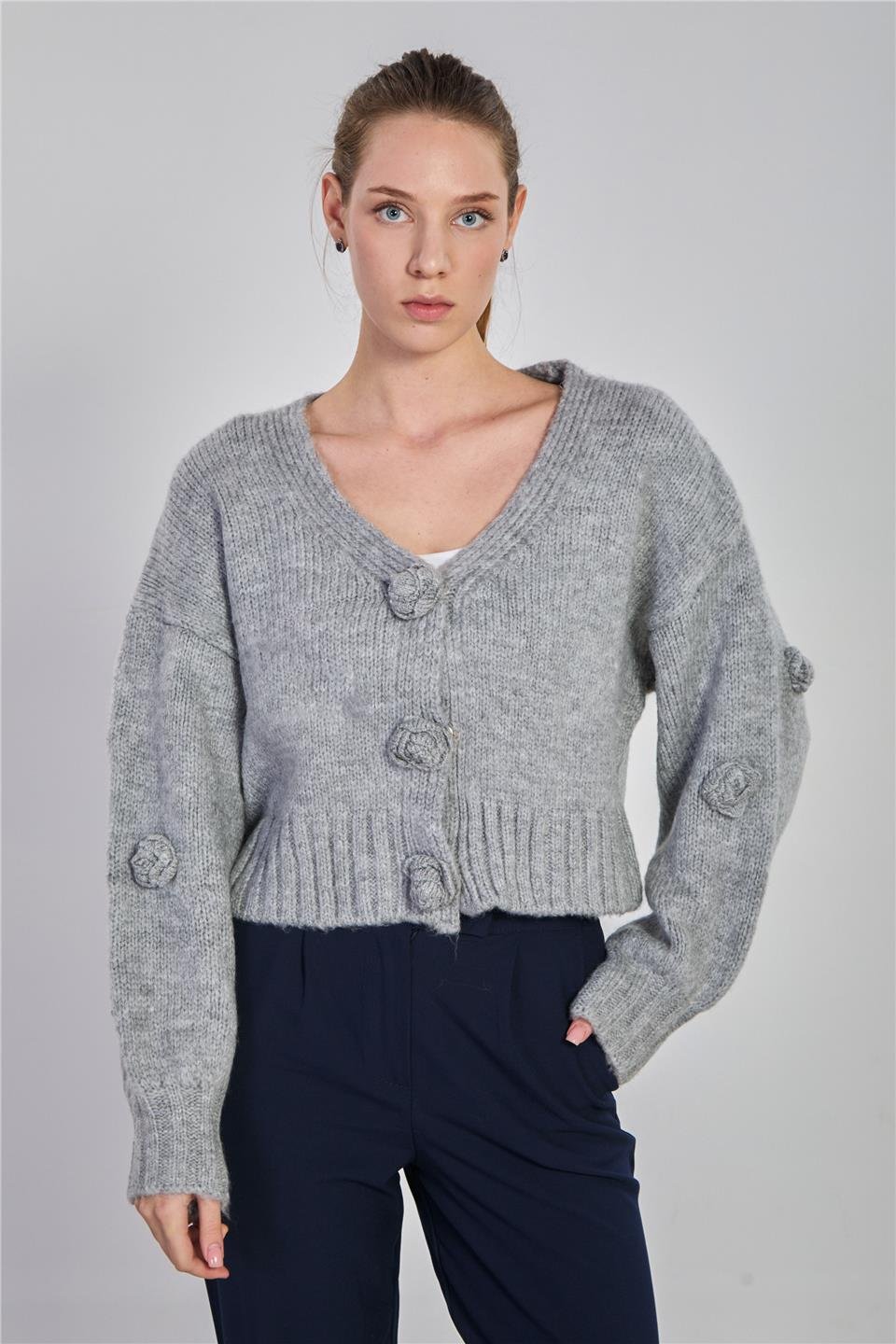 Kadın Çıtçıtlı Gül Detaylı Triko Hırka - Açık Gri