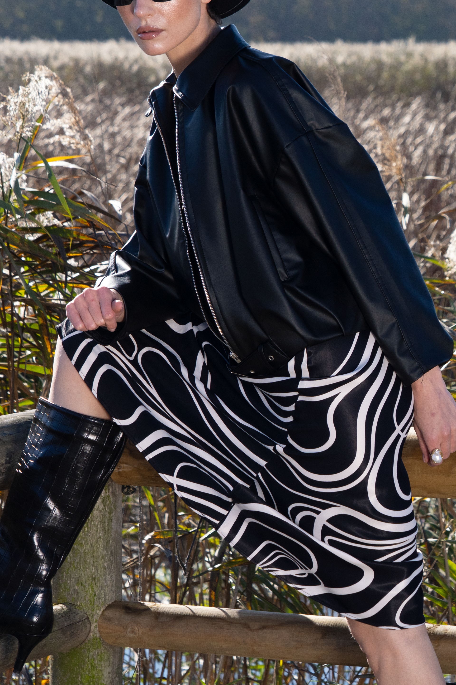 Kadın Çizgi Desen Midi Etek - Siyah Ekru