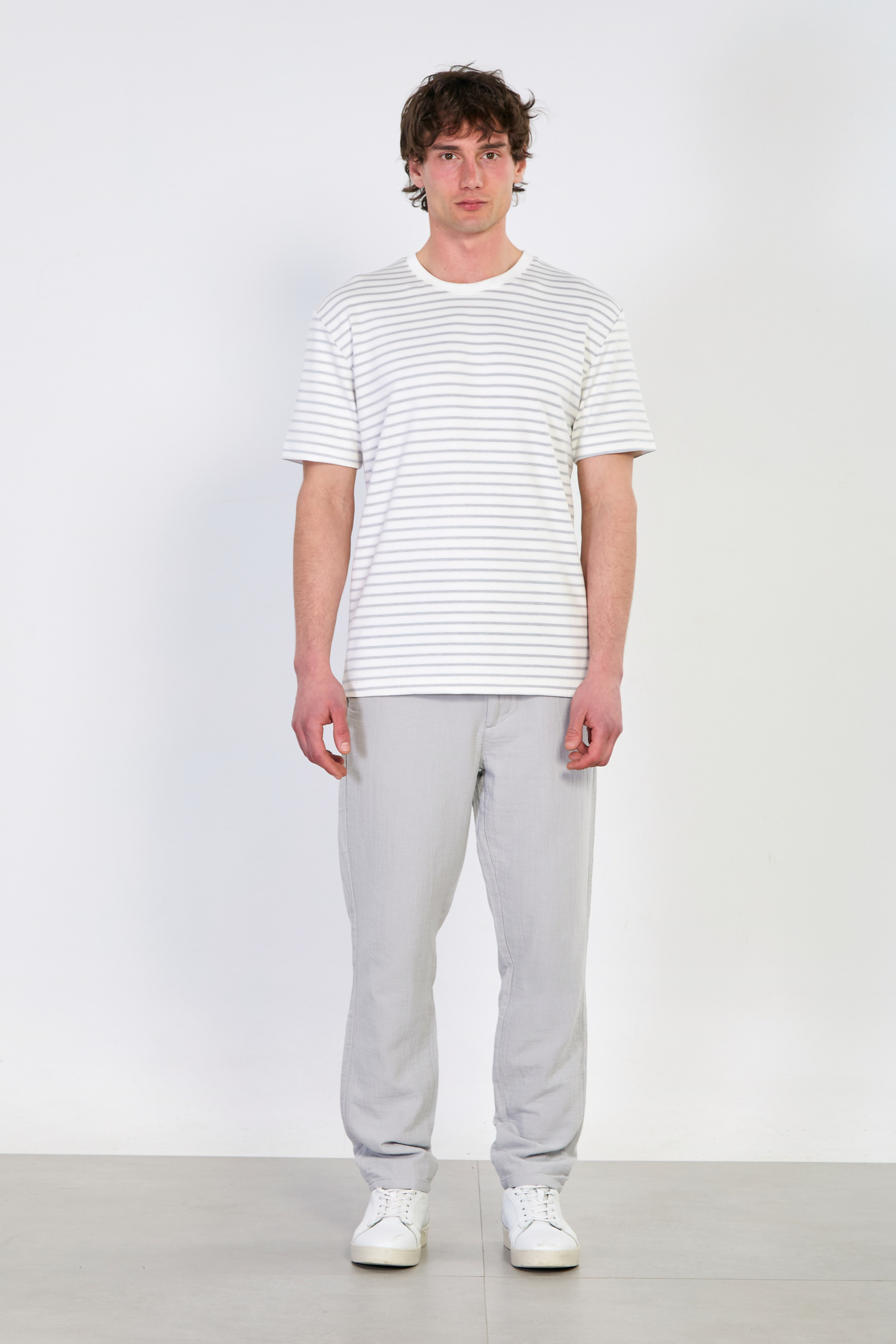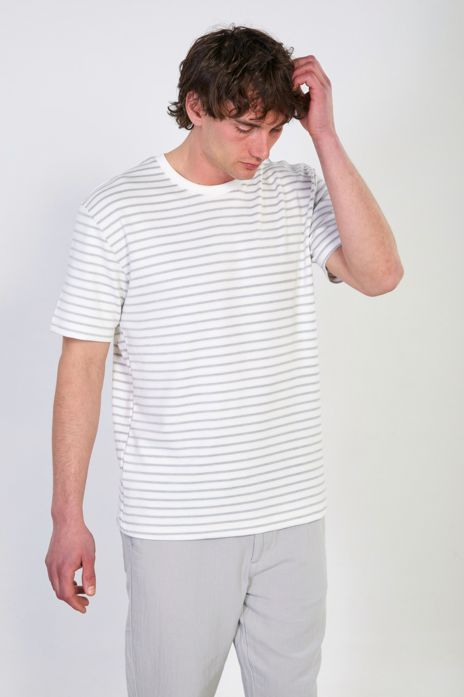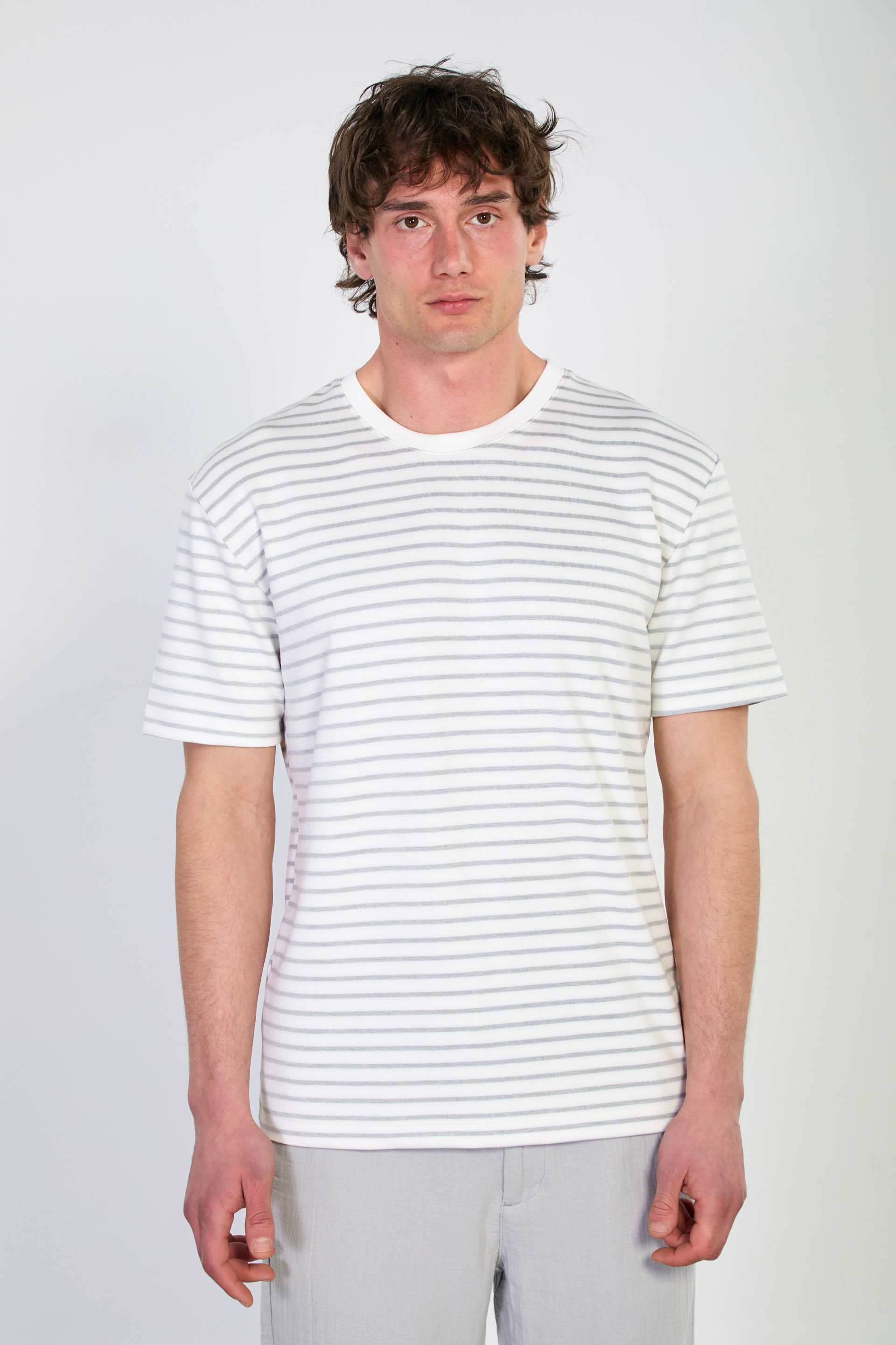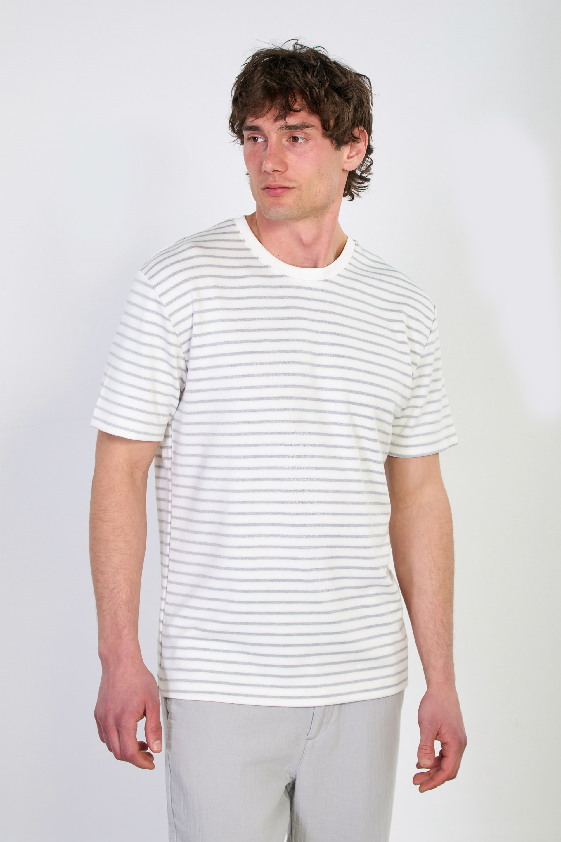 Erkek Çizgili Bisiklet Yaka T-Shirt - Beyaz/Gri