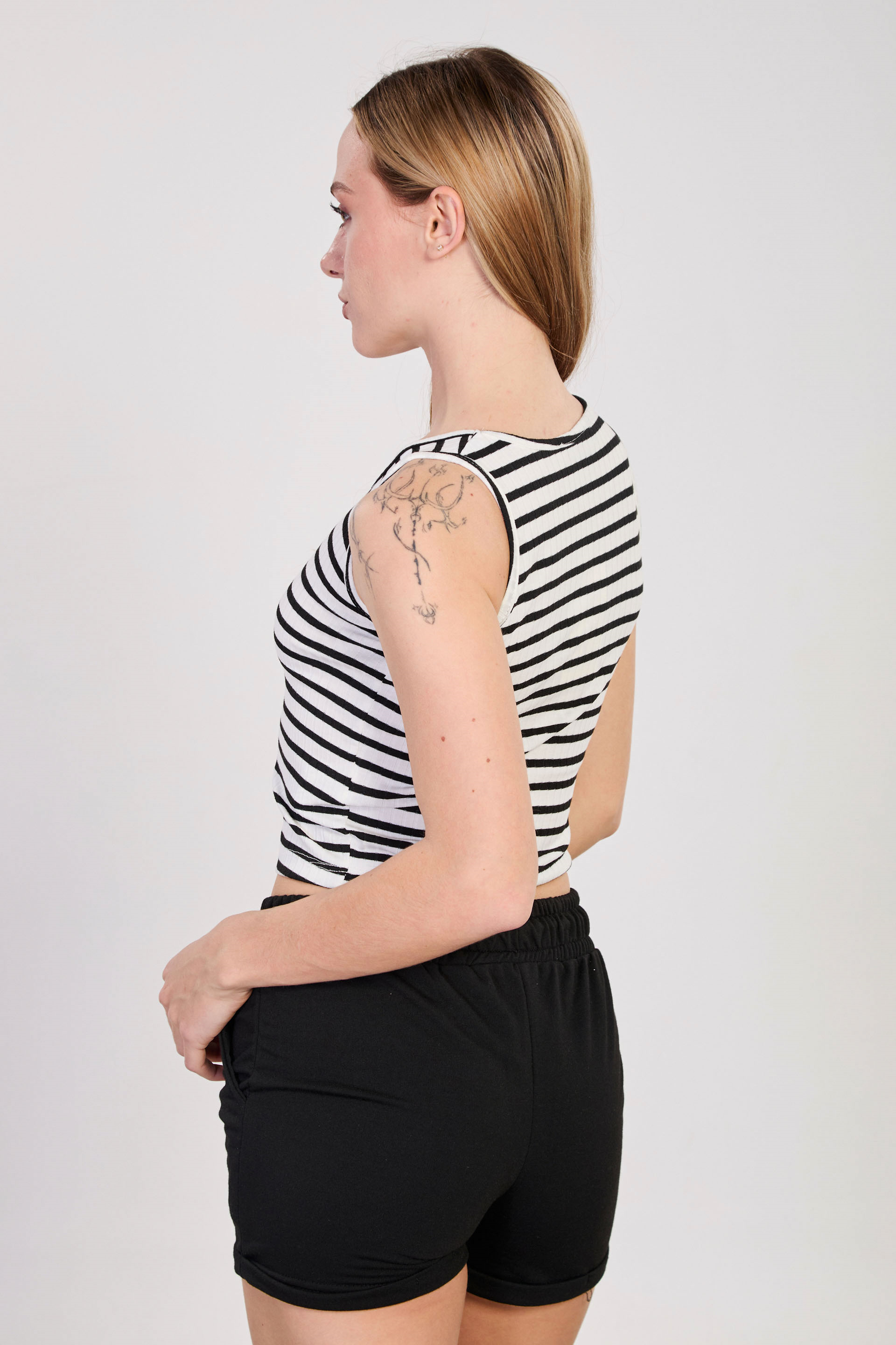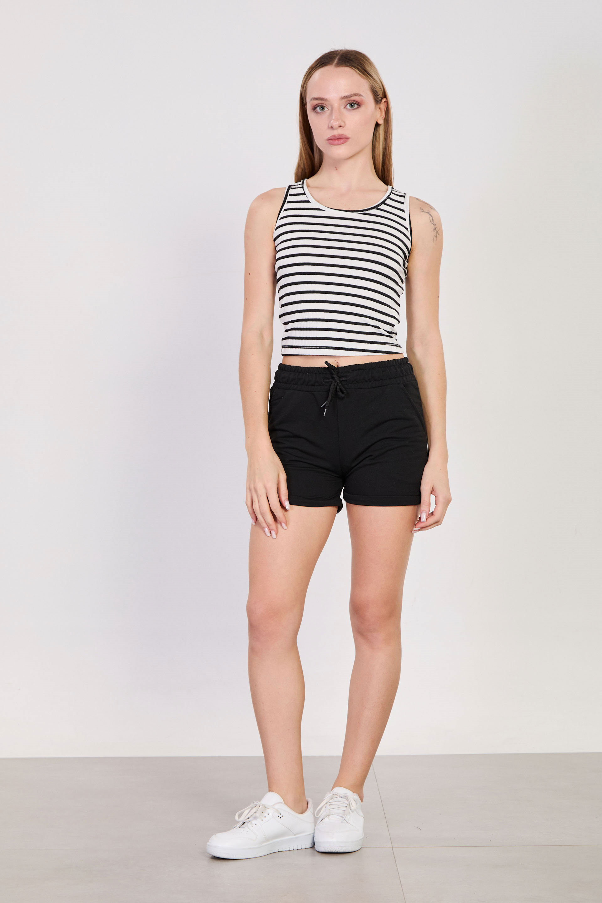 Kadın Çizgili Kalın Askılı Crop Atlet - Beyaz/Siyah