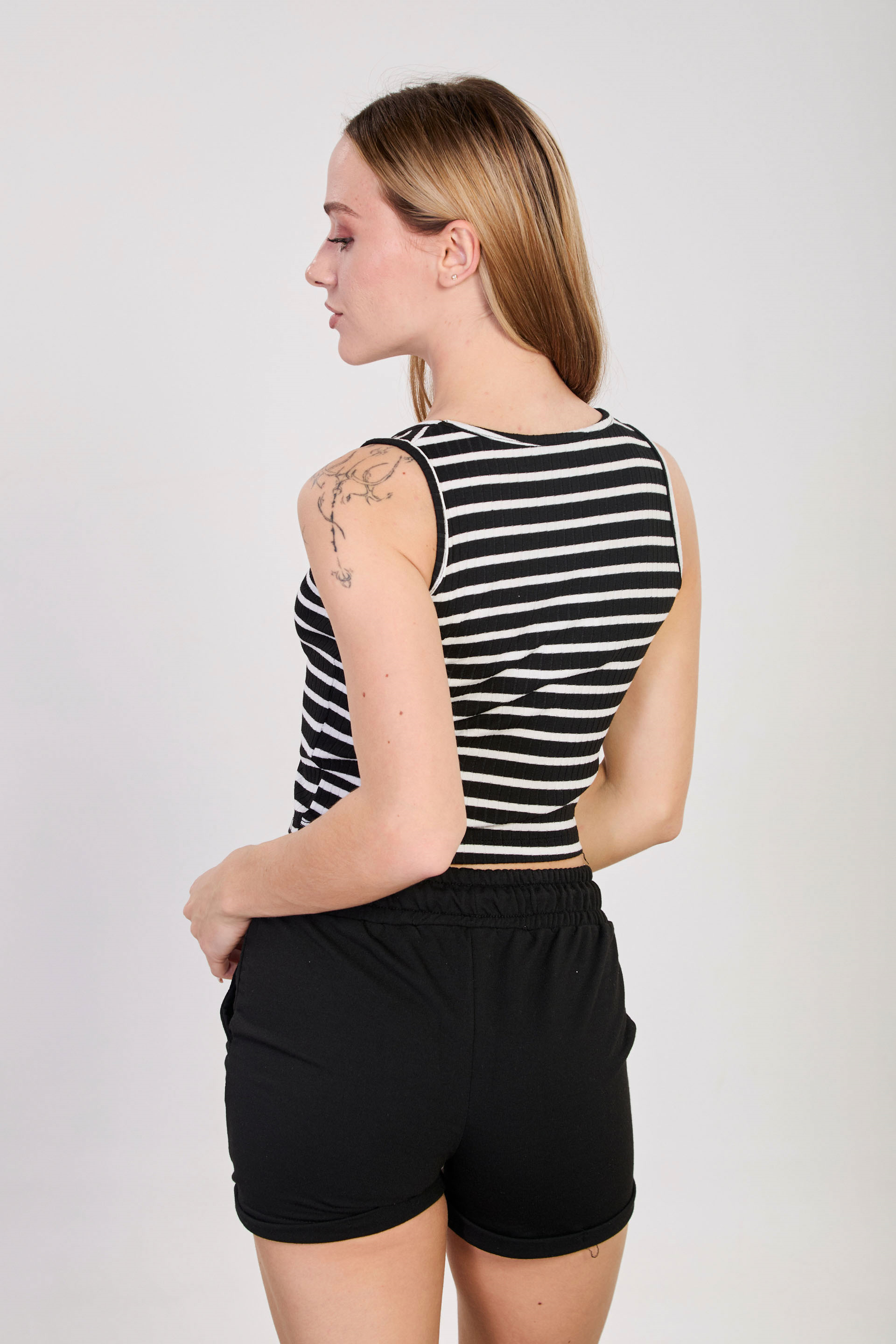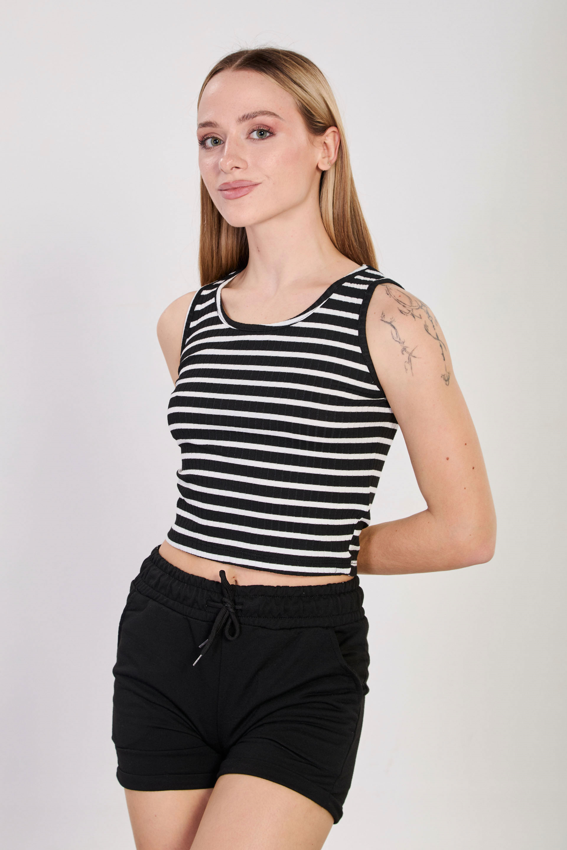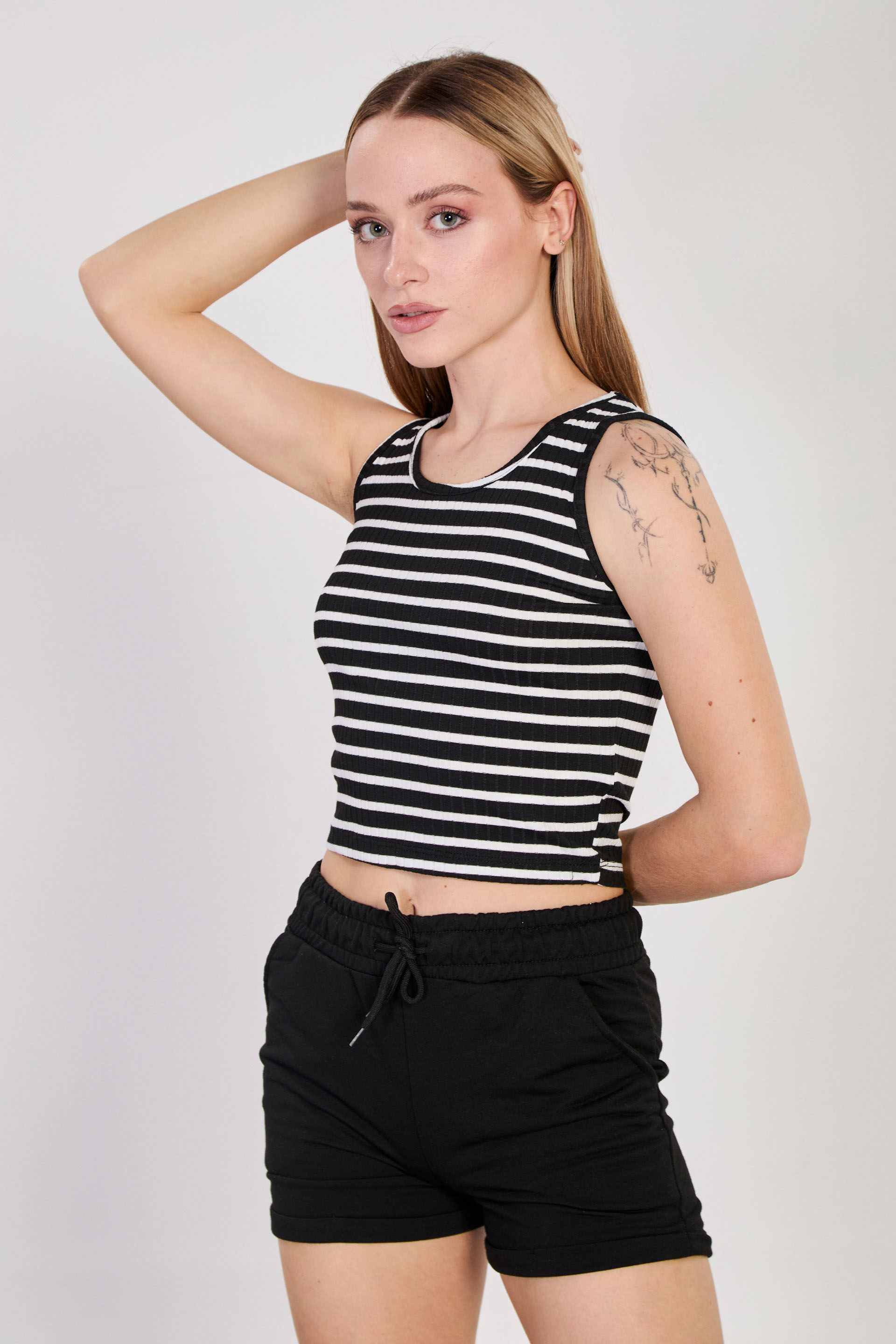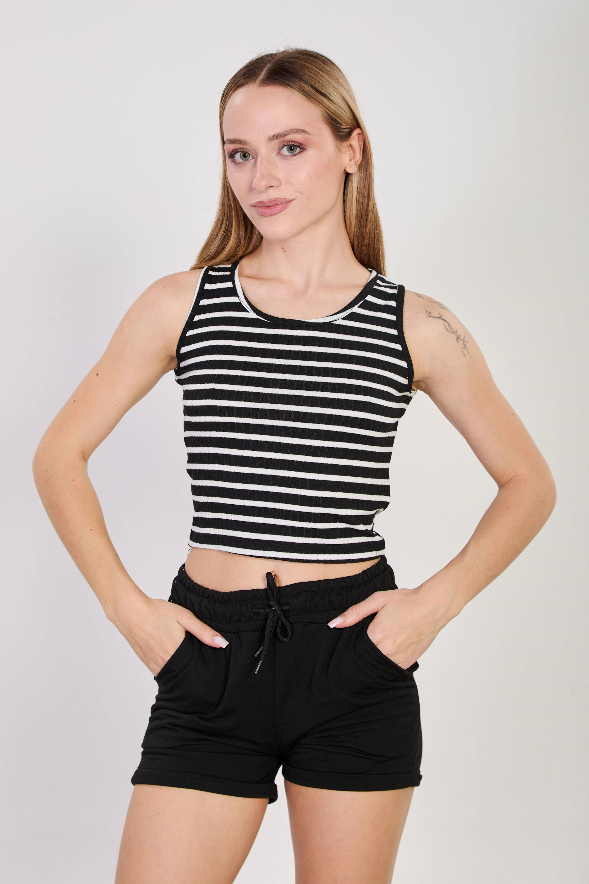 Kadın Çizgili Kalın Askılı Crop Atlet - Siyah/Beyaz
