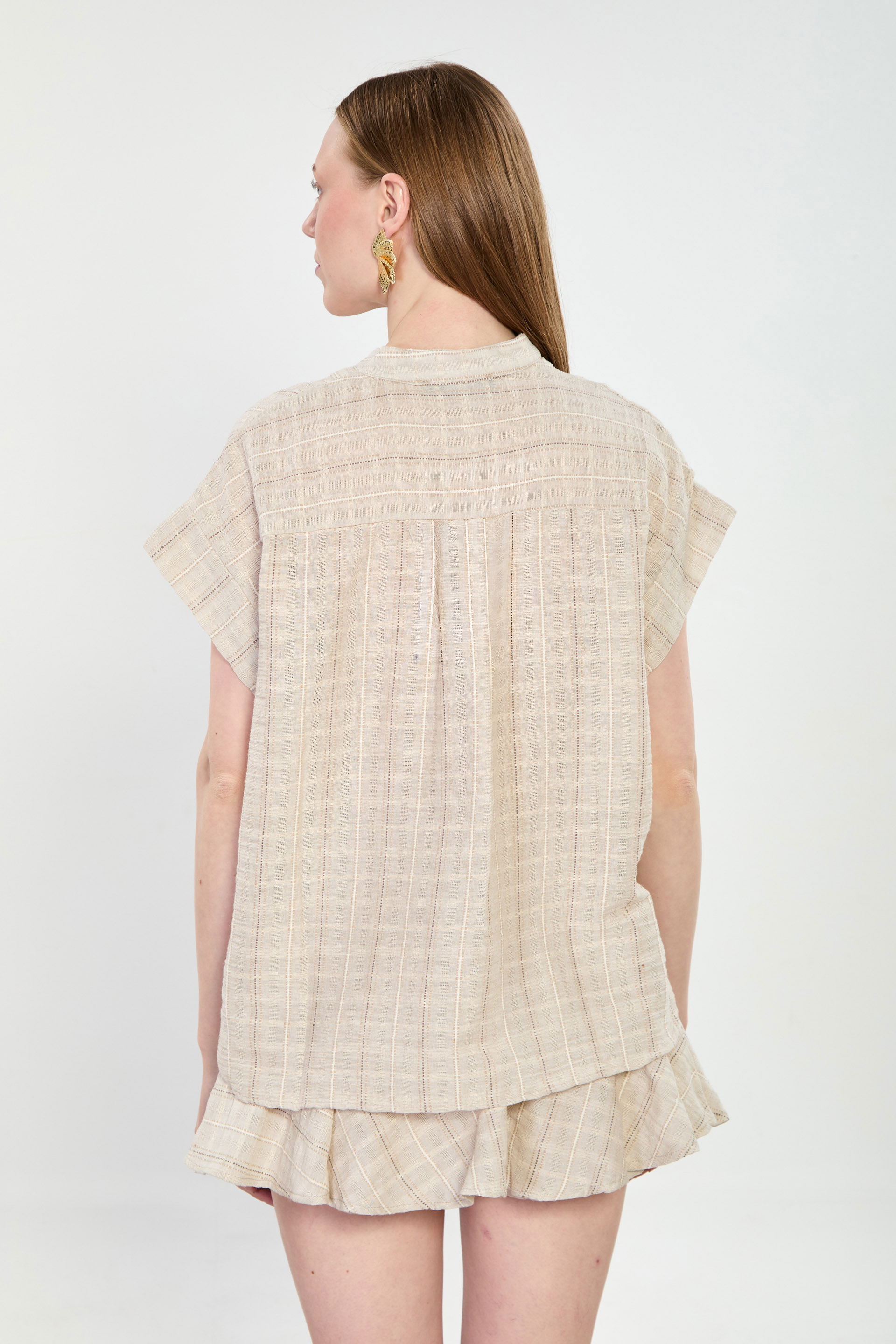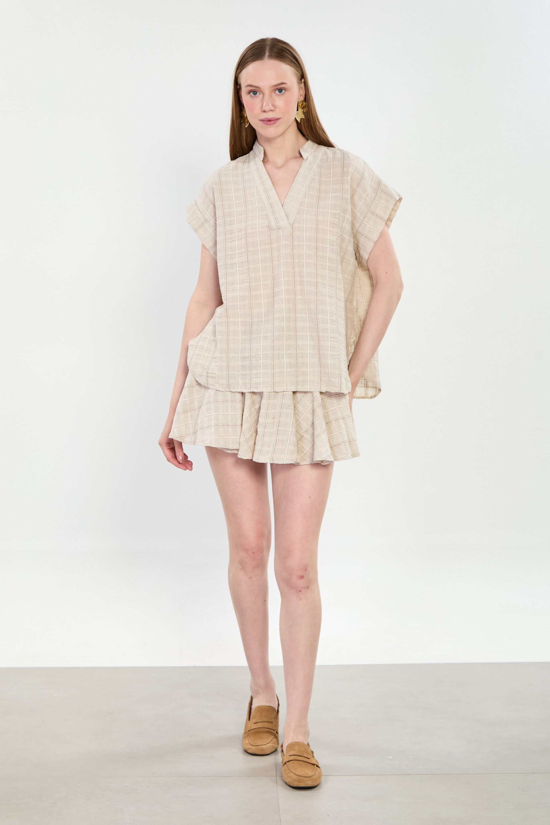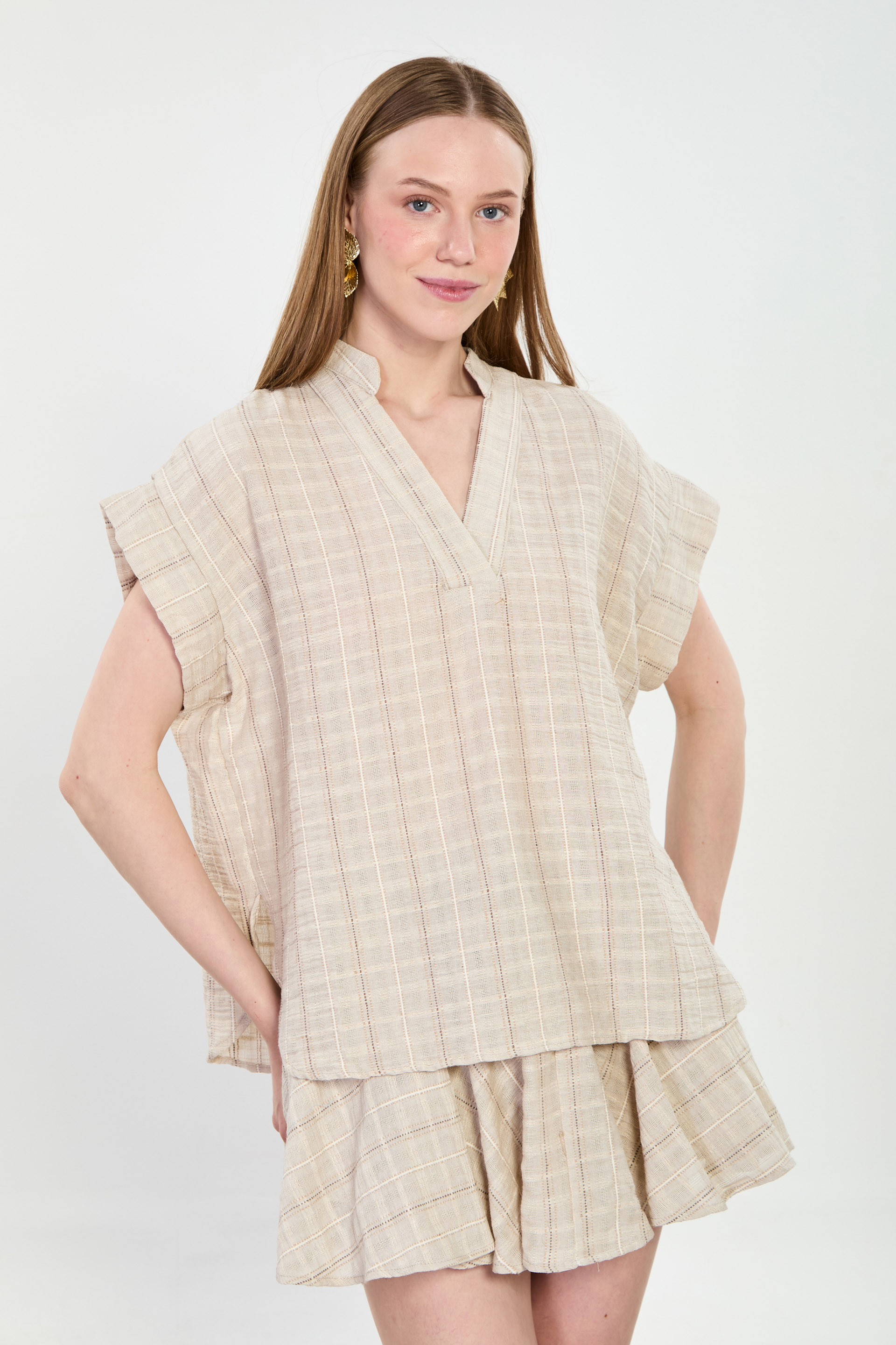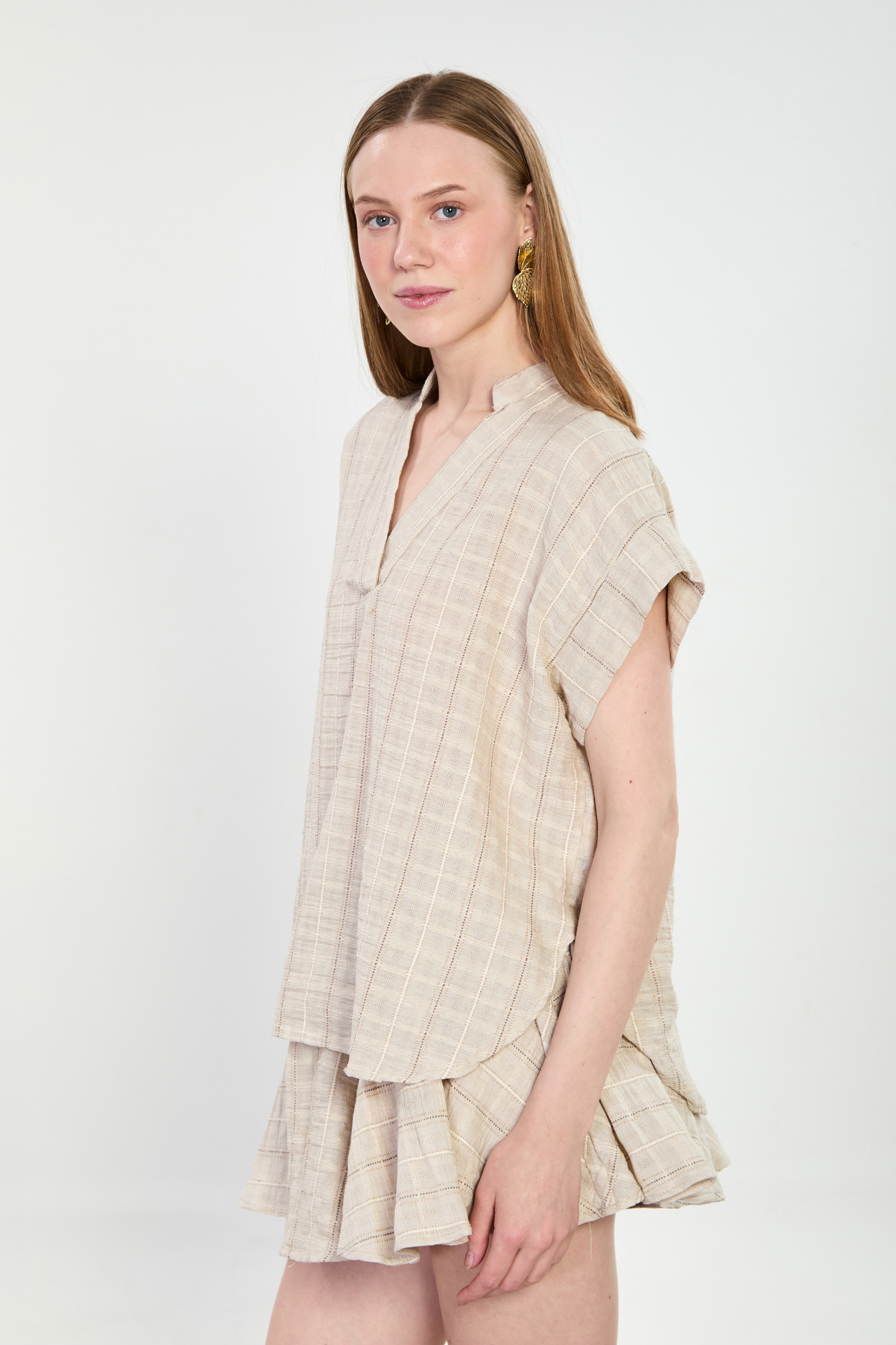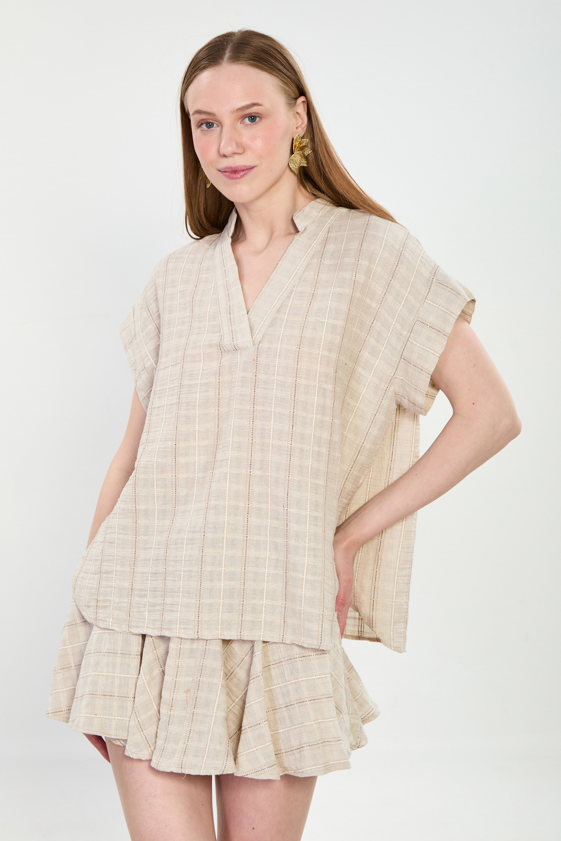 Kadın Çizgili V Yaka Kısa Kol Bluz - Taş